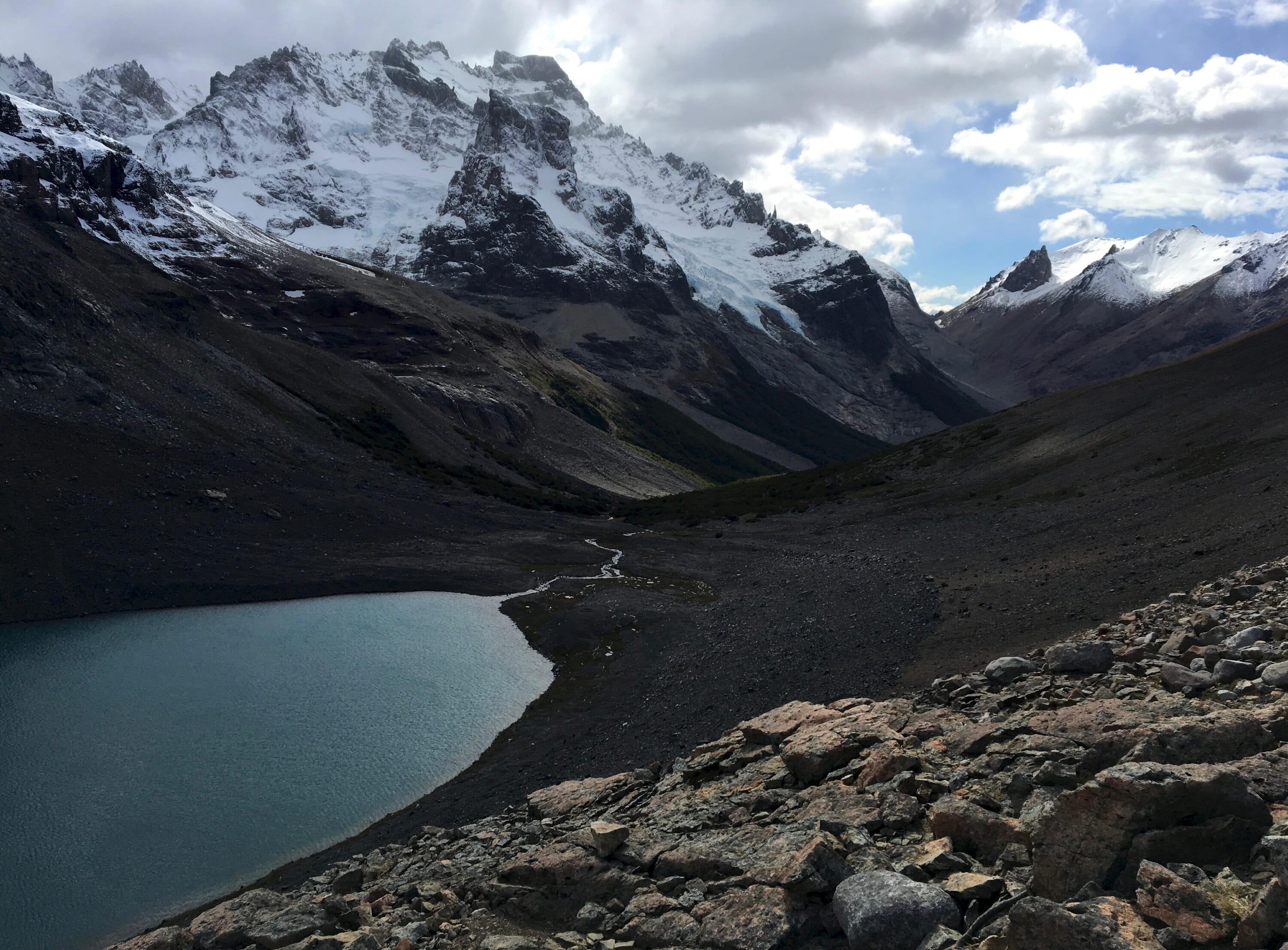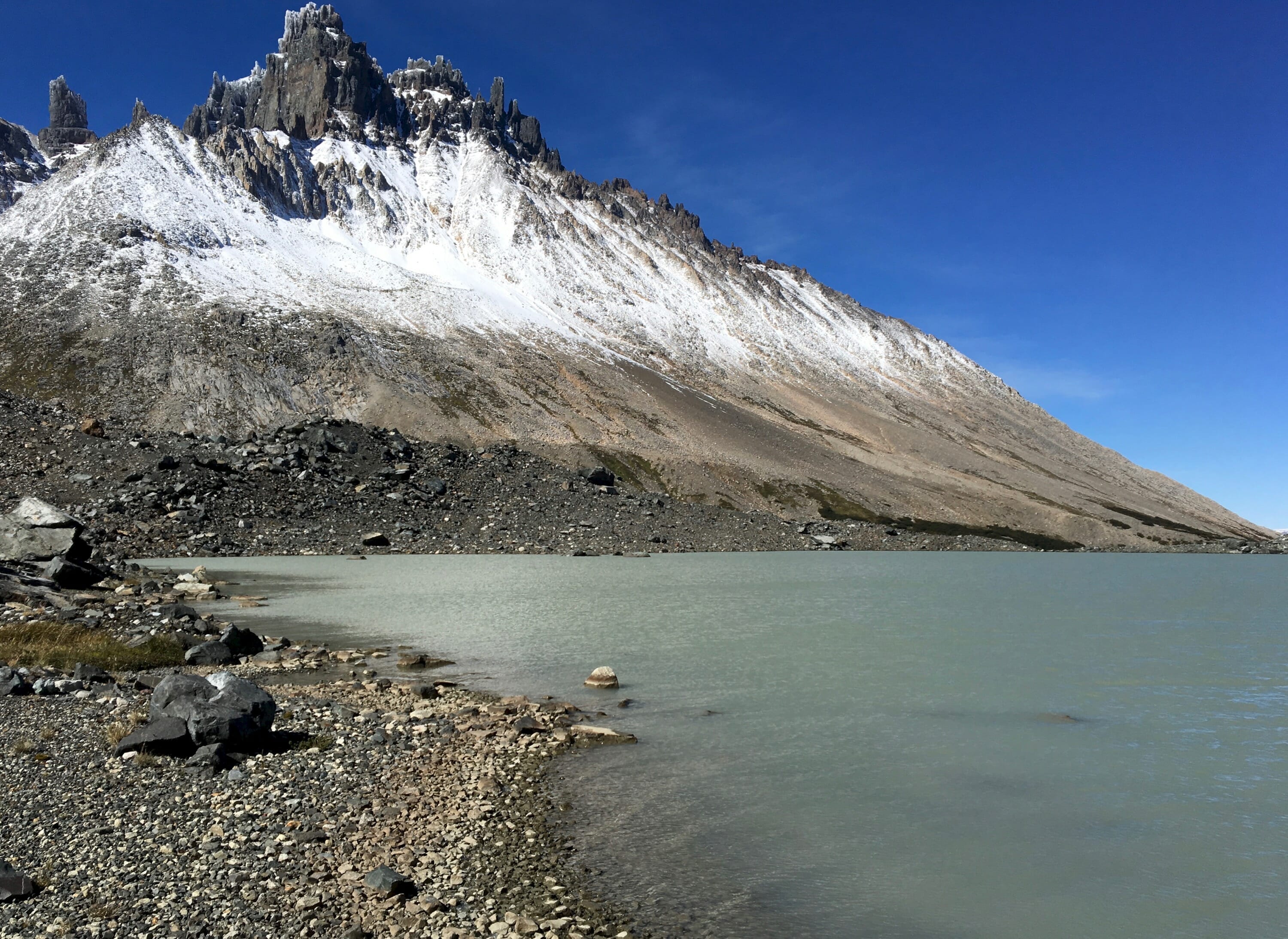 We hastily made breakfast to warm ourselves up a bit, and then we set our sights on exploring the picturesque valley north of the camp. Our first goal was to reach Laguna Duff, for which we followed a decent trail along the eastern side of the meadow that eventually ascends to the lake. We then climbed the glacial moraine beside the lake for the best photo vantage point, complete with stunning reflections from Cerro Palo and other surrounding peaks. After a quick snack, we backtracked a bit and detoured west toward the two unnamed tarns nearby (you will see these on a satellite map view). The wind picked up here, so there were no reflections in the tarns, but we did get a better view of the jagged peaks behind them.