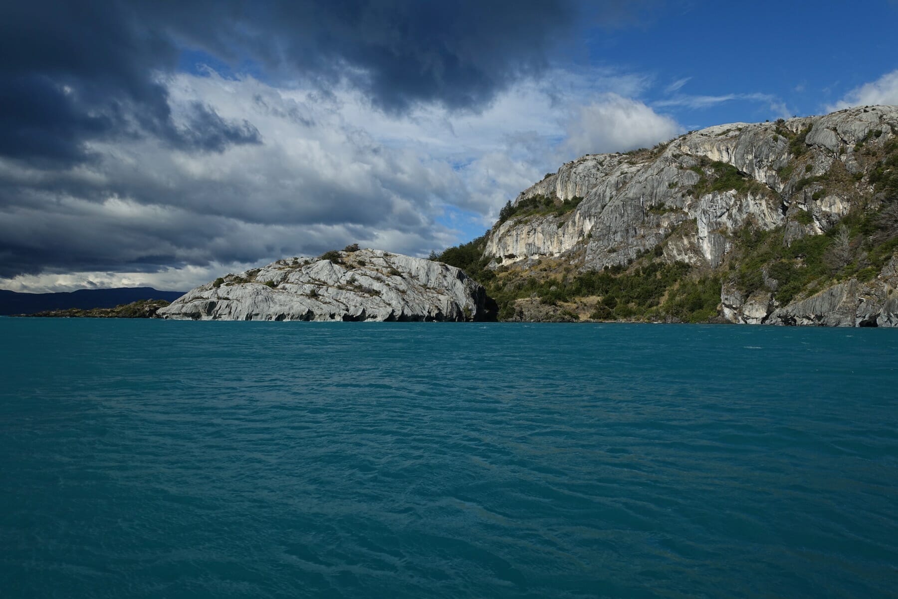 We soon had a group large enough to fill a small tour boat and departed from the nearby docks. The water was quite choppy at various points, so we had a rough ride across the lake. I was seated near the middle of the boat and managed to not get as wet as the others. At some point before reaching the marble caves, Sean tells me that the crew had to hastily (and discretely) expel water from the rear of the boat. I must have been engrossed with the scenery to miss that!