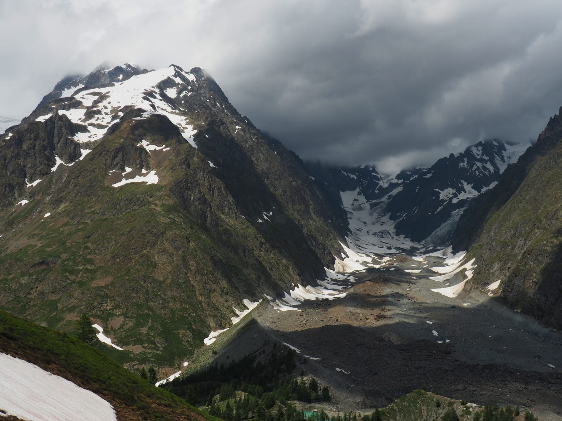At the foot of this hanging valley, the TMB began descending in earnest toward Cabane du Combal. From the descent, we caught glimpses of the turquoise colors of Lago di Miage.