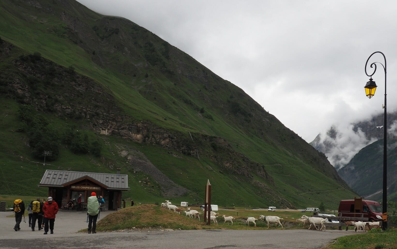 In the Valle des Glaciers, we were finally below the clouds. We stopped briefly in La Ville des Glaciers to watch Beaufort cheese production. This was also our decision point between the route through Les Chapieux and the steep route to Col des Fours and viewpoint at Tête Nord des Fours.