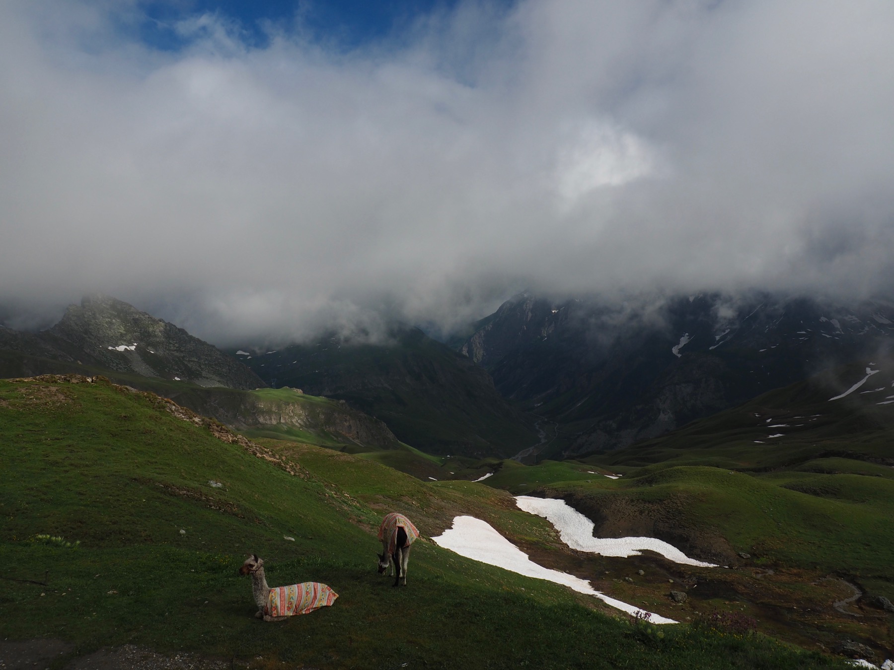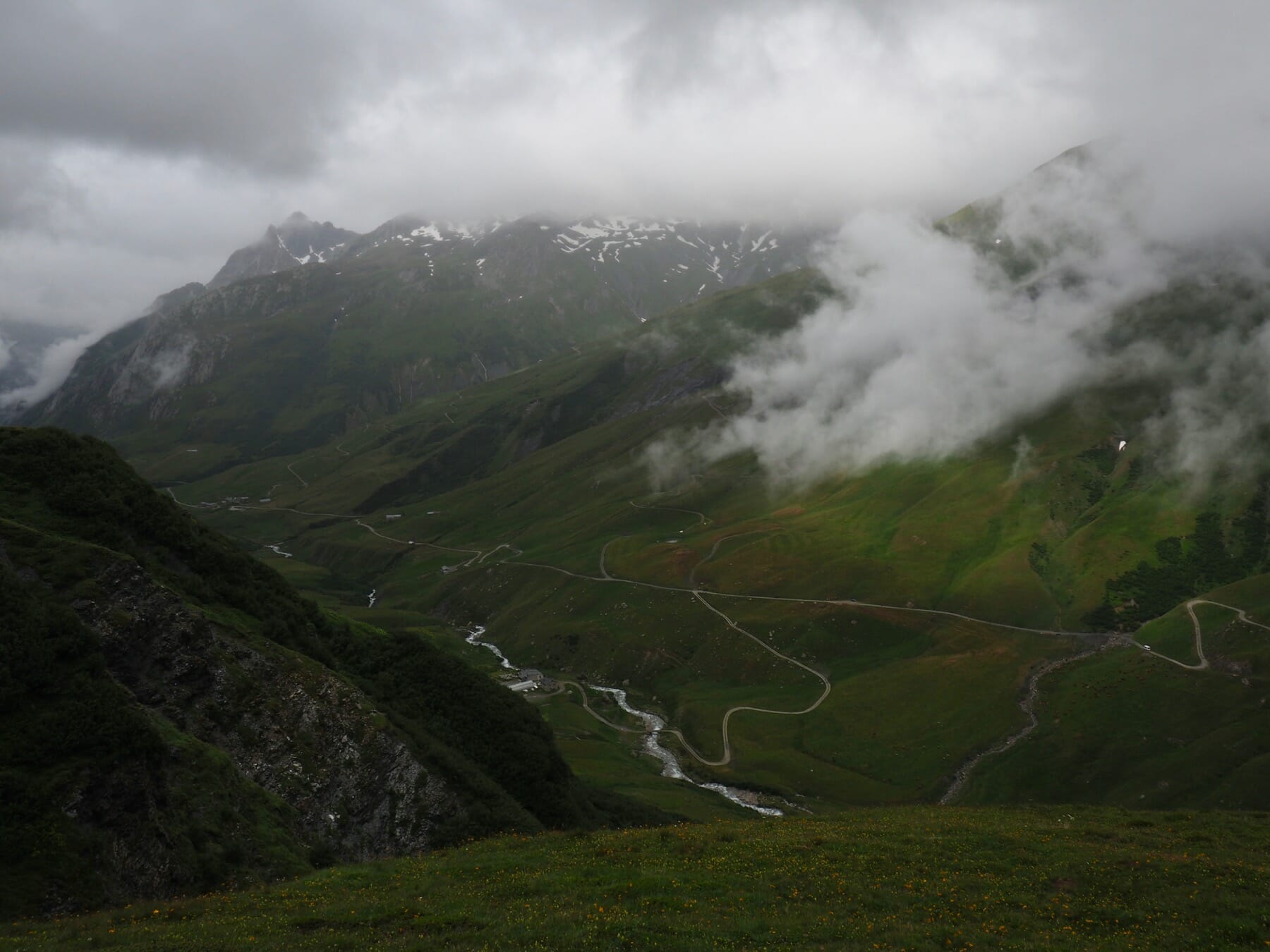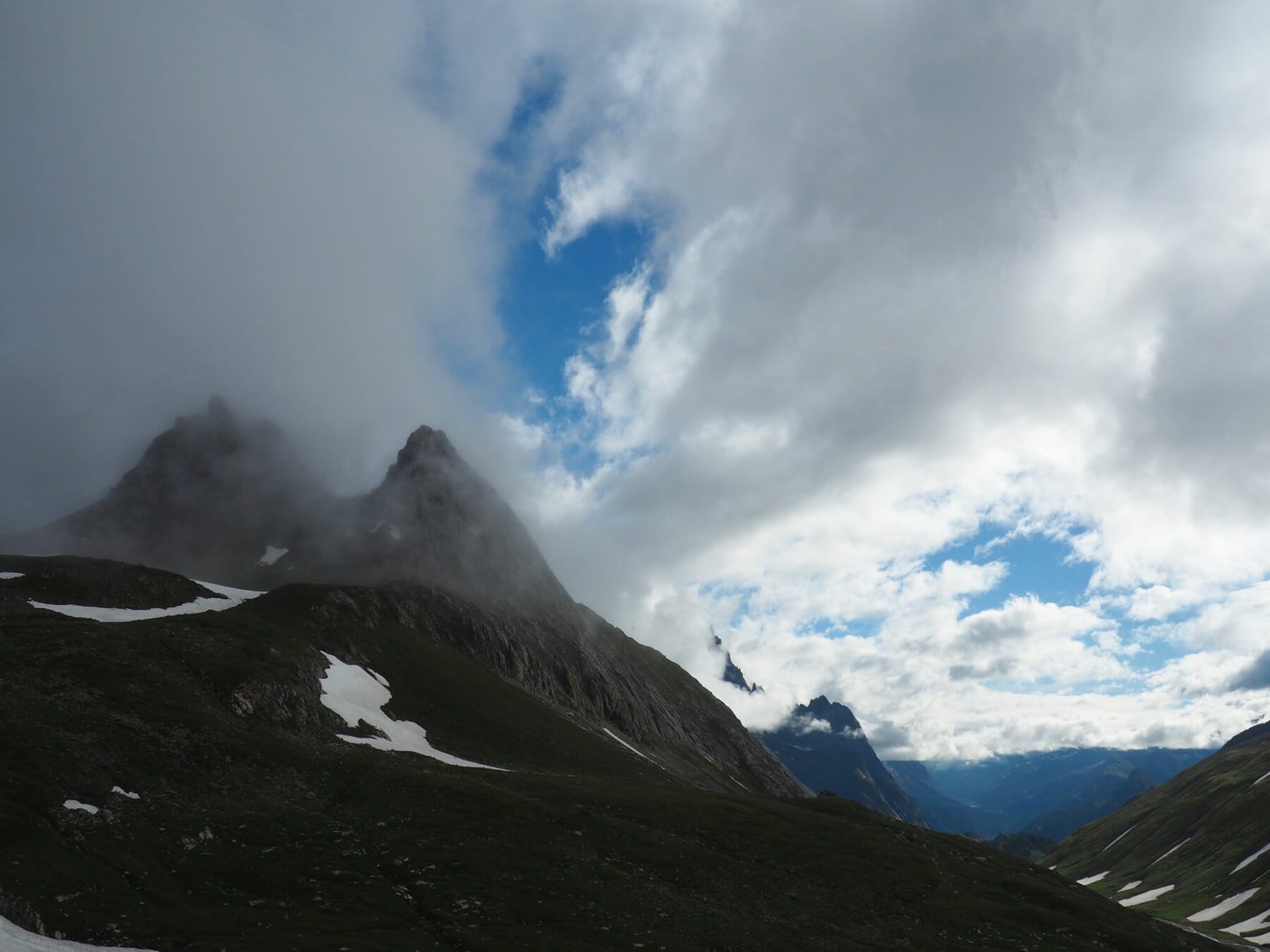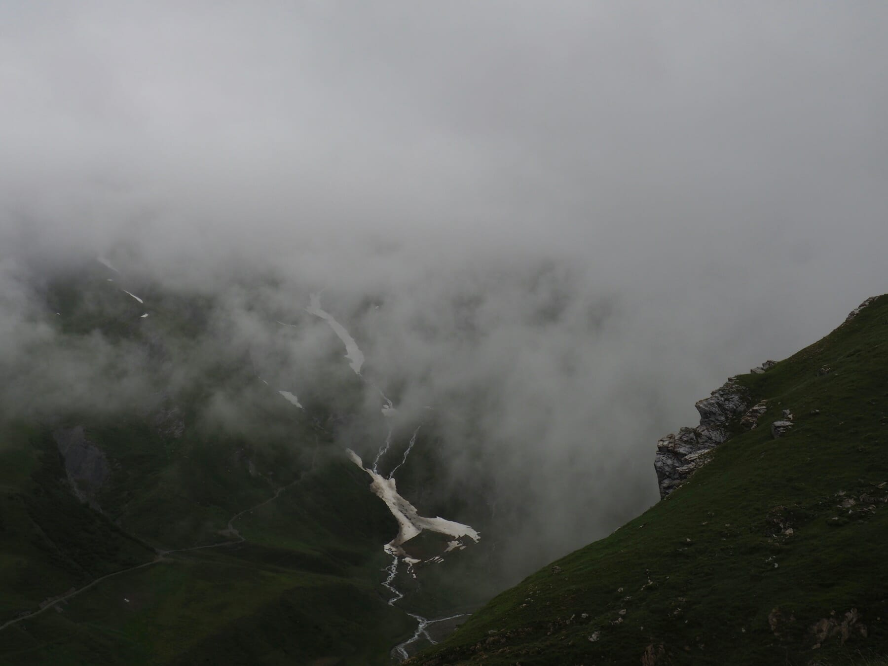 The weather on the other side was no better. We occasionally got small glimpses of surrounding peaks and valleys through small gaps in the clouds, but most of the descent from the col was in a world of grey.