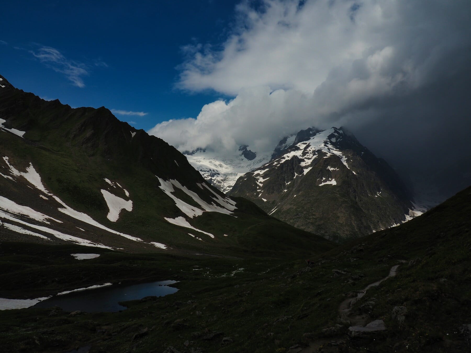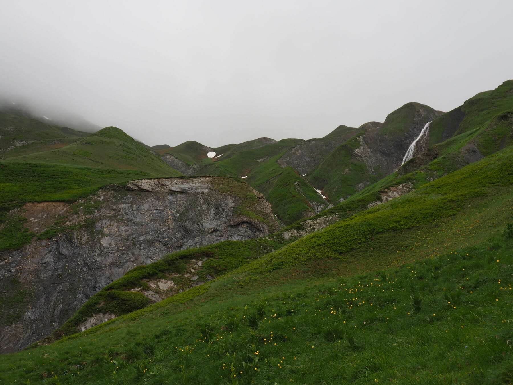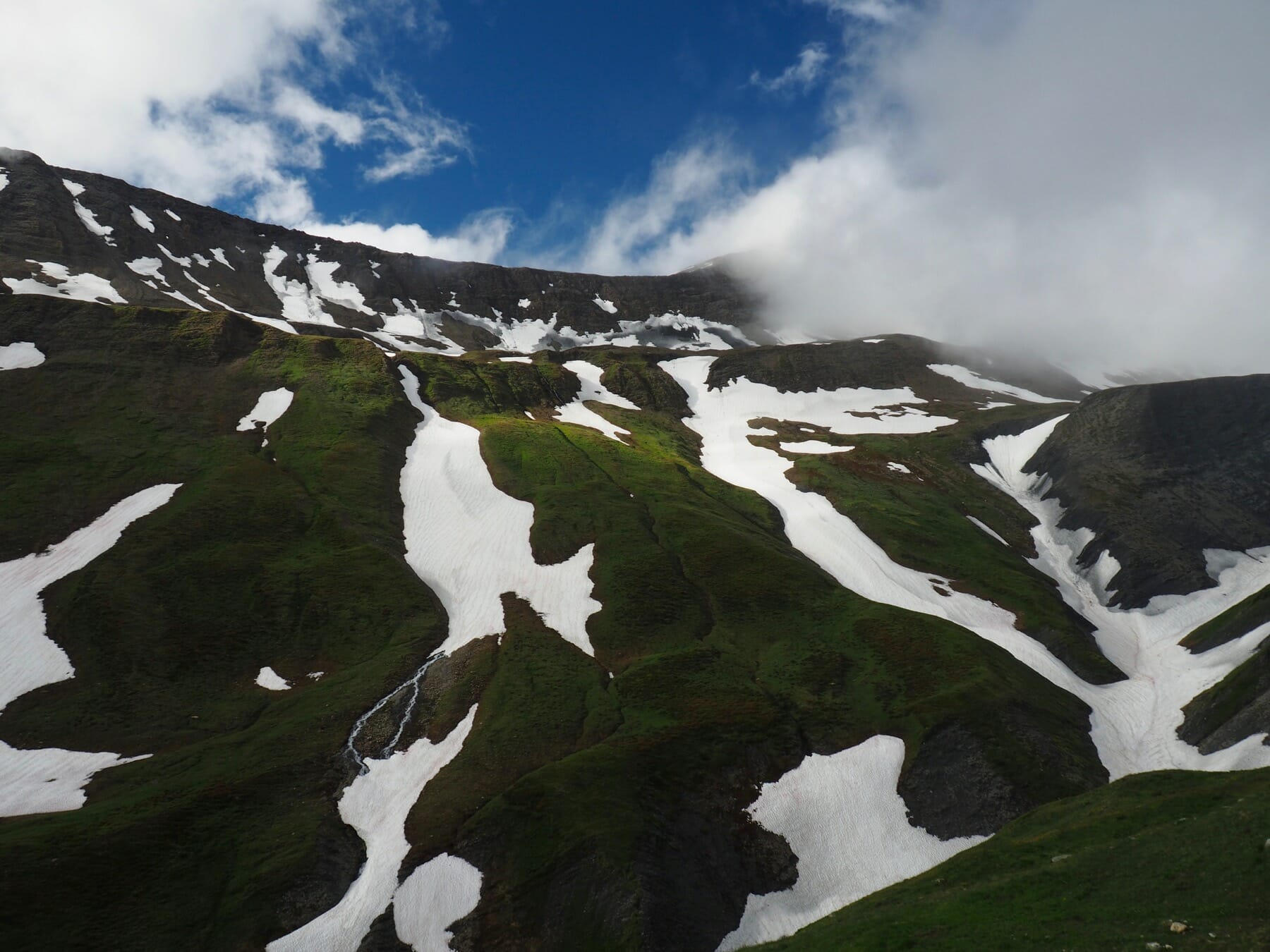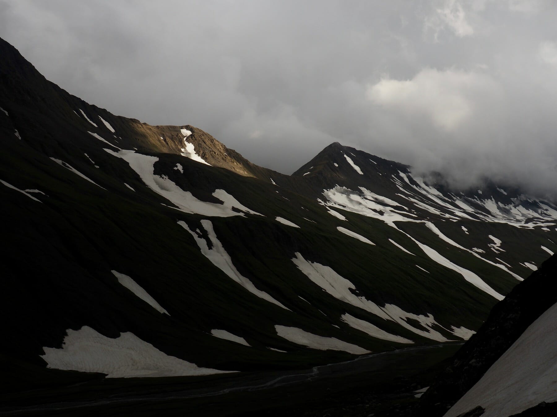 The weather on the other side was no better. We occasionally got small glimpses of surrounding peaks and valleys through small gaps in the clouds, but most of the descent from the col was in a world of grey.