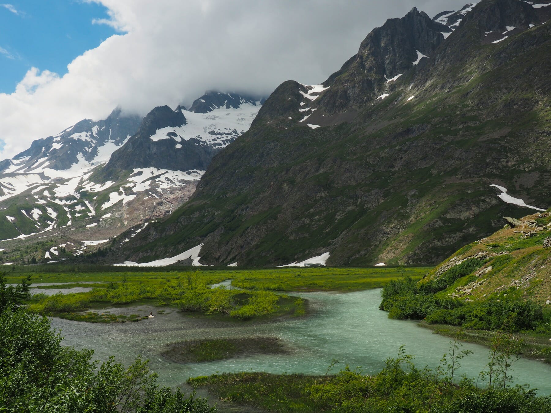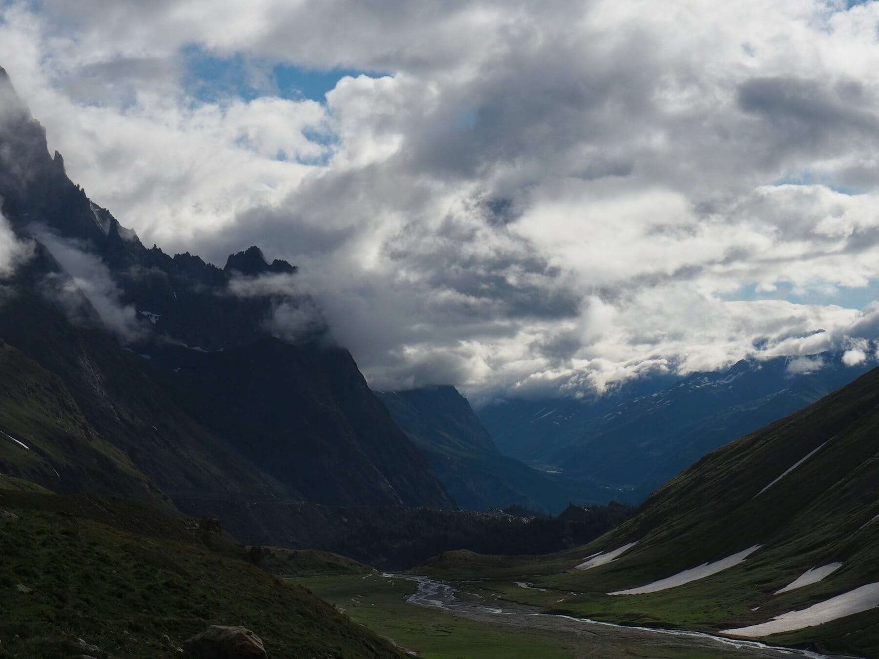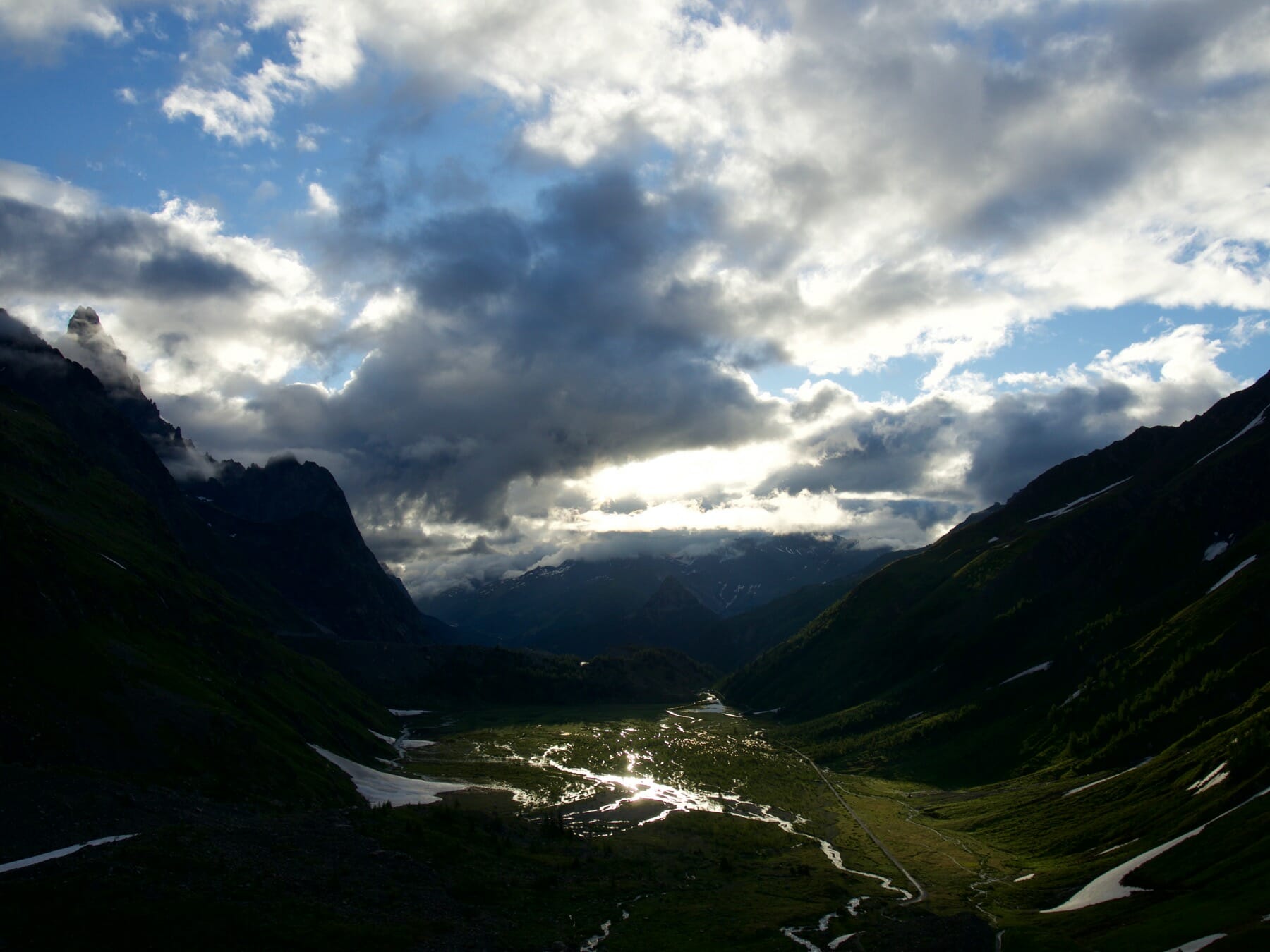 From Bonatti, we set out on another variant of the TMB. From the refuge, we followed the trail up a green valley. The skies started to clear, making for a spectacular combination of light and scenery. Marmots filled the valley; it seemed that one or more topped each boulder. The day’s detour would have been worth it just for this gorgeous, magical valley.