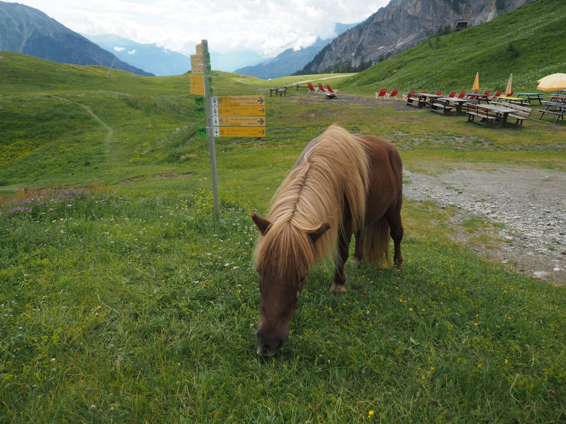 We continued past the various ski areas, pausing for a rest at Rifugio Maison Vieille. This refuge marked the end of the ski area. A few miniature ponies grazed outside the refuge. One suddenly went from gently nuzzling another hiker to snatching a baguette out of his pack.