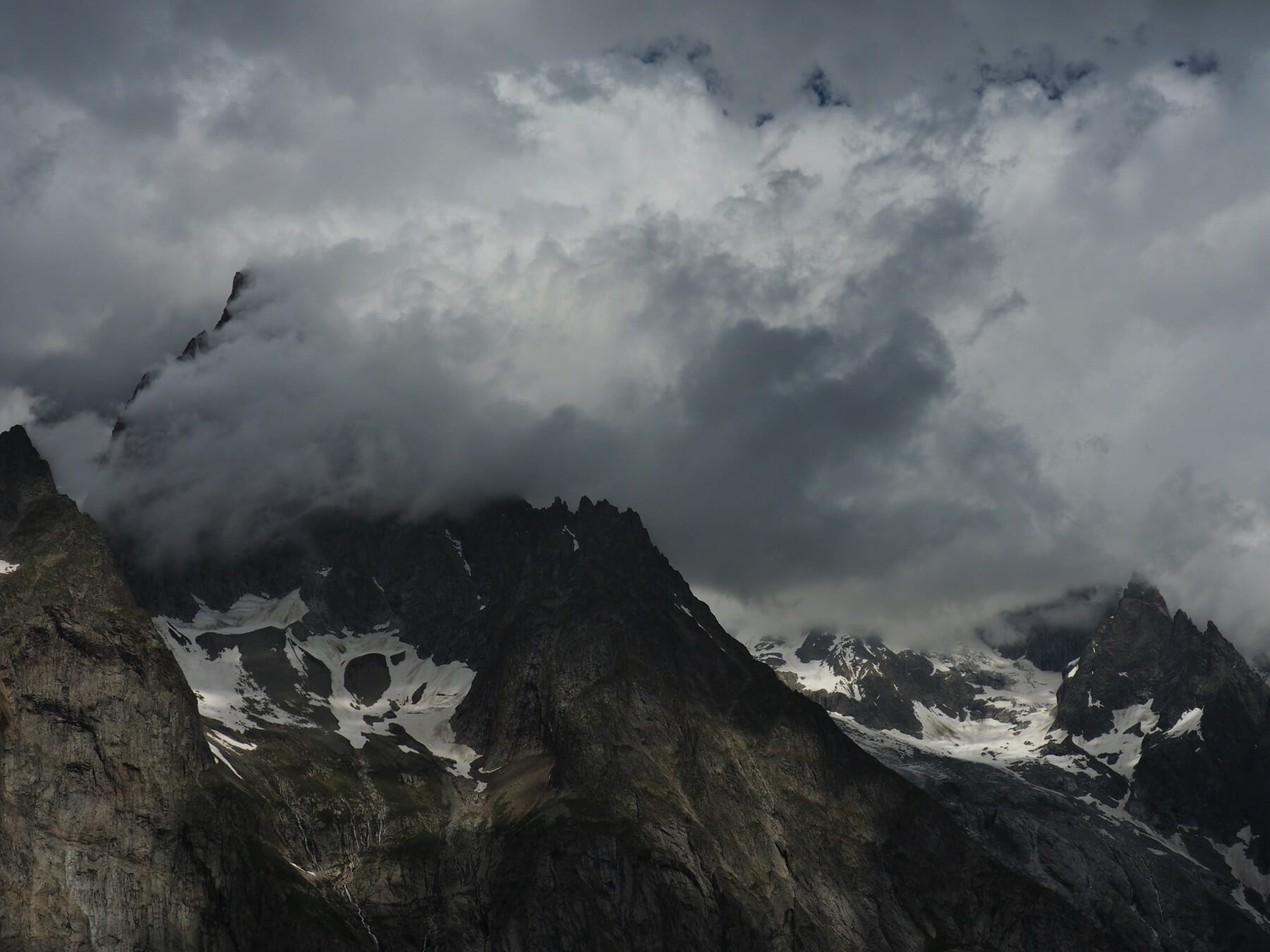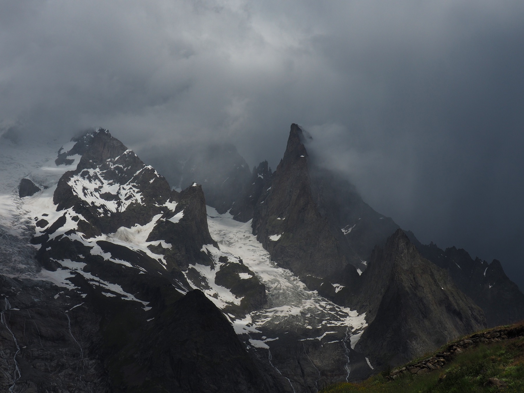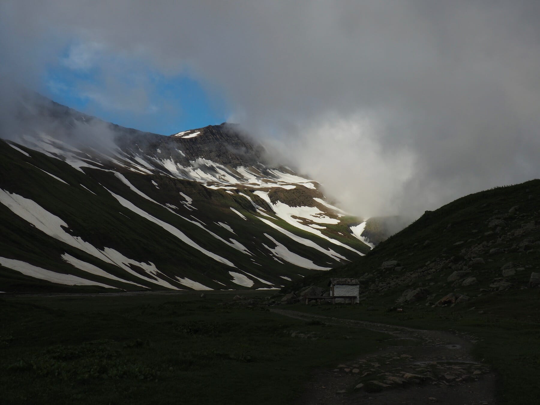 The TMB from Les Chapieux was steep, and much of the trail was a flowing stream. Along the way, we passed several junctions offering detours to interesting-sounding but cloud-obscured destinations. Stream-scultped slopes and cliffs made up the scenery near the trail, but even this was hard to see through rain and fogged-up glasses.