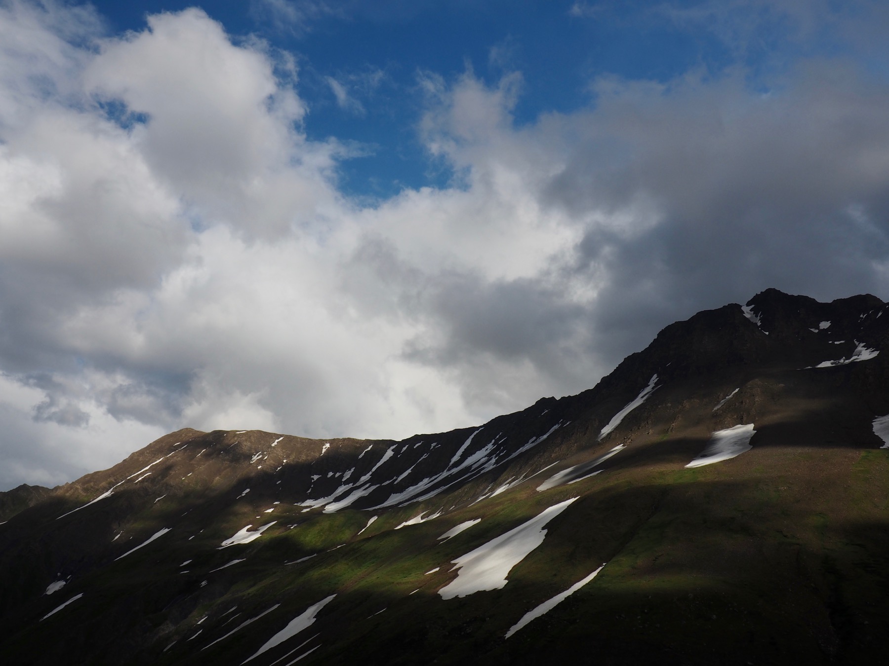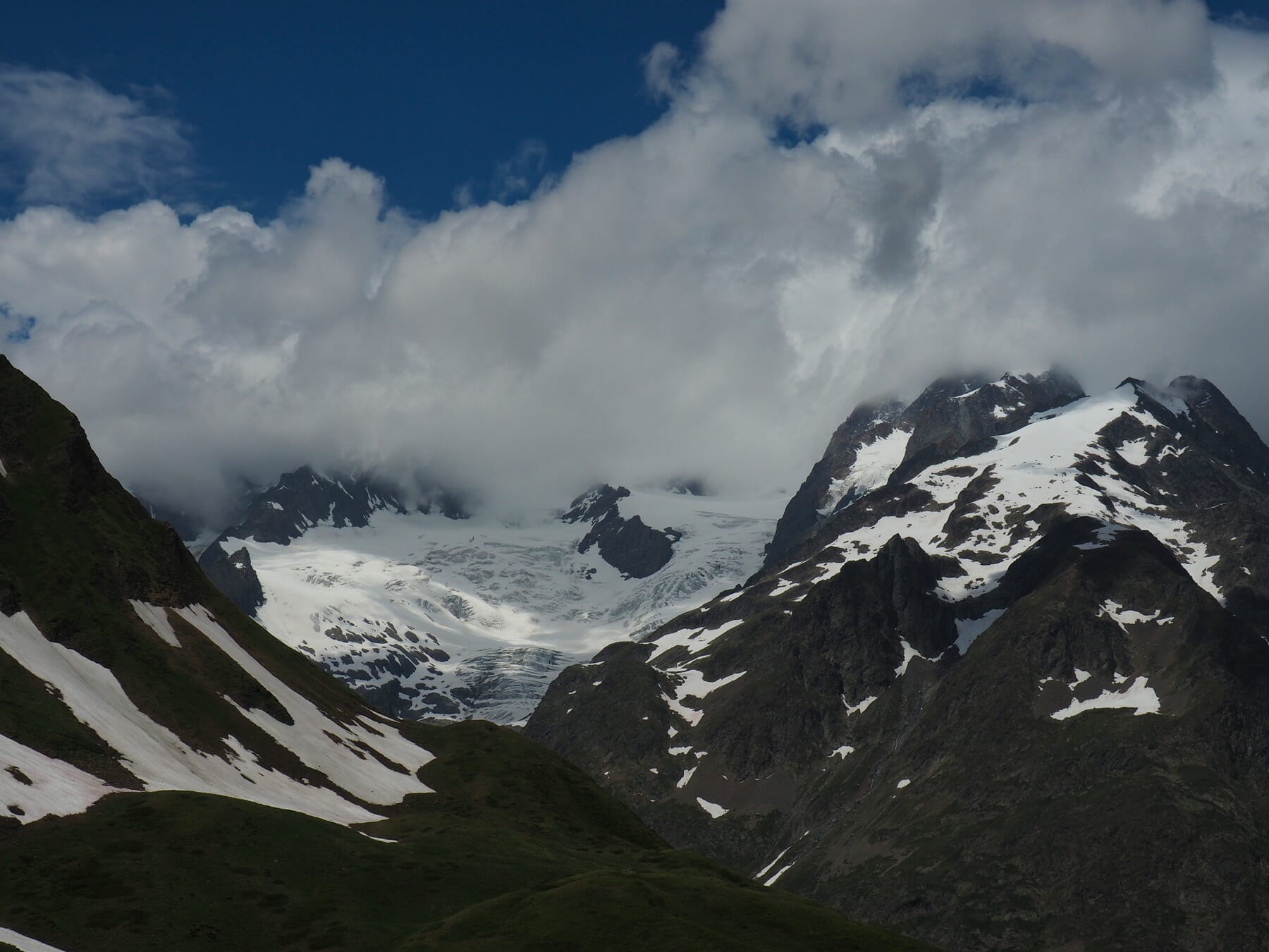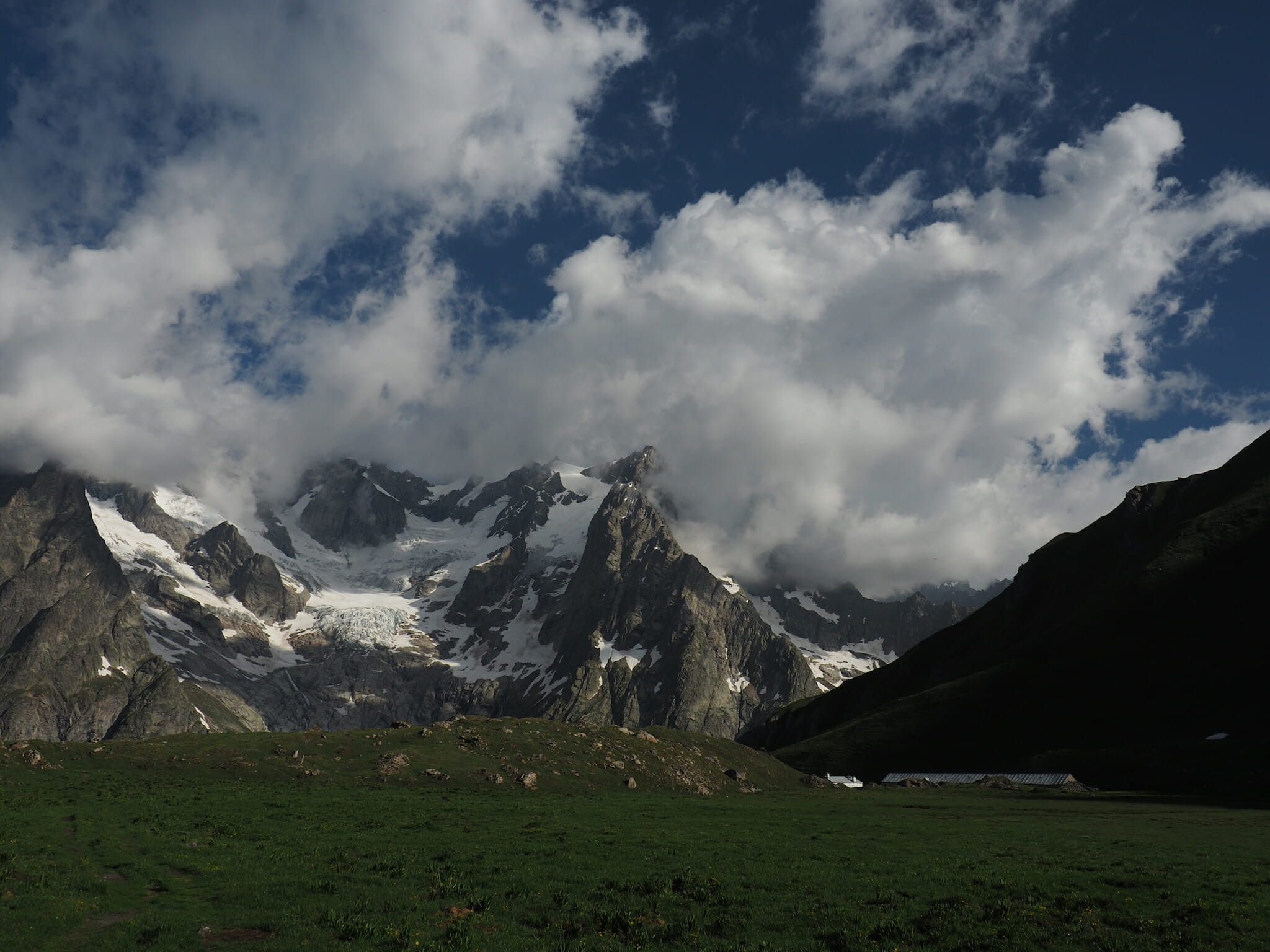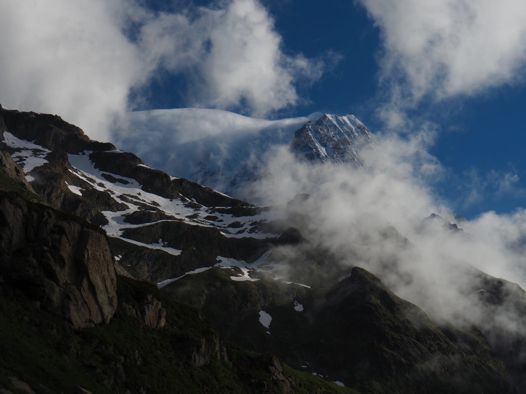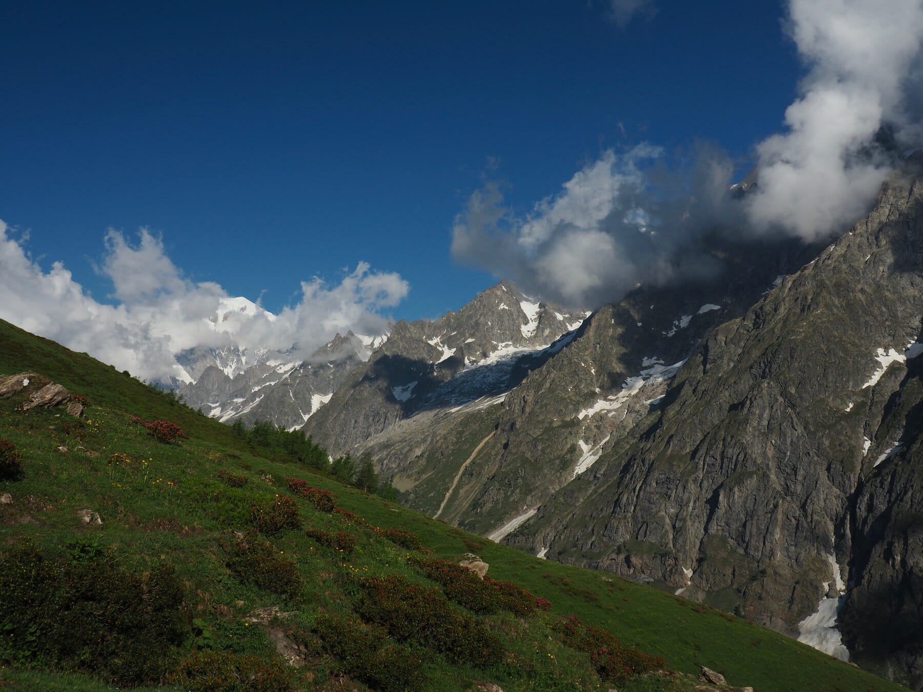 With a beautiful day, though, we could afford to wait out the clouds. Resting comfortably on the grass, we marveled at the views. We also worked our way though many of our snacks, including another apricot each, followed by the absinthe-filled chocolate bar we picked up in La Fouly. While the Mont Blanc massif never fully cleared, it instead offered us glimpses of various summits and glaciers as the clouds continued to shift.