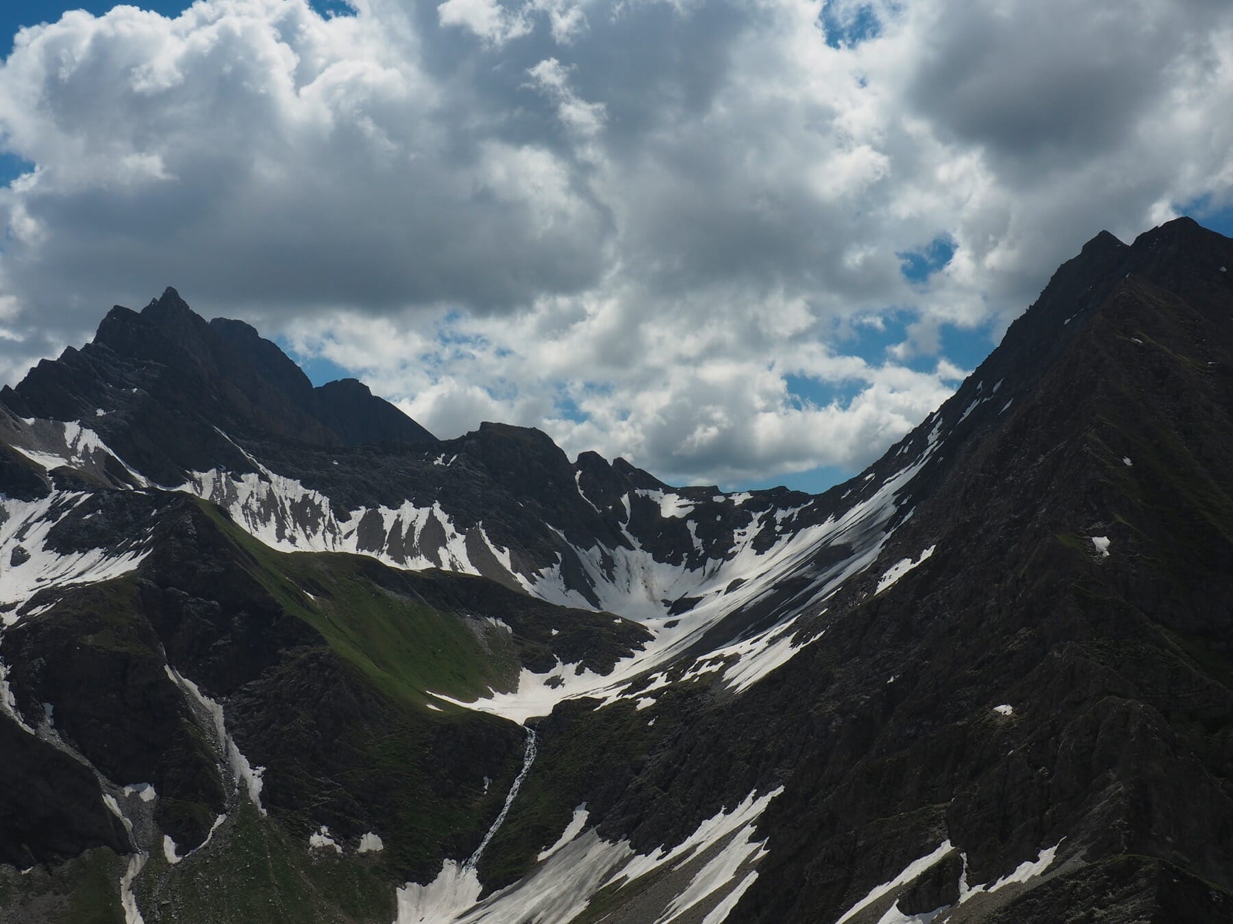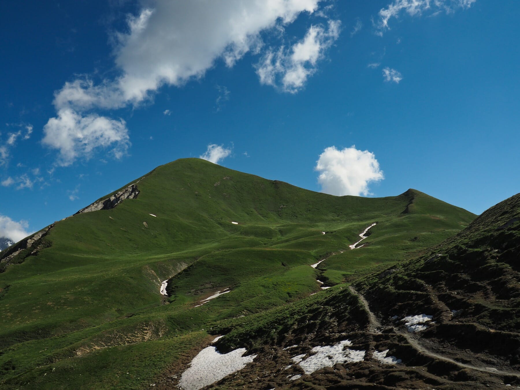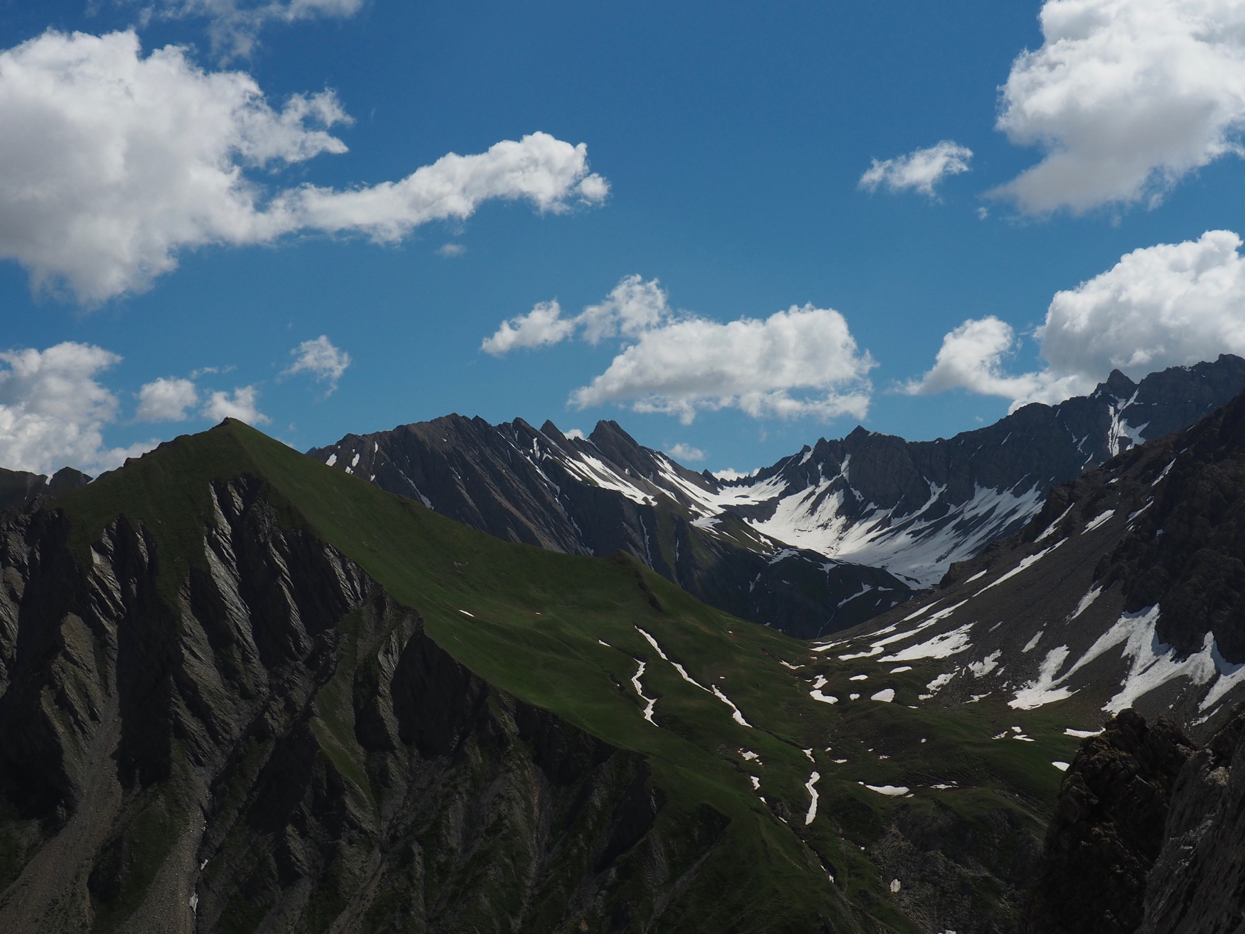 Eventually, we started to climb out of the valley. The TMB climbed steeply through a col, Pas-Entre-Deux-Sauts, and then descended steeply. In the next valley, we detoured slightly to avoid crossing streams on melting snow bridges. We then climbed steeply up out of the valley to the next col, Col Sapin. At the col, we turned right and climbed steeply up a ridge.