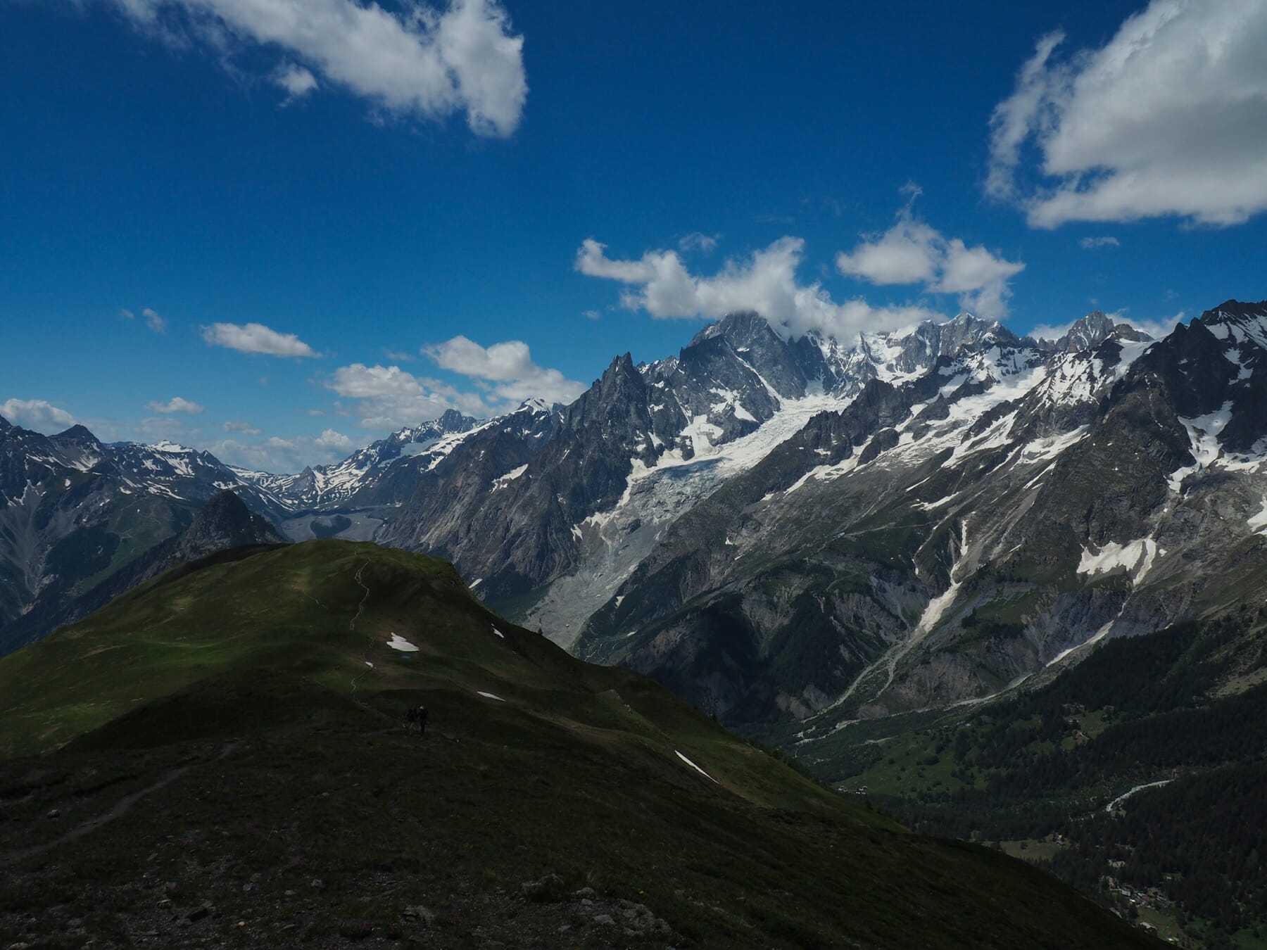 After more than an hour, we decided we should be on our way, so that we’d have time to wash clothes and have a leisurely dinner in Courmayeur. We leisurely followed the Mont de la Saxe ridge, pausing often to take in subtle changes in the view. Eventually, we reached the edge of the ridge. Here, we rejoined the main TMB and descended steeply.