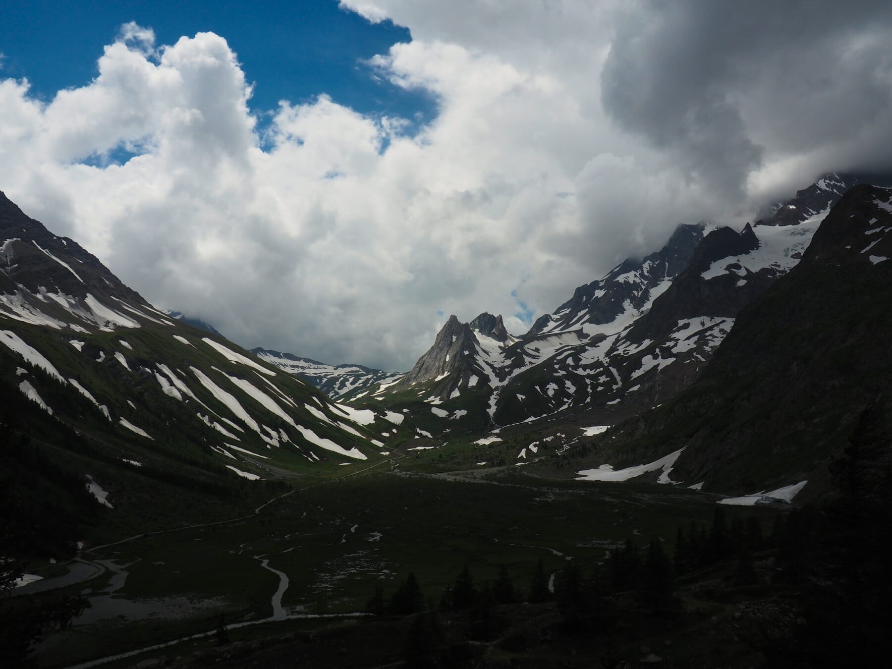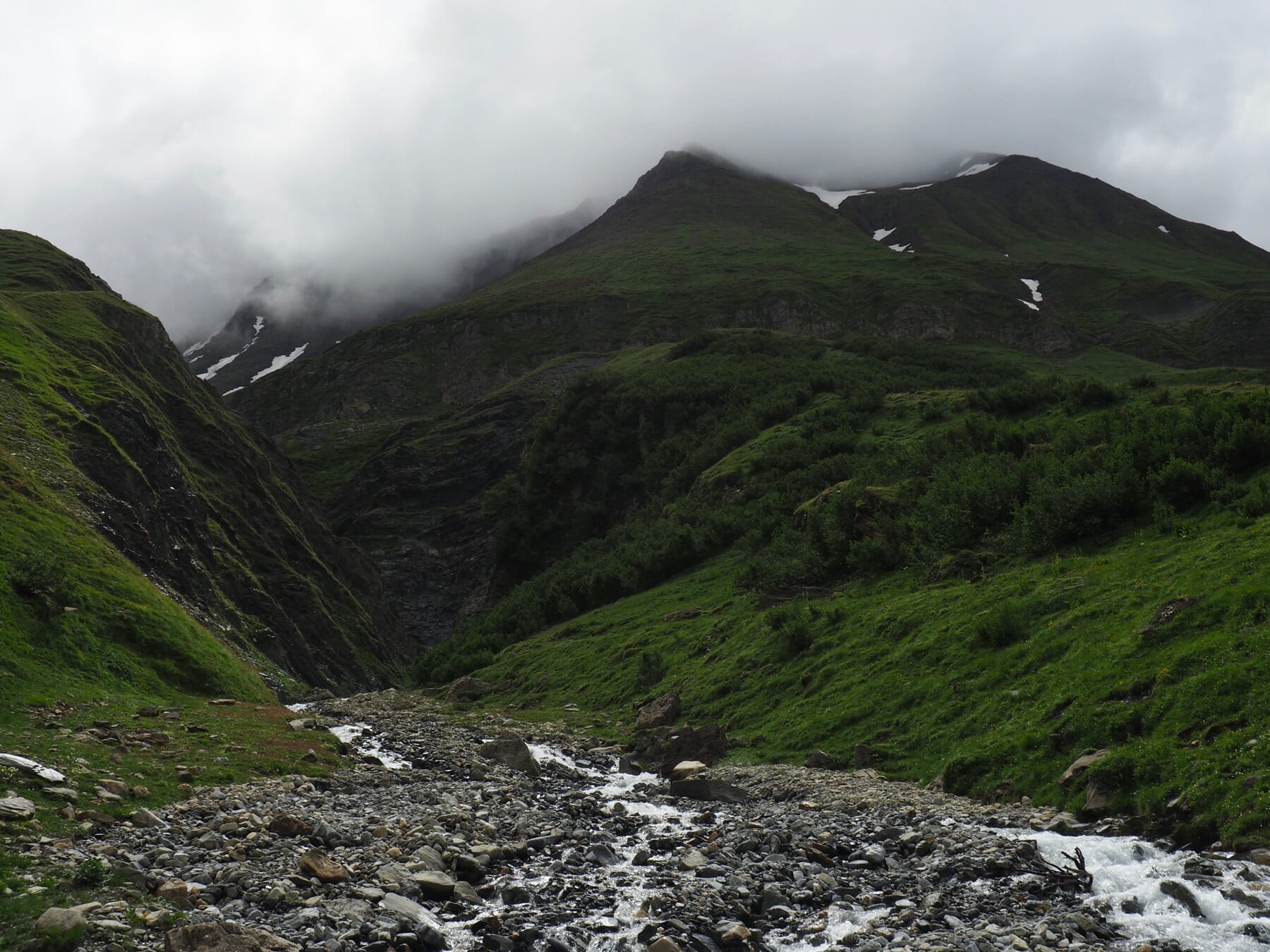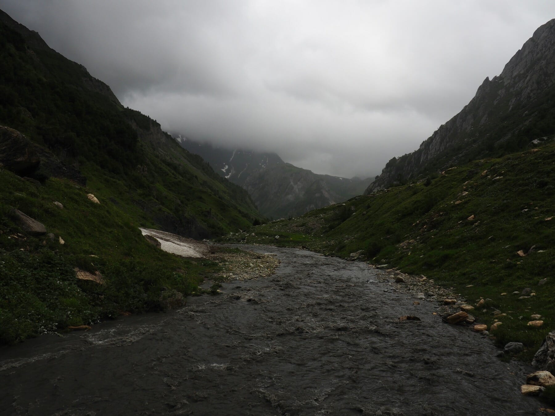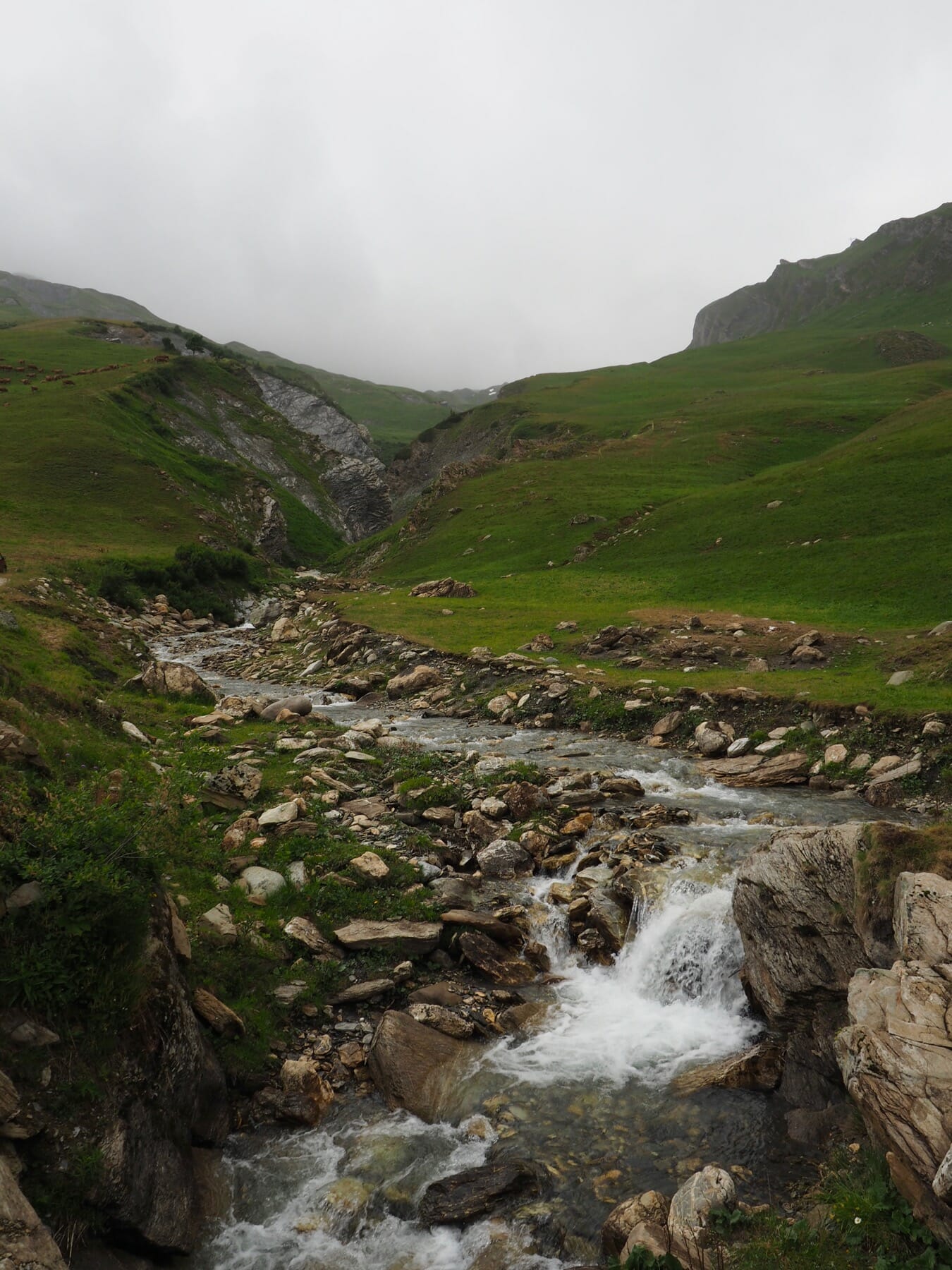 With the thick clouds and rain, this wasn’t really a choice. There was no point in heading to Tête Nord des Fours. So, we continued down the valley toward Les Chapieux. Most of this stretch was a pretty riverside walk, even with the clouds hiding the higher peaks.