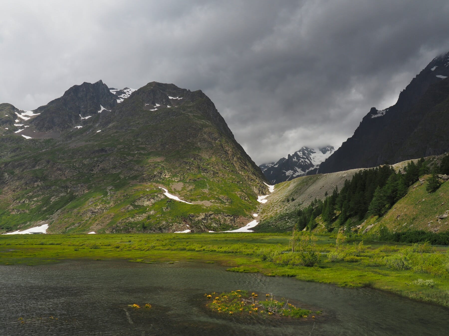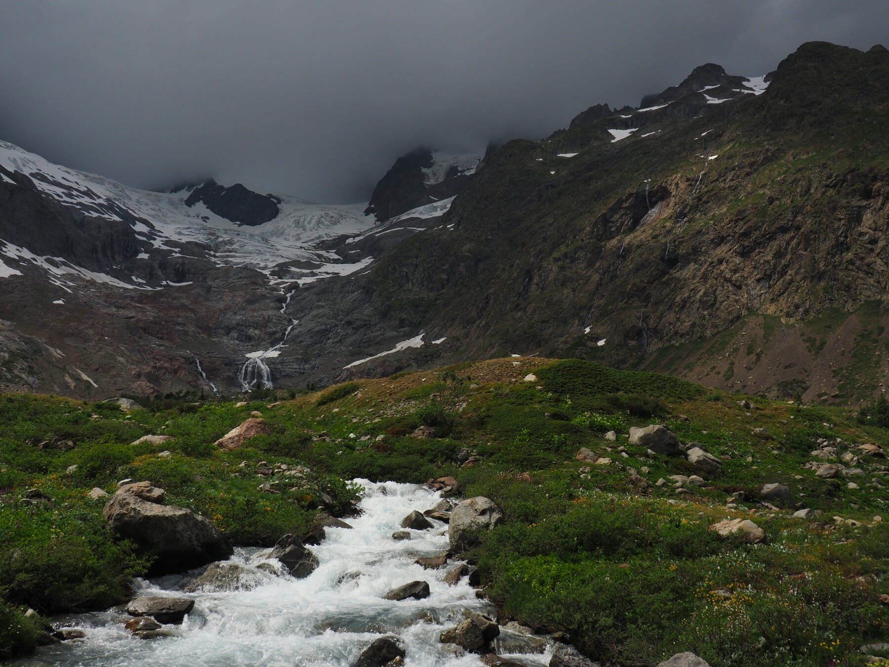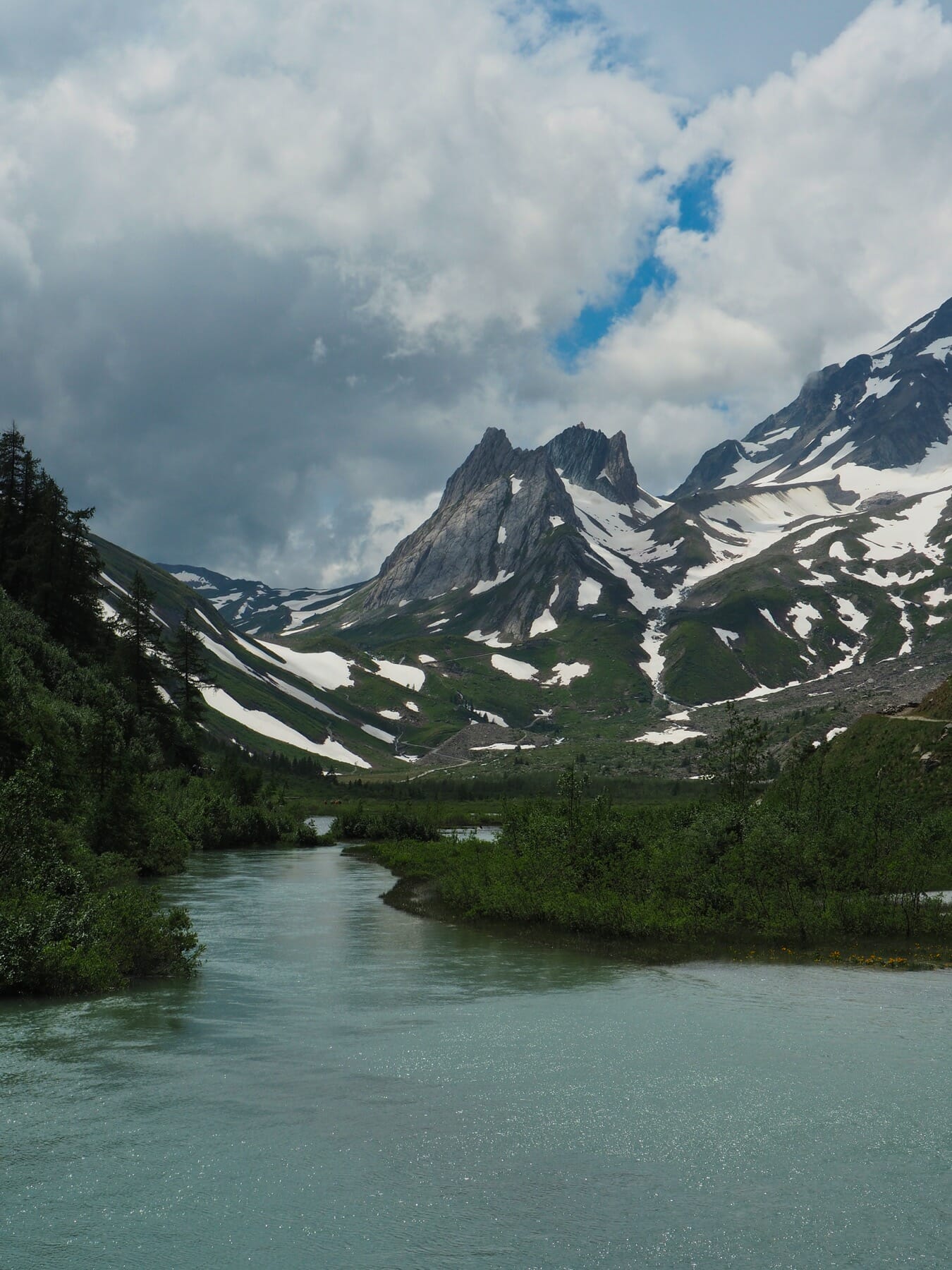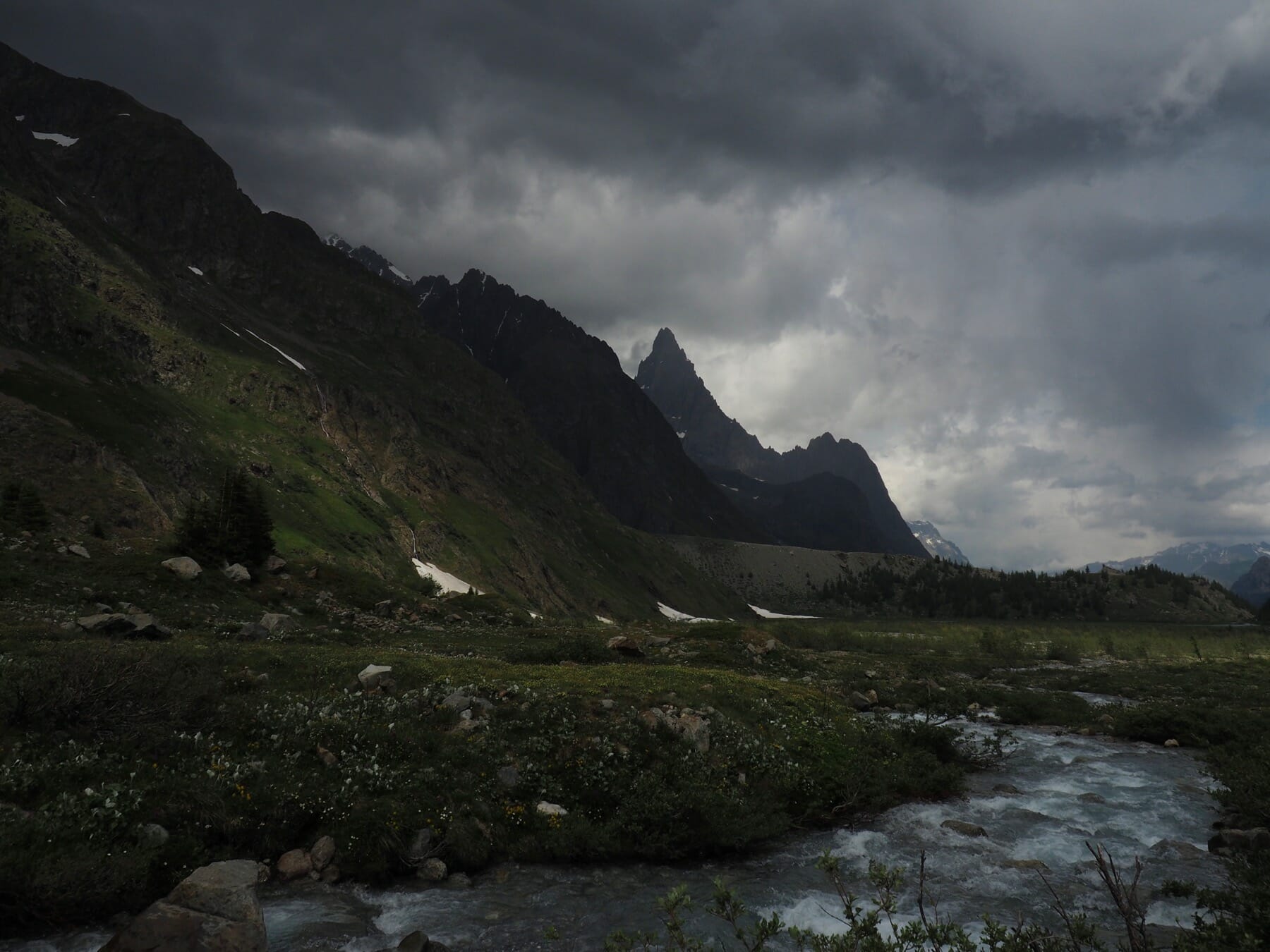 With the thick clouds and rain, this wasn’t really a choice. There was no point in heading to Tête Nord des Fours. So, we continued down the valley toward Les Chapieux. Most of this stretch was a pretty riverside walk, even with the clouds hiding the higher peaks.