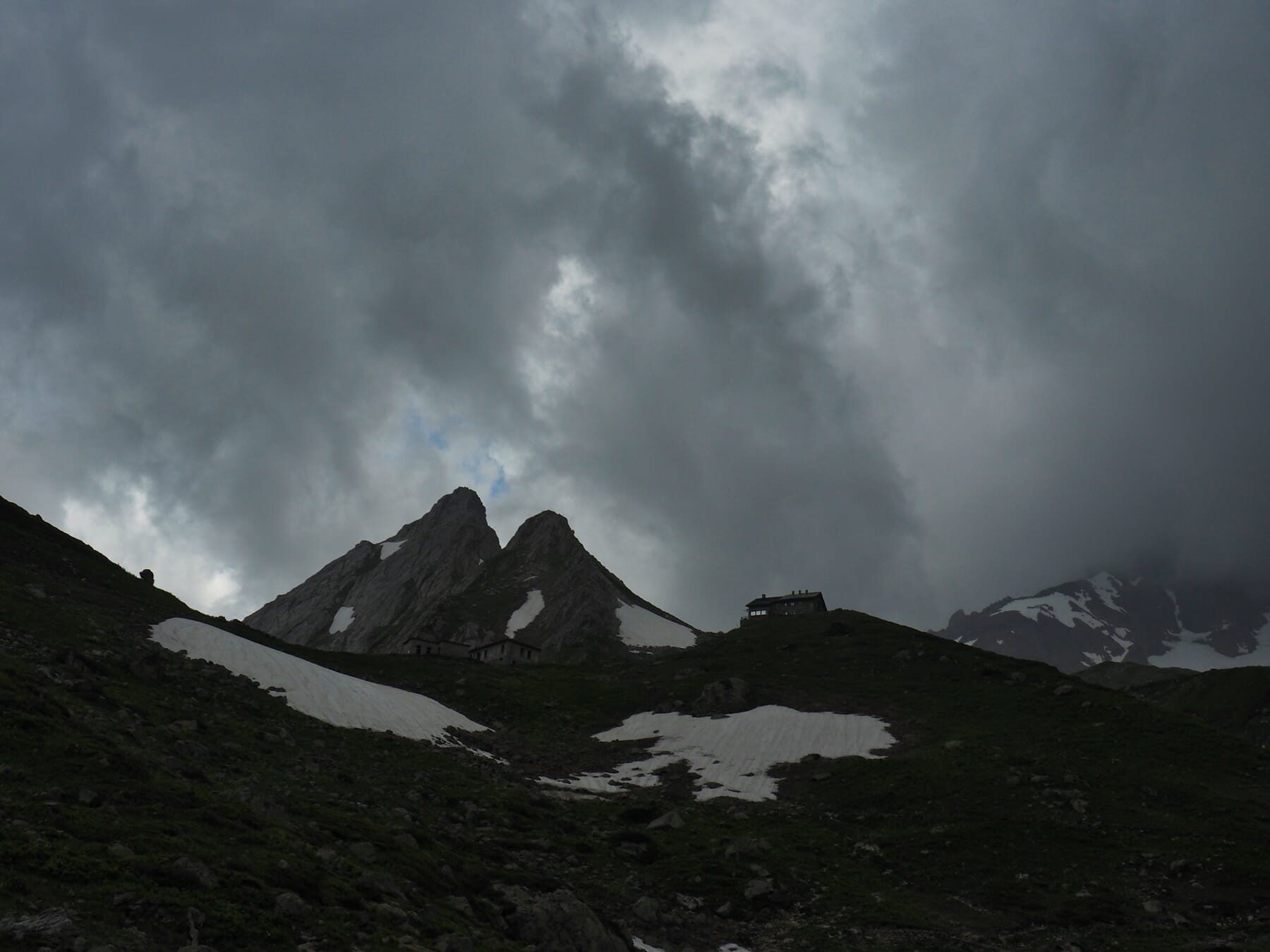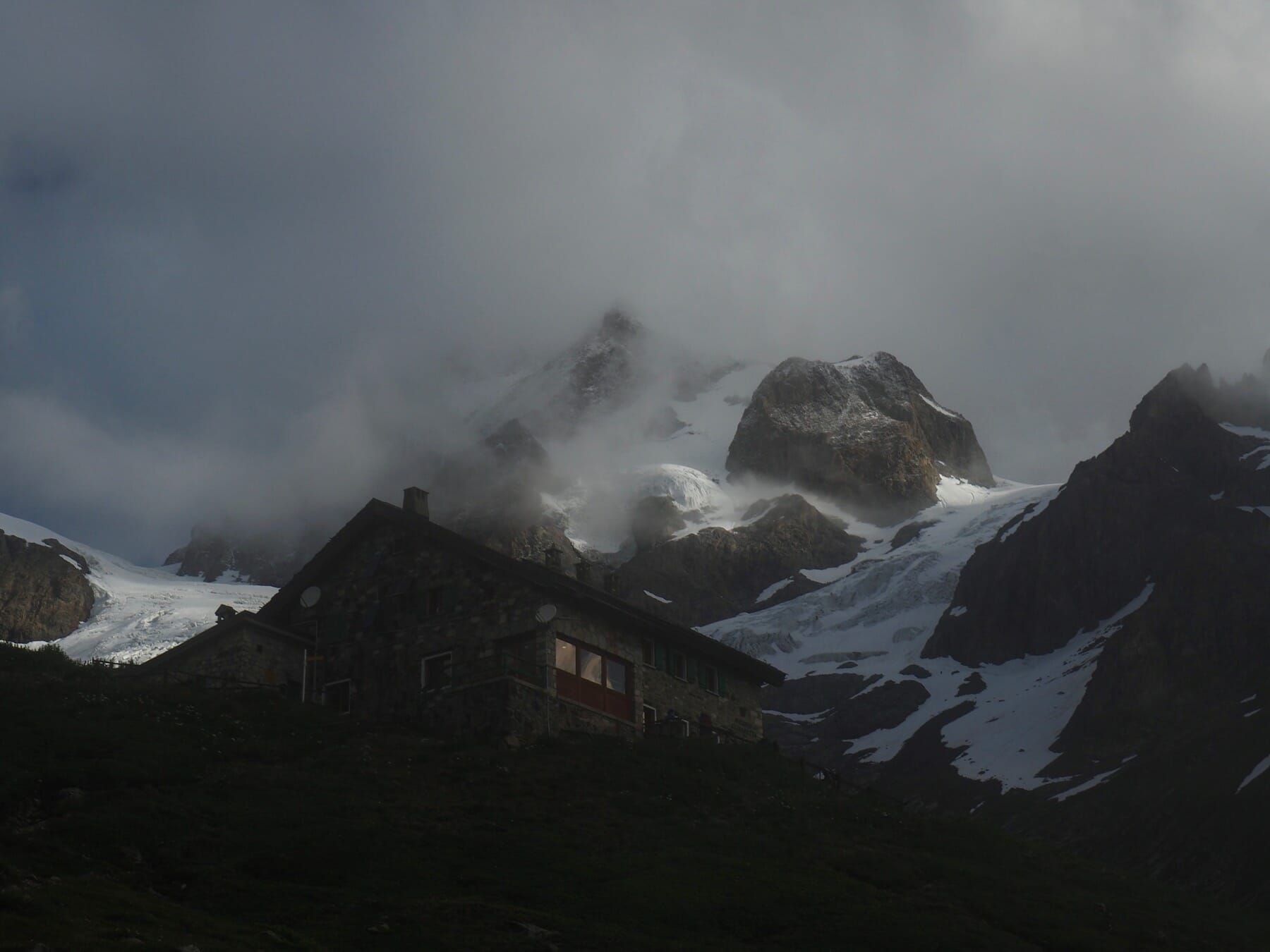 From Rifugio Bonatti, we followed a variant of the TMB over Mont de la Saxe and then down into Courmayeur. We hiked back up out of Courmayeur on a stormy morning, reaching Rifugio Elisabetta under broken clouds. Clouds and rain obscured the views for our hike from Elisabetta to Croix du Bonhomme.