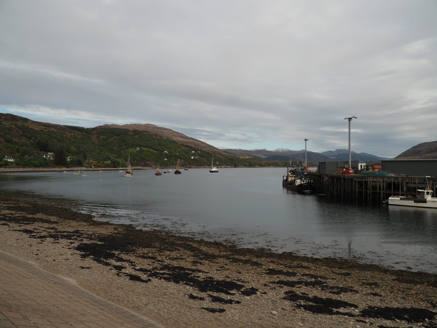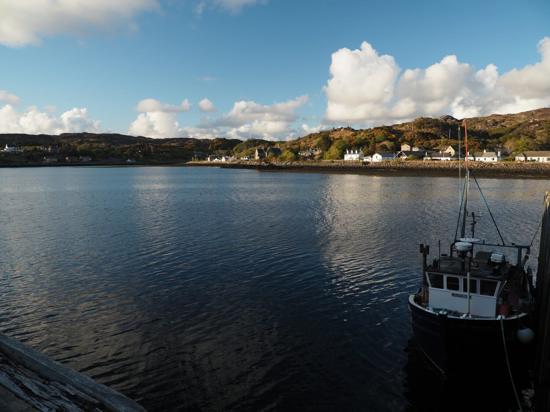 - Harbour House, Ullapool (Booking.com). This was sort of an odd bed and breakfast, but we really liked it. Larger than most, the layout felt more like a hotel. We were greeted with a choice of whisky or sherry and shortbread. The room was well-appointed and comfortable. They had many good choices for a delicious breakfast, though it got a little slowed down as everyone decided to eat at the same time. The bed and breakfast also had a large lounge and outside area backing up to Loch Broom. A five to ten minute walk brought us to downtown Ullapool.