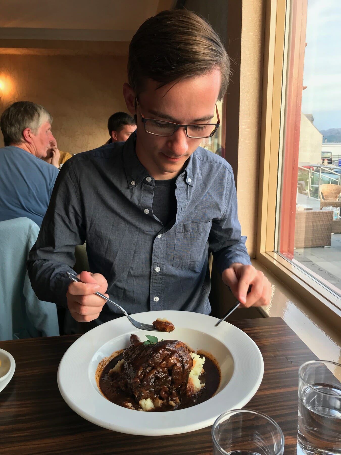 At check-in, we decided to eat at the hotel to make for a convenient evening. We then settled in our room and wandered the hotel grounds, including a dock running into the loch, a small bar, and a lounge. For dinner, Kyle had a steak pie topped with puff pastry; Sean had lamb in a mint sauce. Each was fine, and service was fast. None of the desserts grabbed us.