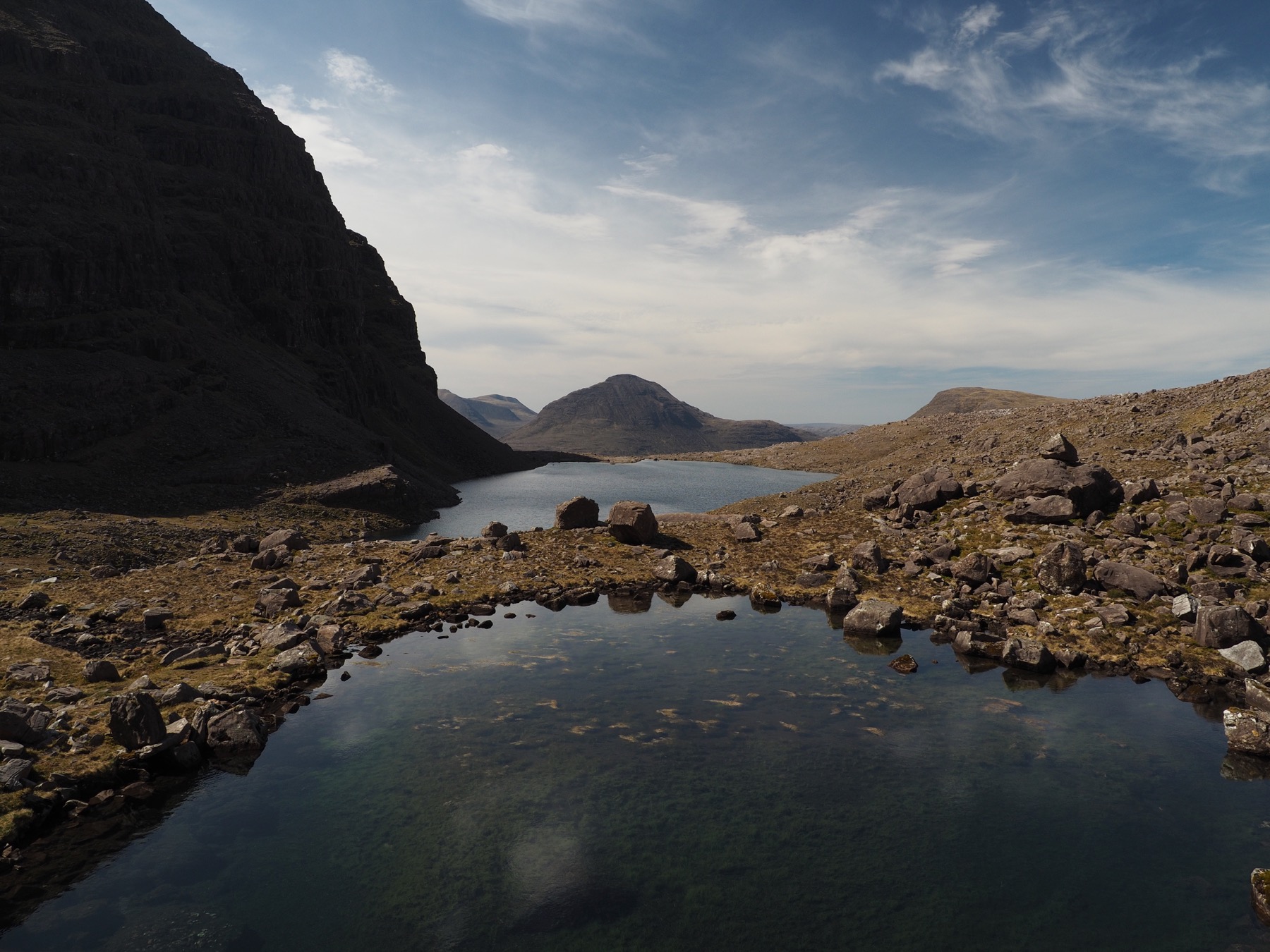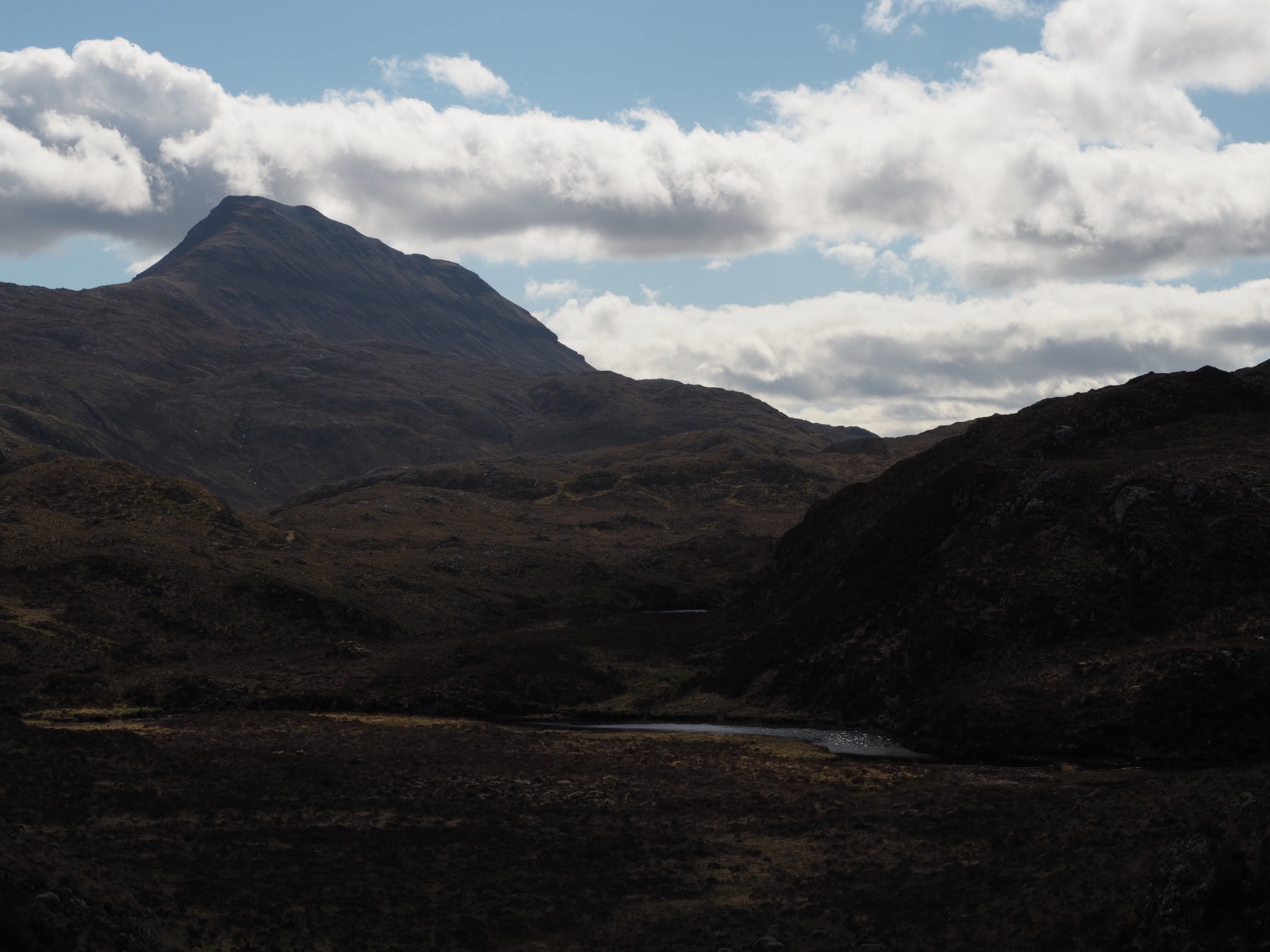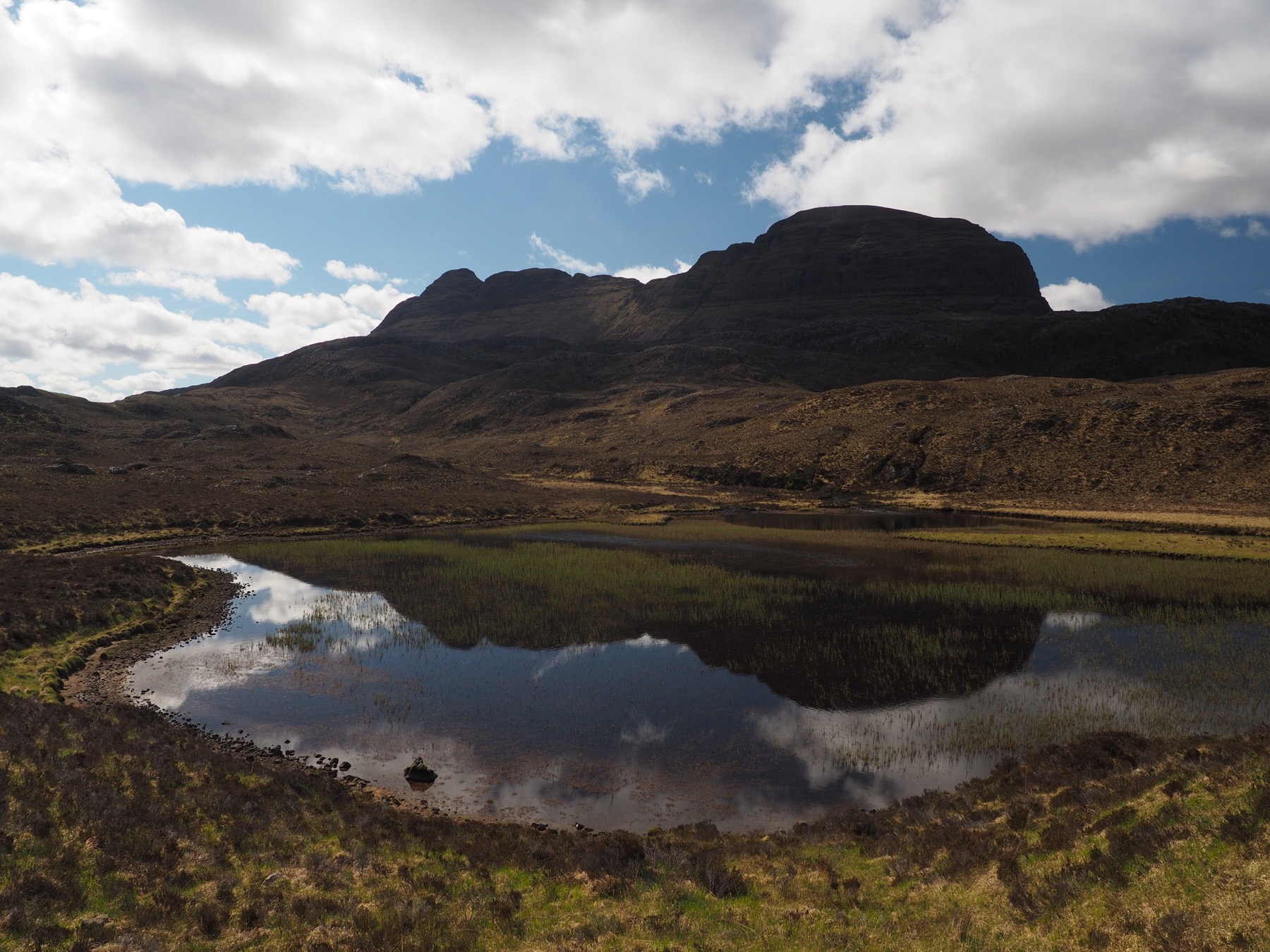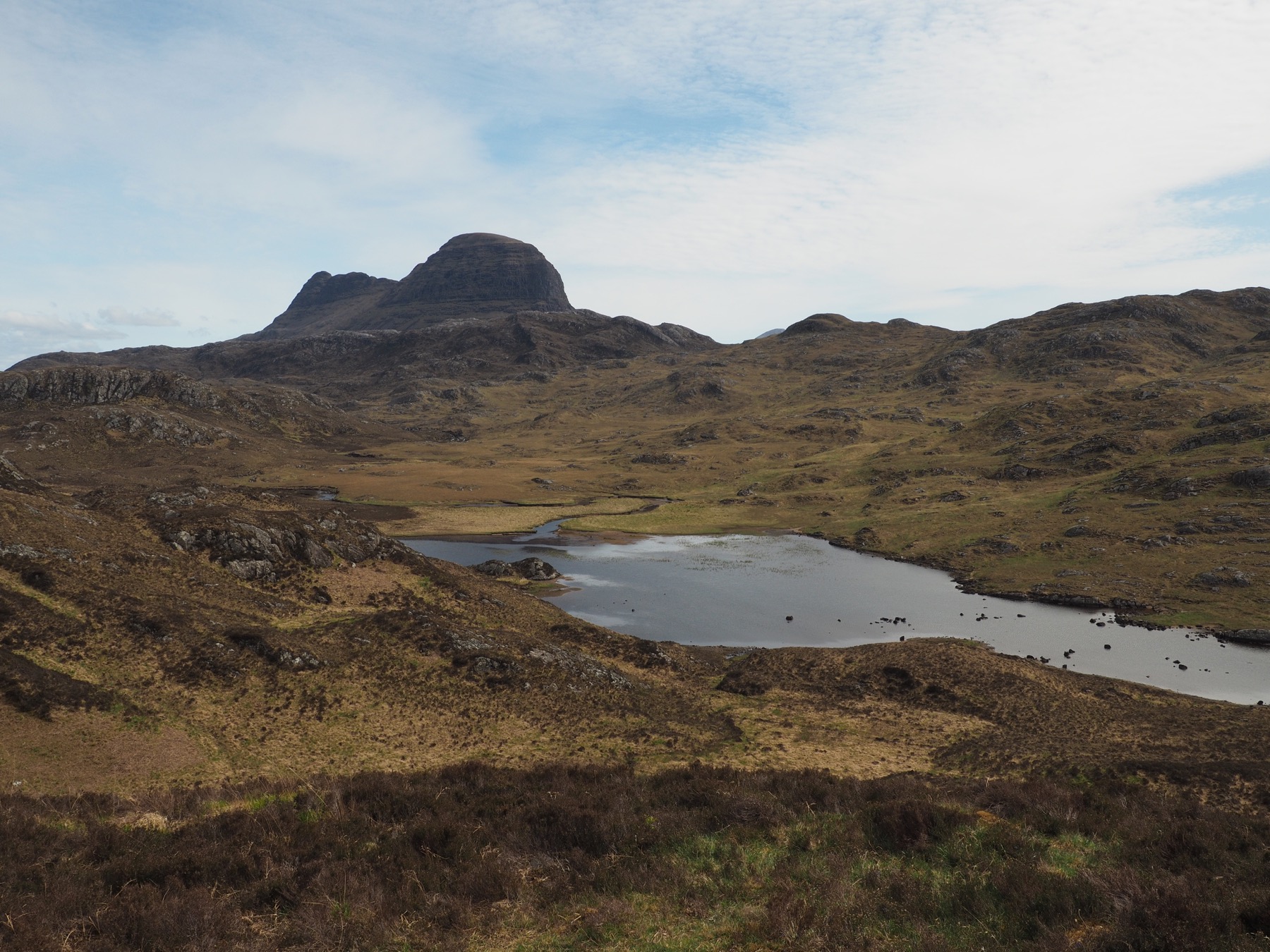 Eventually, Suilven loomed to our right. We turned, climbed a small rise, and passed a small lake. We then begin a longer climb, reaching a larger loch — Loch a’ Choire Dhuibh — and some smaller ponds. After passing by the lake, the trail brought us to the base of Suilven.