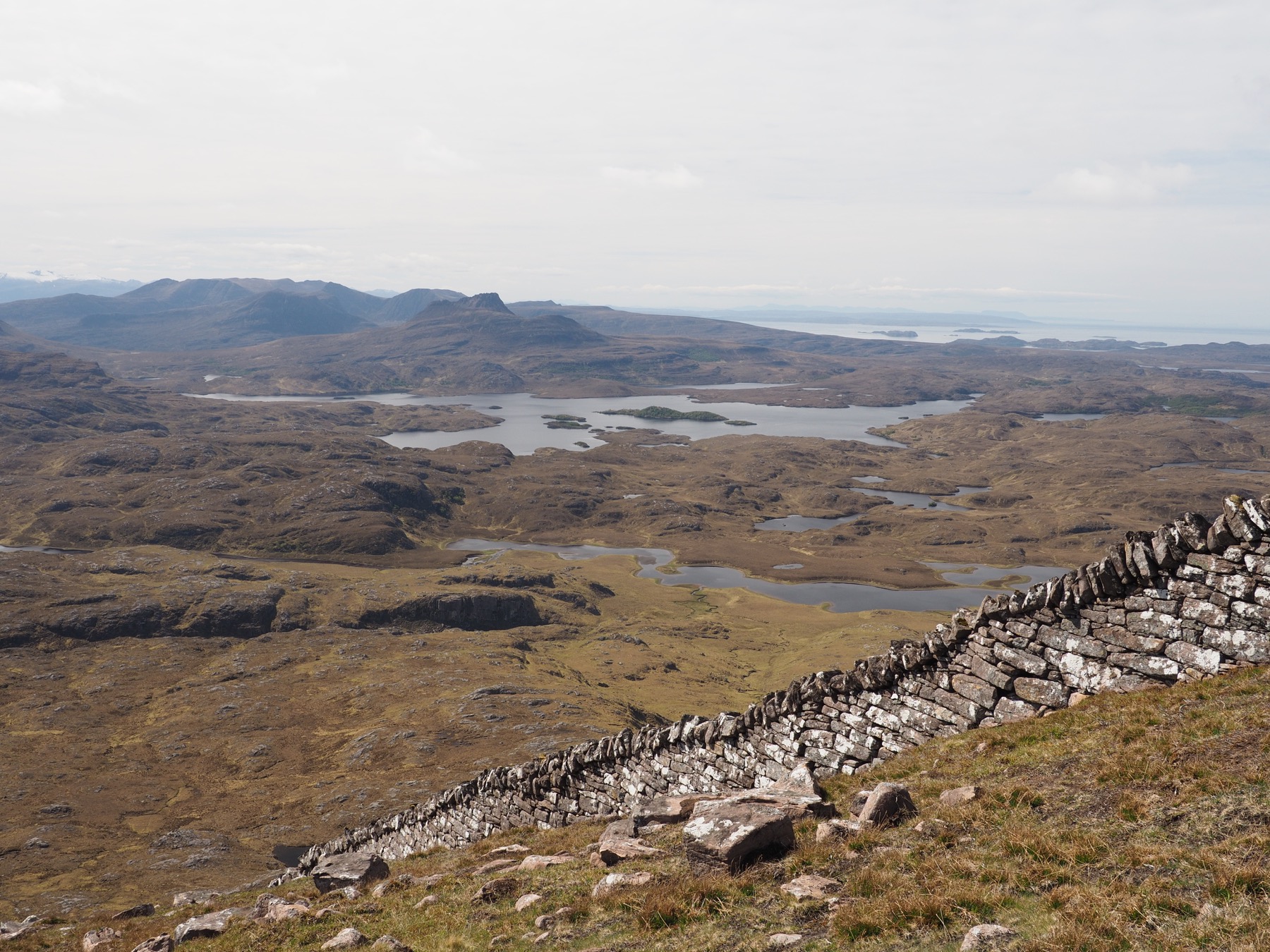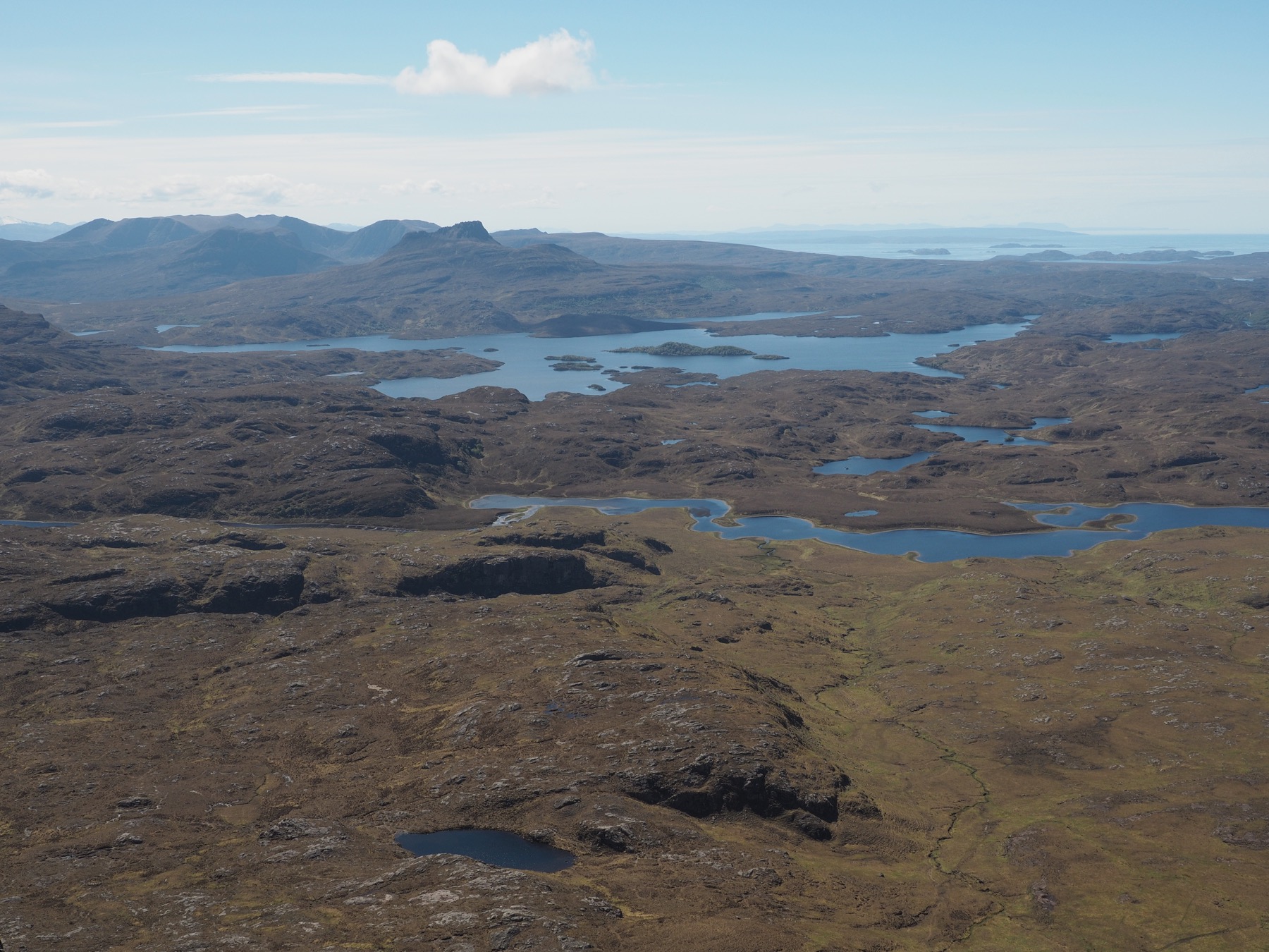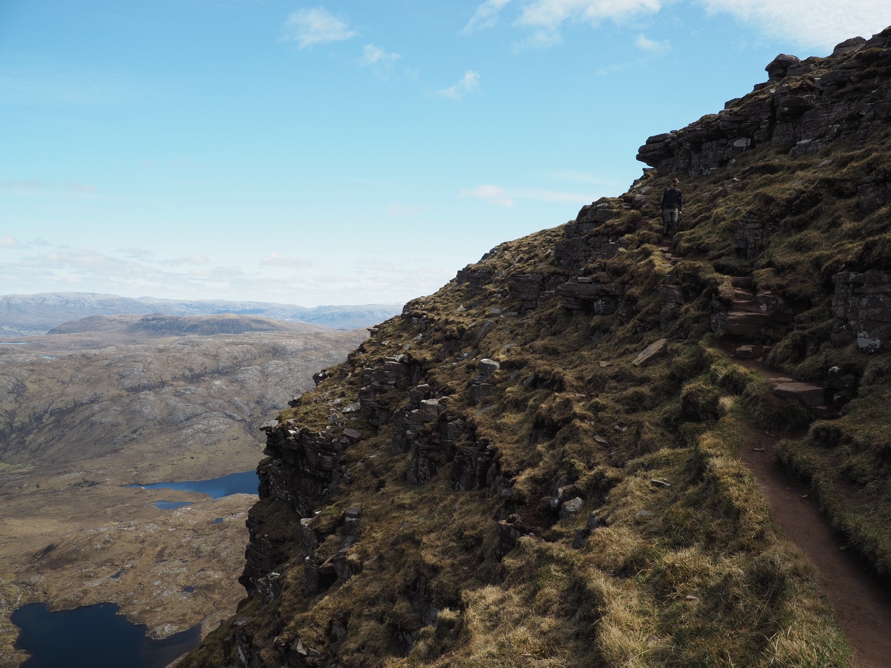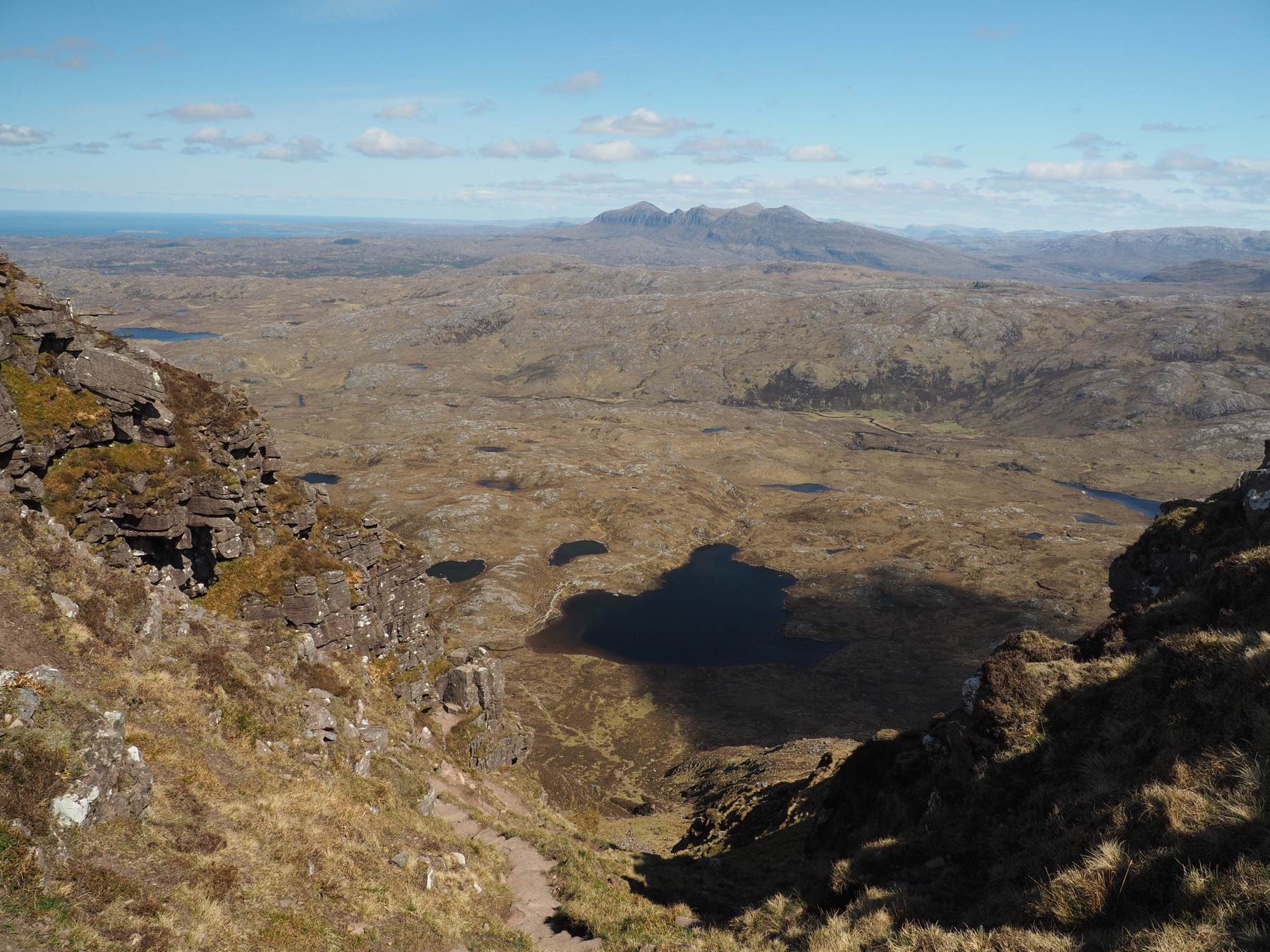 We enjoyed views throughout the entire ascent. Spidean Coinich’s summit offered an even better vista, with 360º views of the entire area. We could see dozens of lakes and peaks, including Suilven, as well as out to the Atlantic. From the top, we could also see the narrow ridge that would continue the loop. With plenty of time, we decided to carry on.