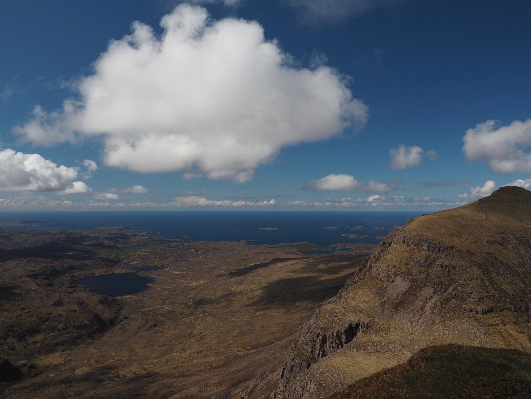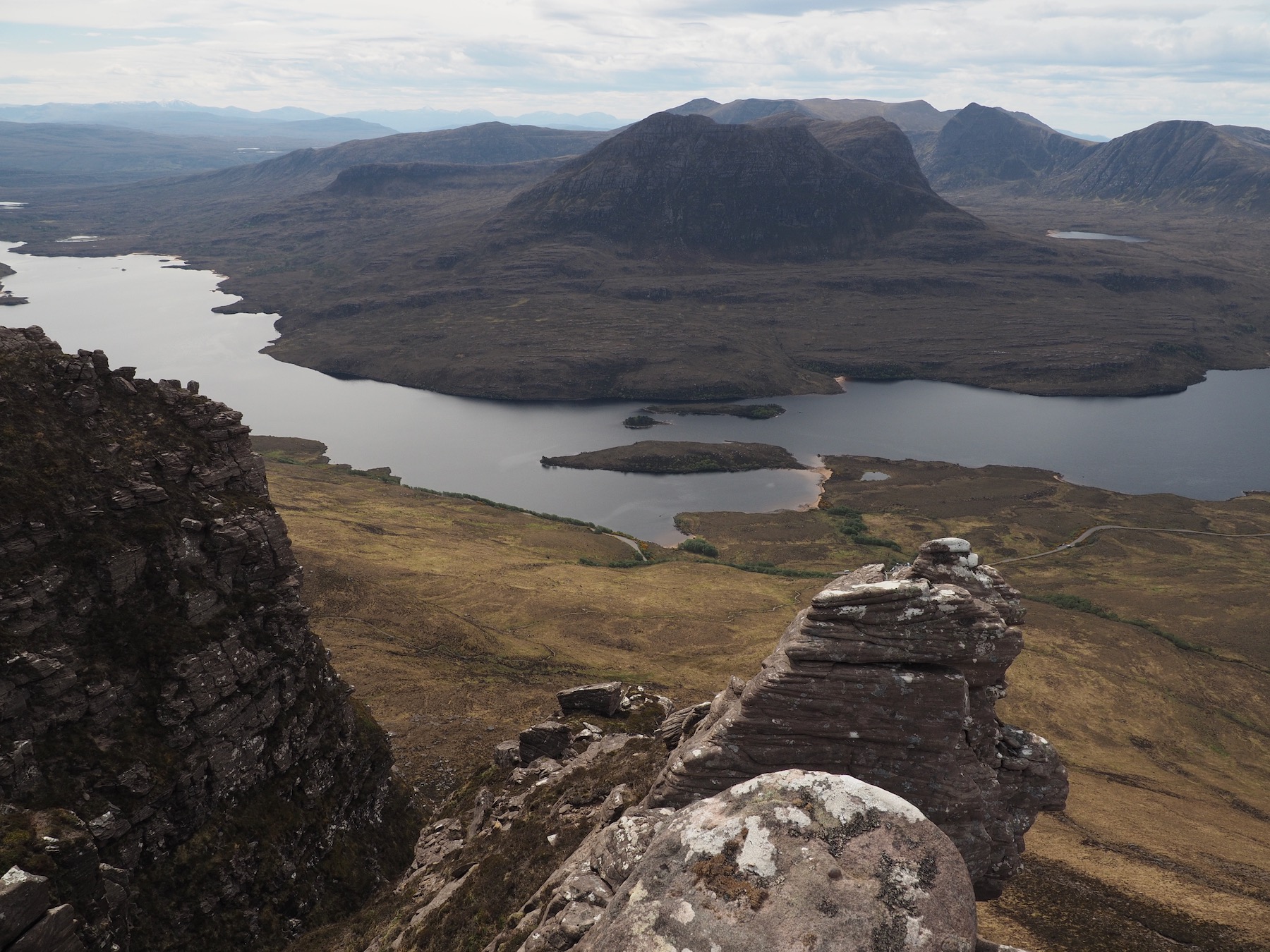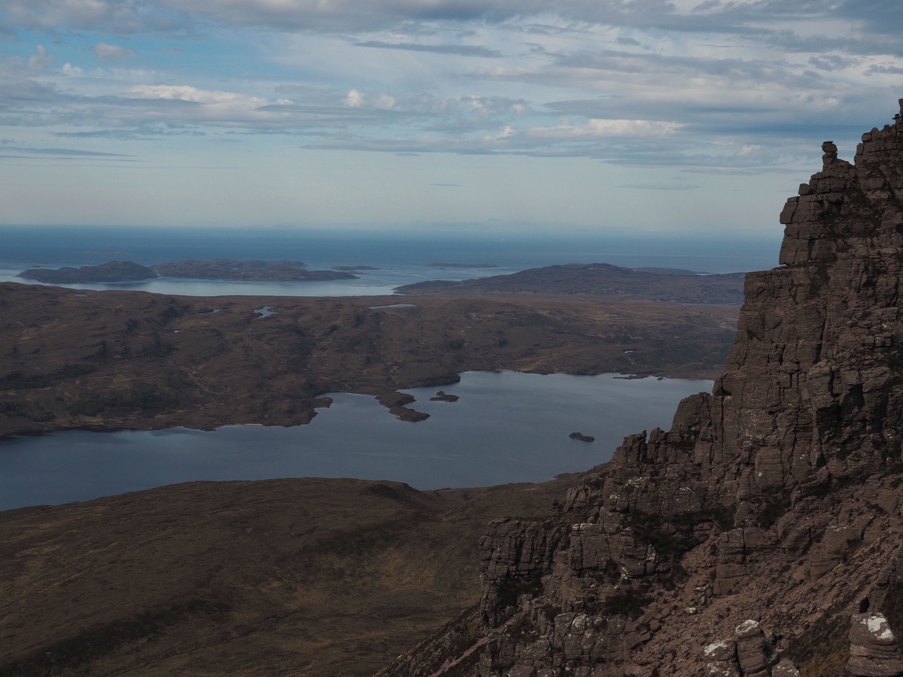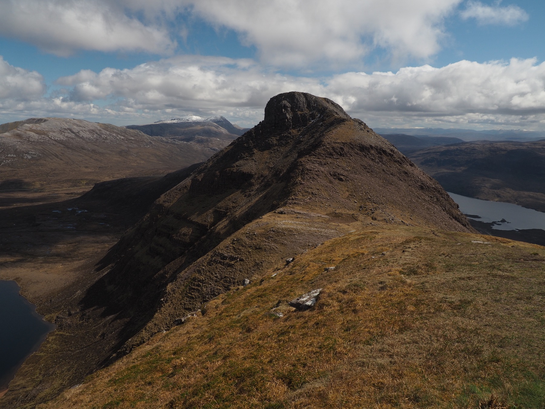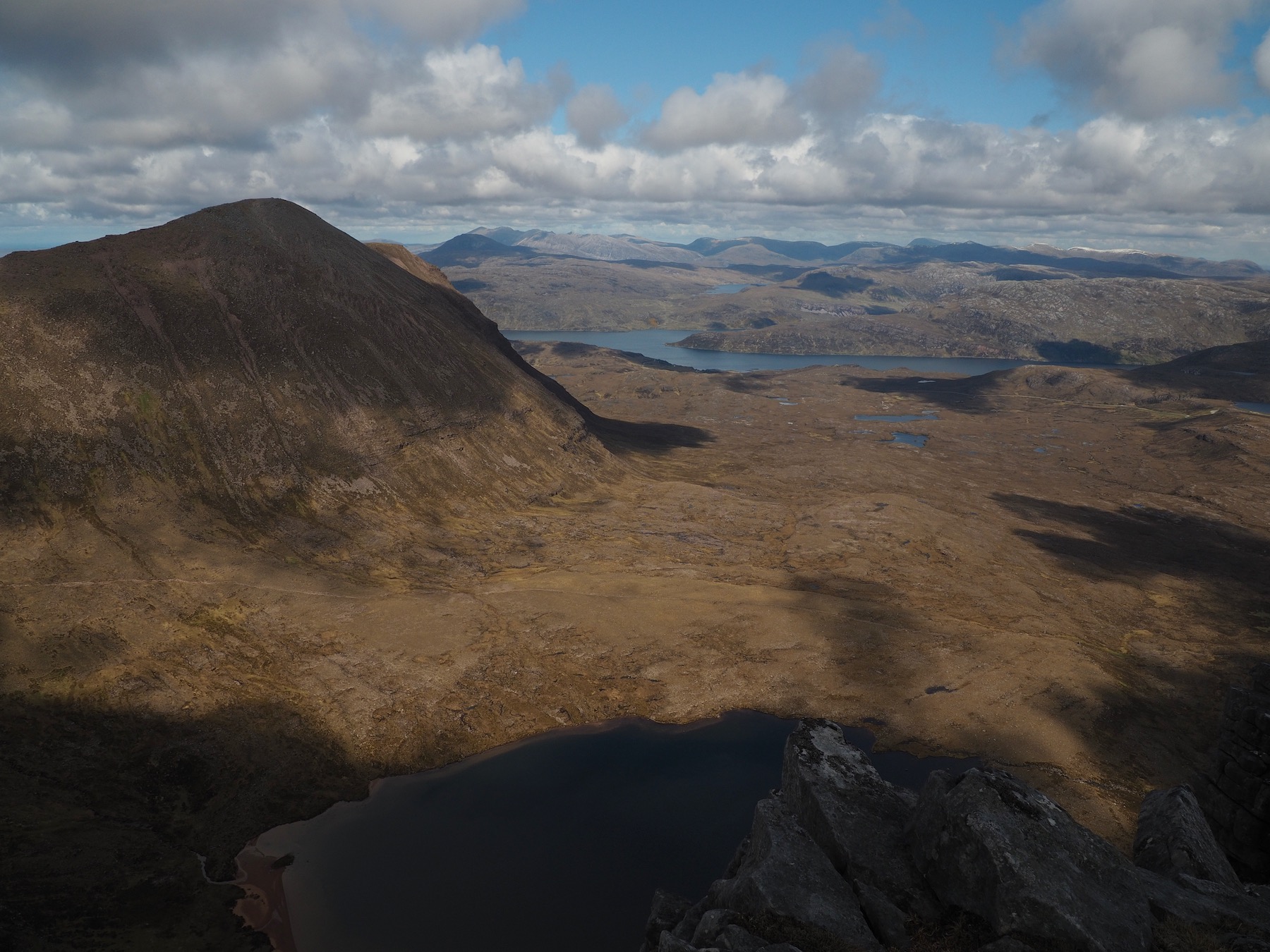 We enjoyed views throughout the entire ascent. Spidean Coinich’s summit offered an even better vista, with 360º views of the entire area. We could see dozens of lakes and peaks, including Suilven, as well as out to the Atlantic. From the top, we could also see the narrow ridge that would continue the loop. With plenty of time, we decided to carry on.