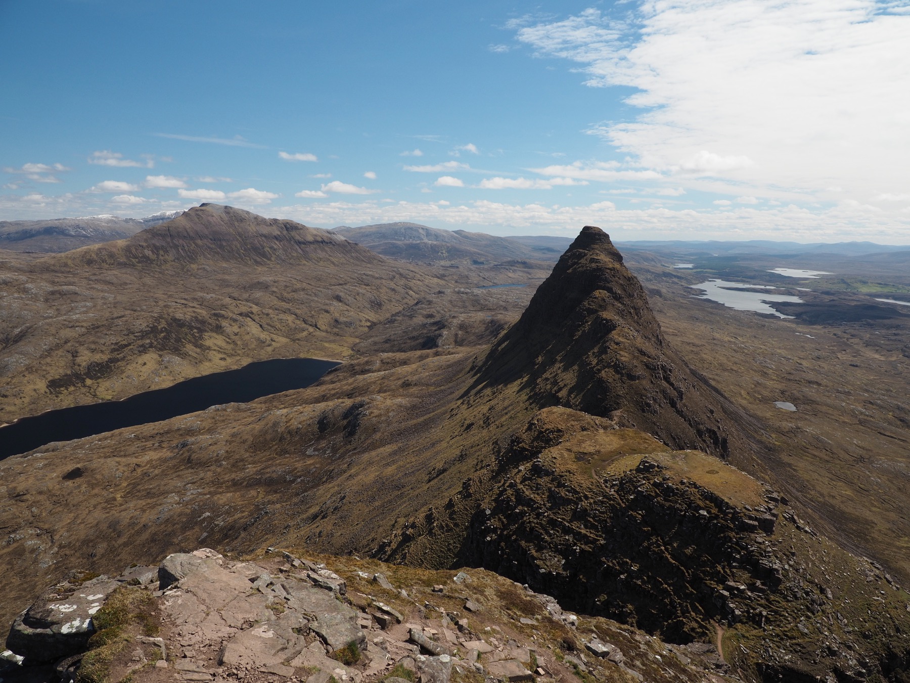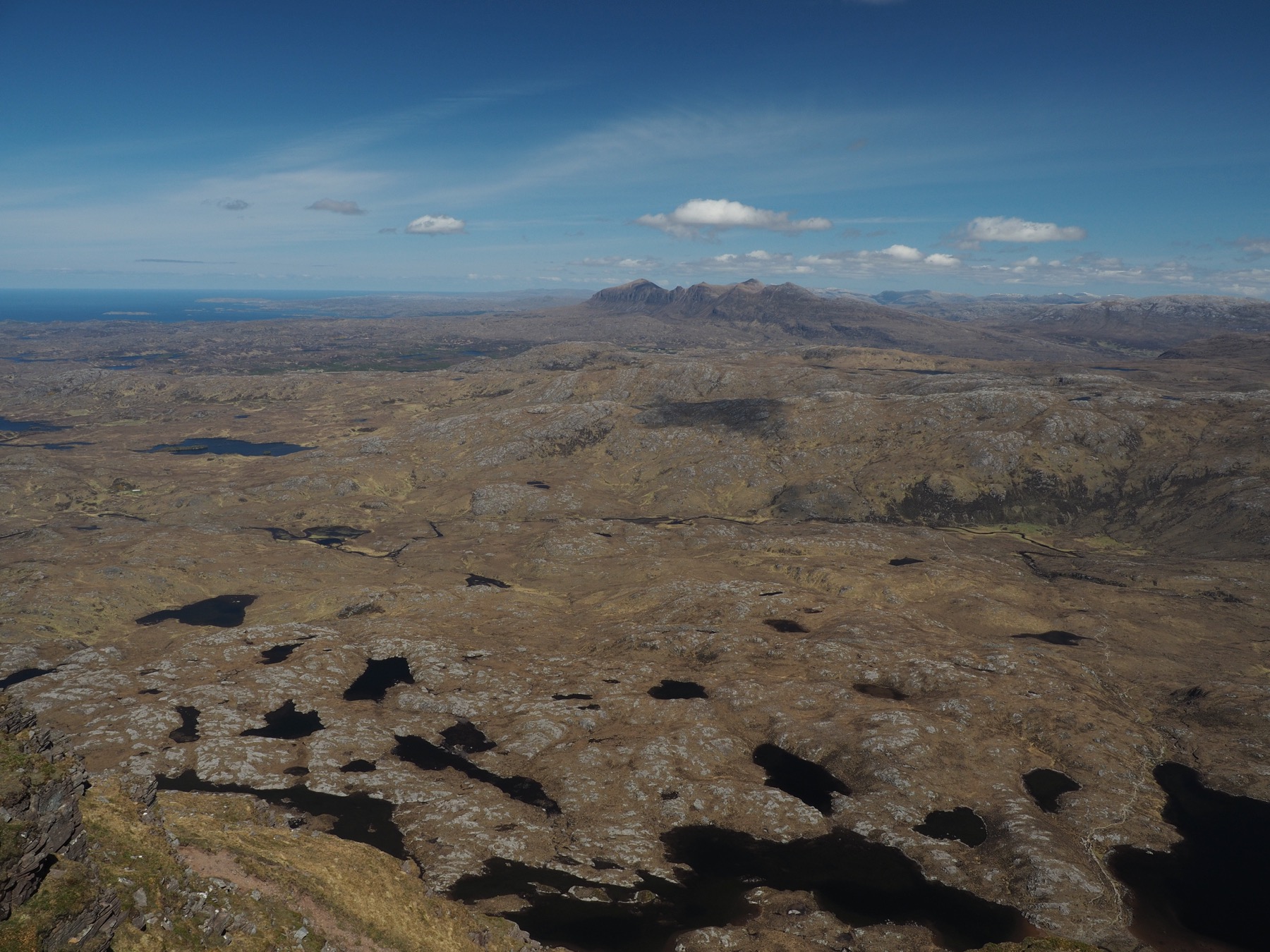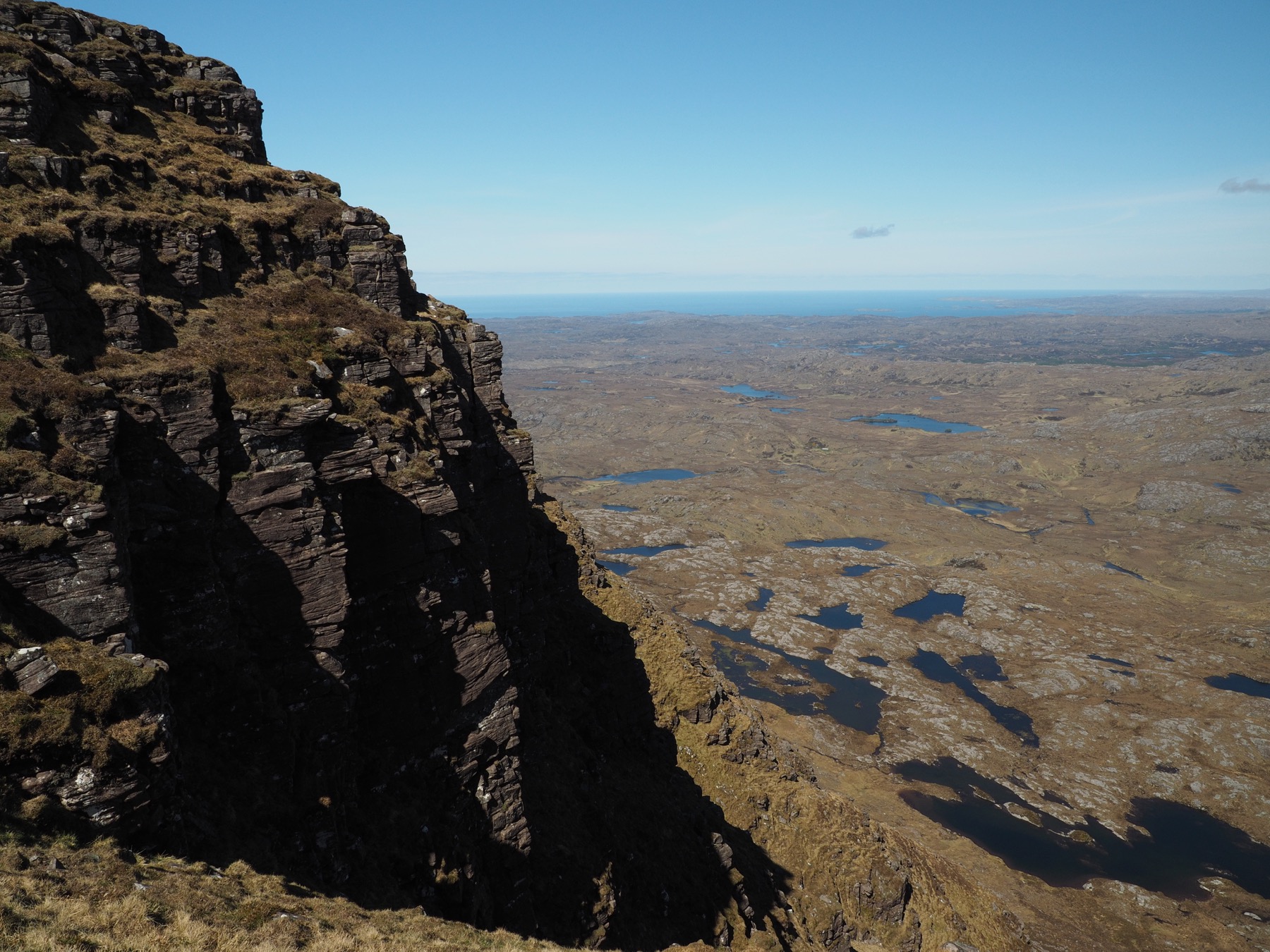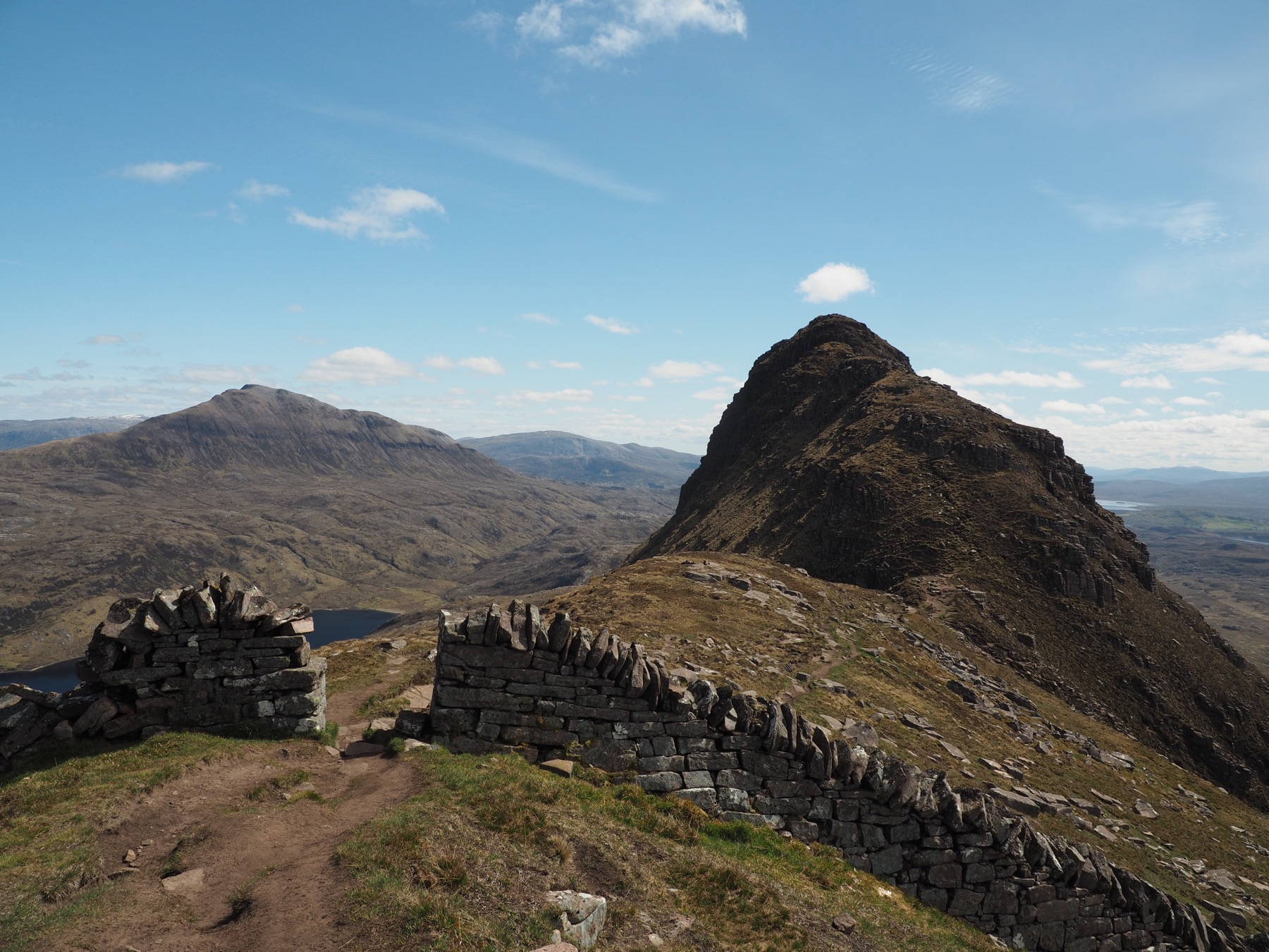 We enjoyed views throughout the entire ascent. Spidean Coinich’s summit offered an even better vista, with 360º views of the entire area. We could see dozens of lakes and peaks, including Suilven, as well as out to the Atlantic. From the top, we could also see the narrow ridge that would continue the loop. With plenty of time, we decided to carry on.