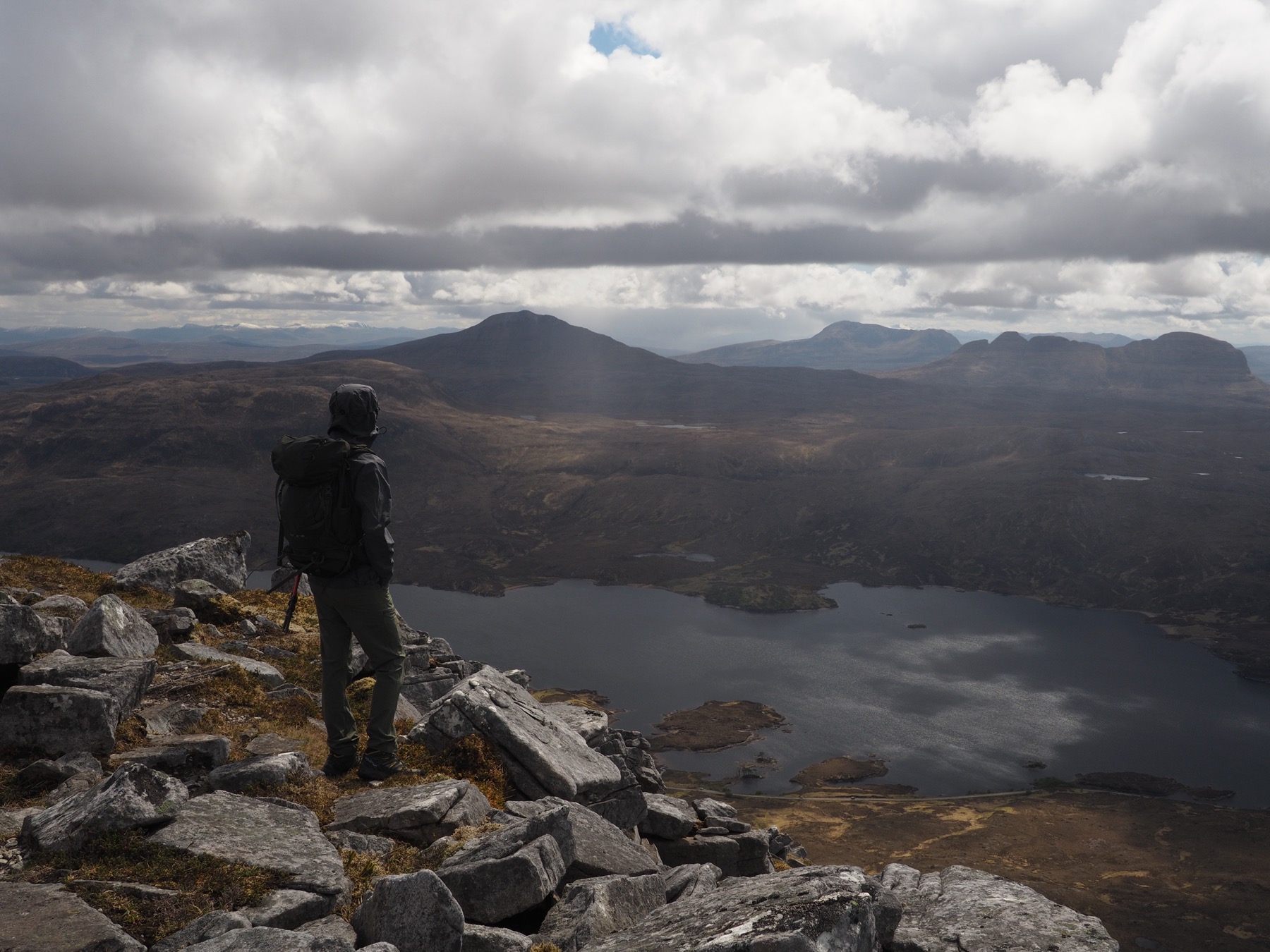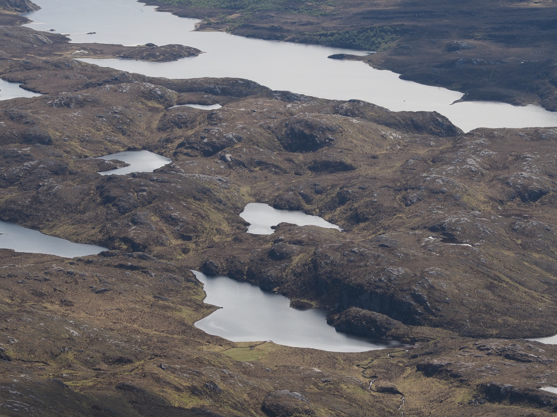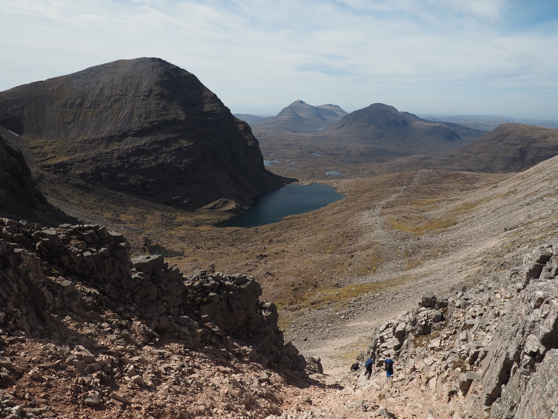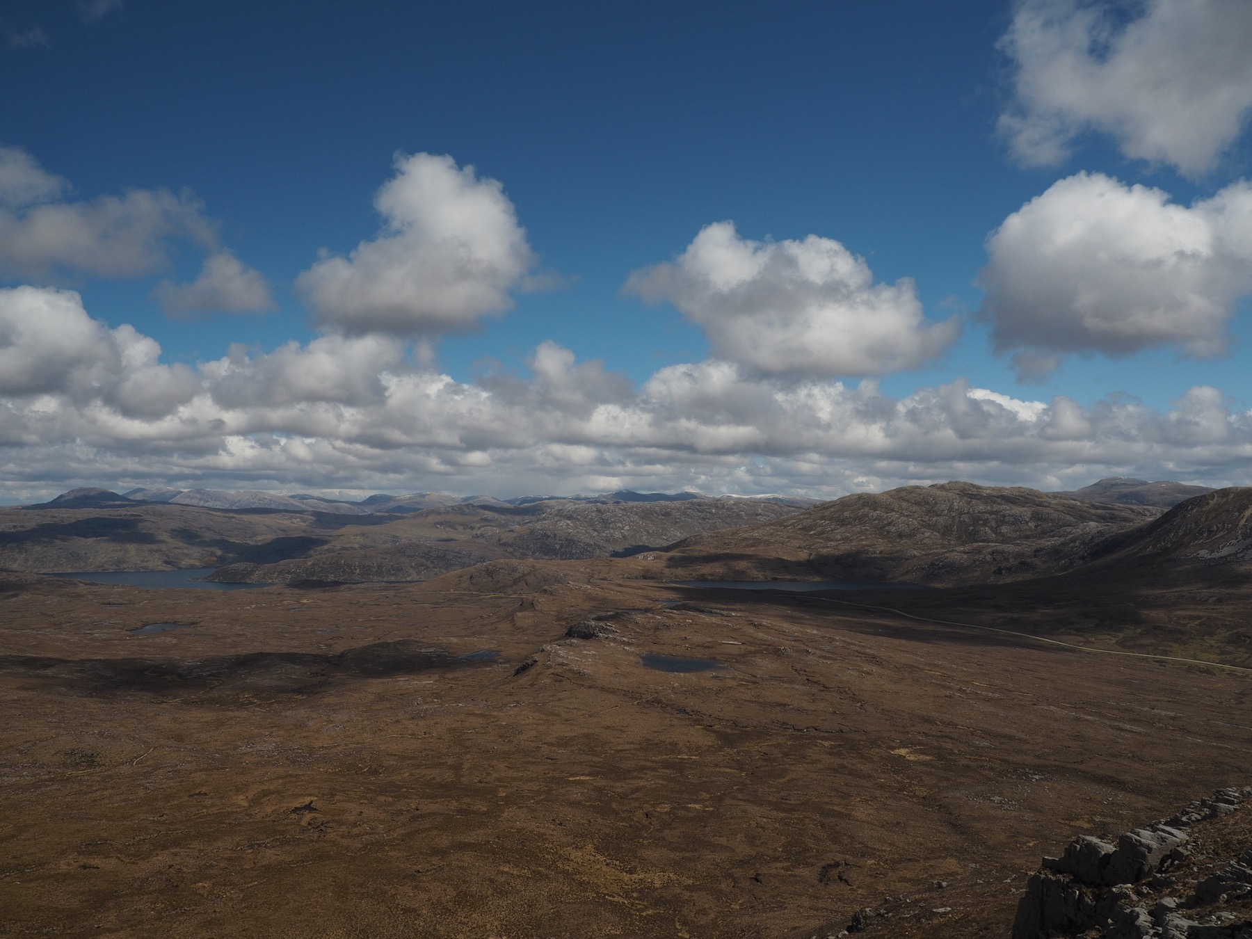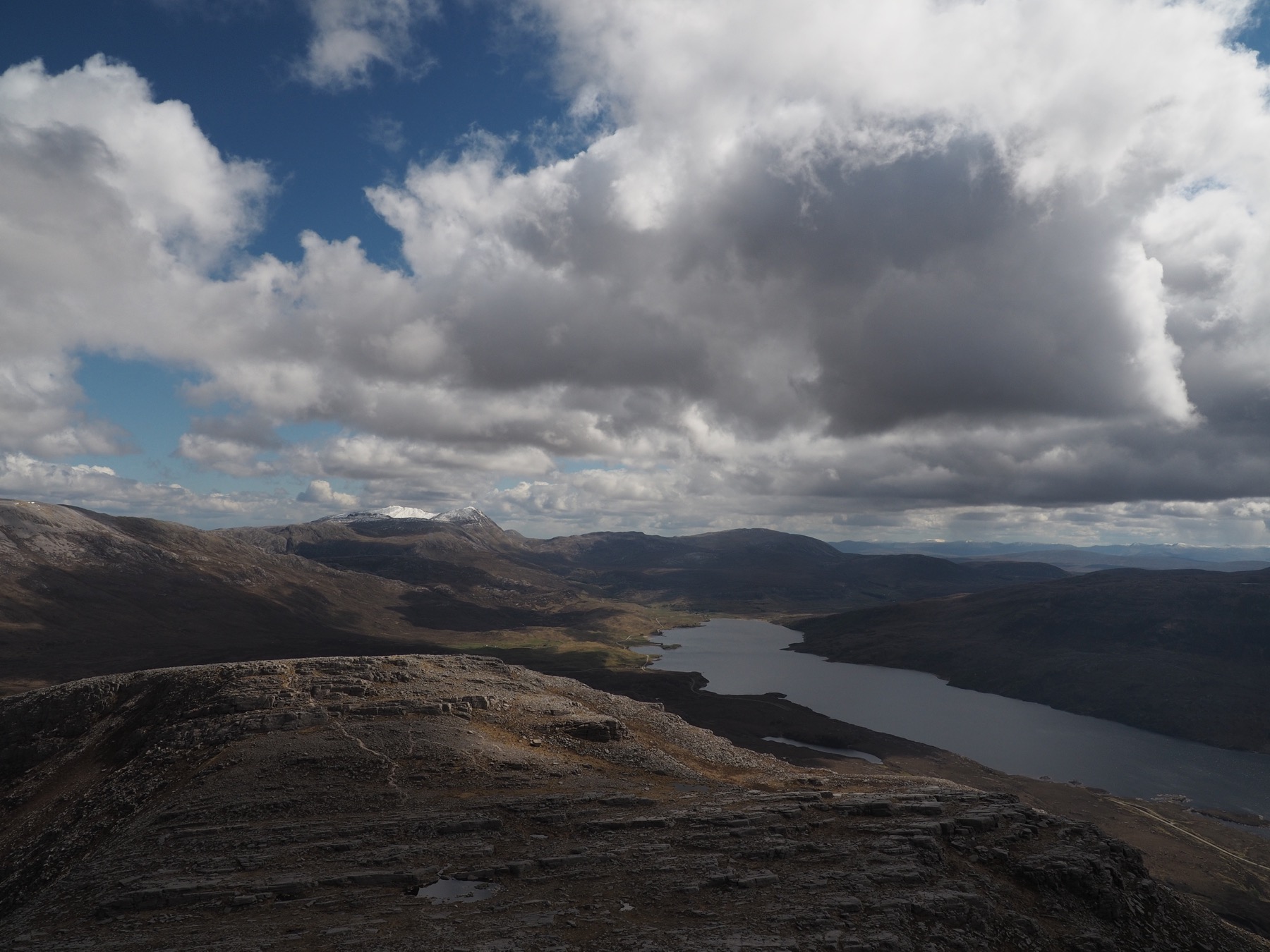 We enjoyed views throughout the entire ascent. Spidean Coinich’s summit offered an even better vista, with 360º views of the entire area. We could see dozens of lakes and peaks, including Suilven, as well as out to the Atlantic. From the top, we could also see the narrow ridge that would continue the loop. With plenty of time, we decided to carry on.