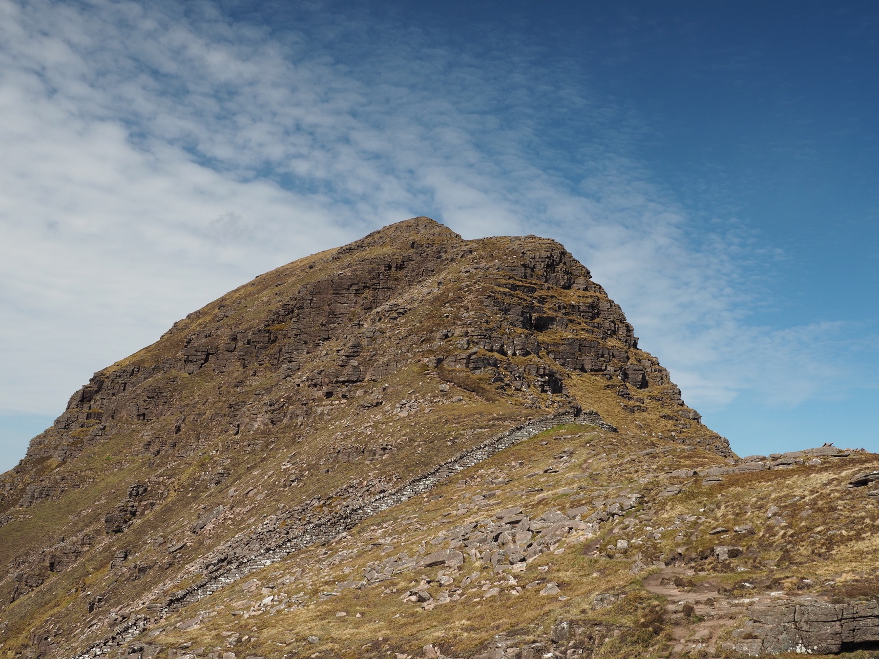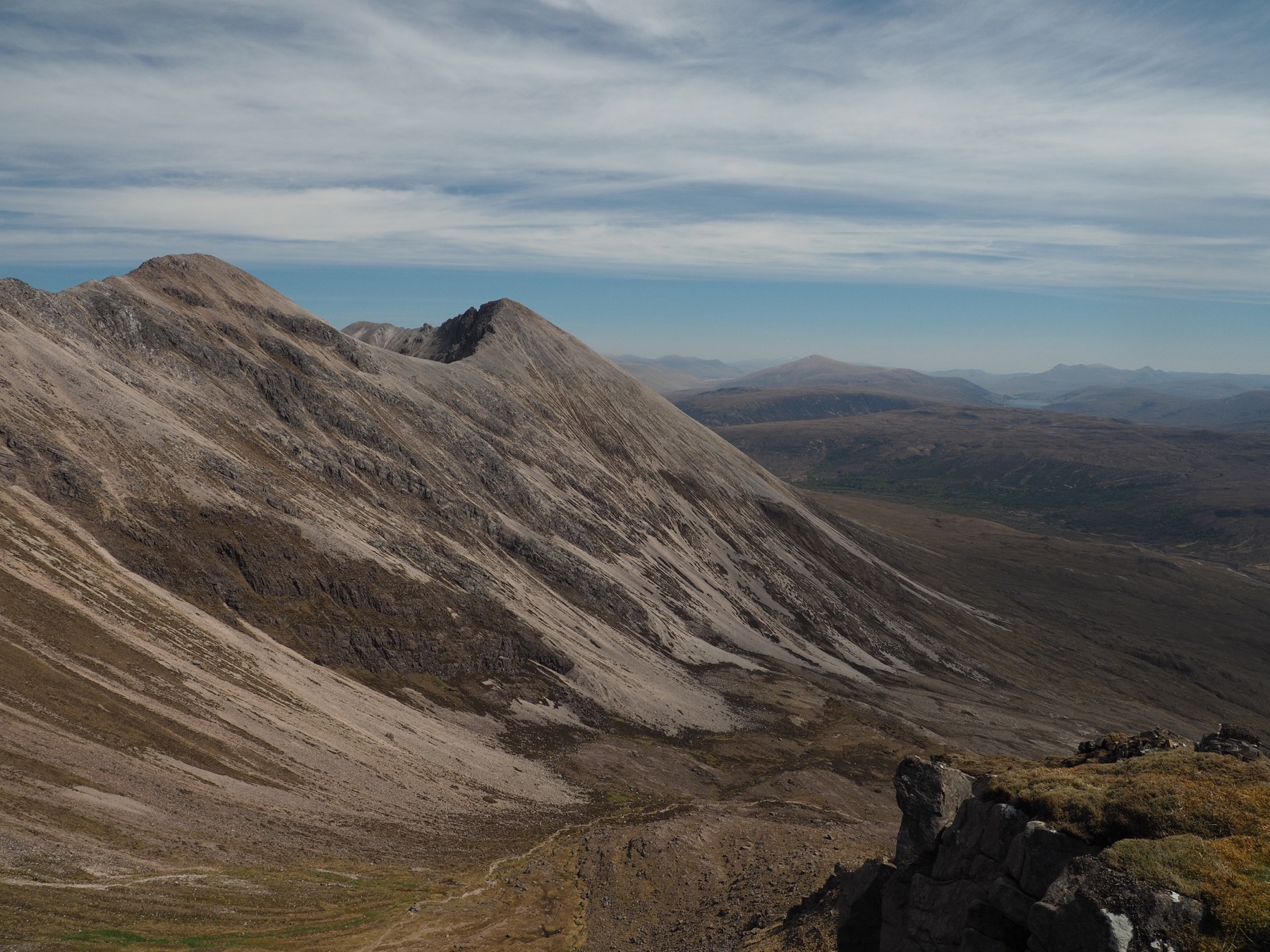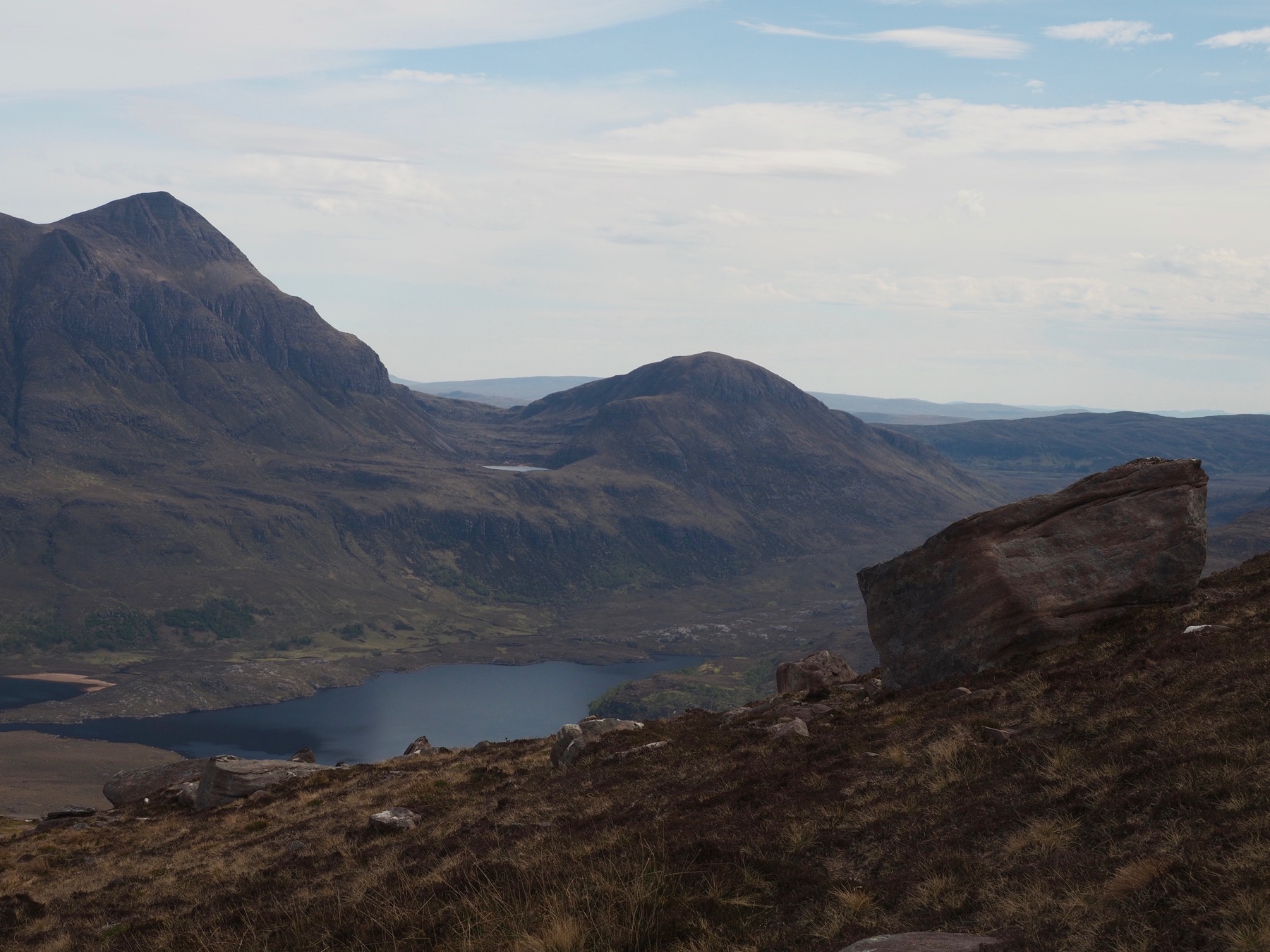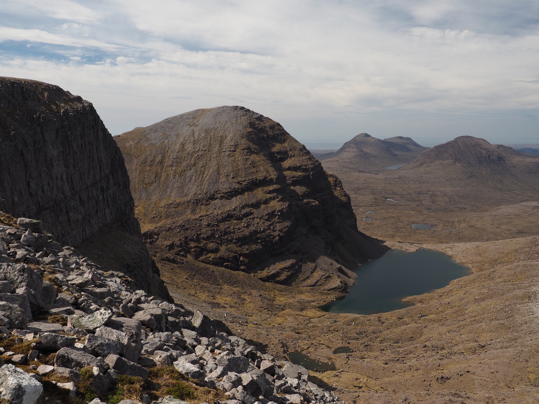 We enjoyed views throughout the entire ascent. Spidean Coinich’s summit offered an even better vista, with 360º views of the entire area. We could see dozens of lakes and peaks, including Suilven, as well as out to the Atlantic. From the top, we could also see the narrow ridge that would continue the loop. With plenty of time, we decided to carry on.