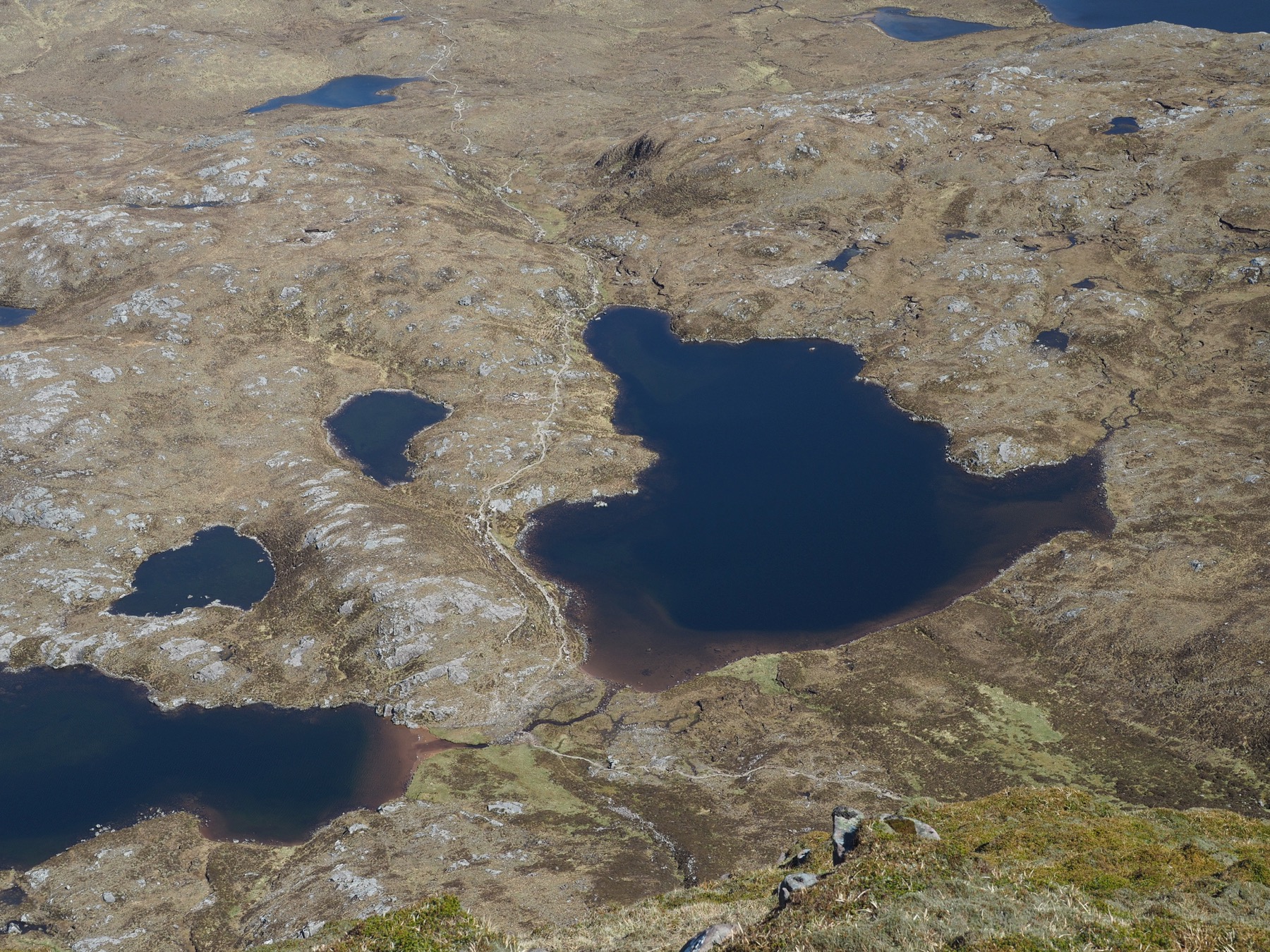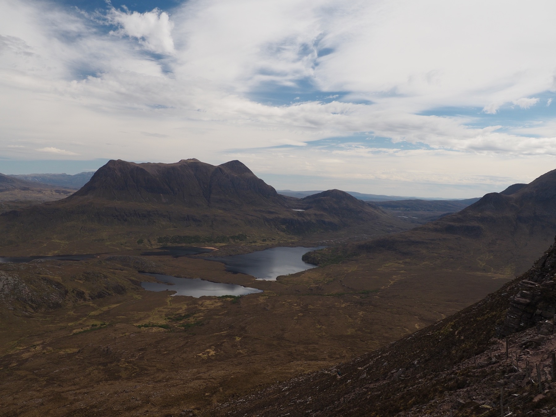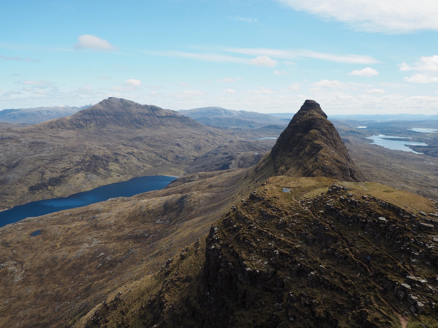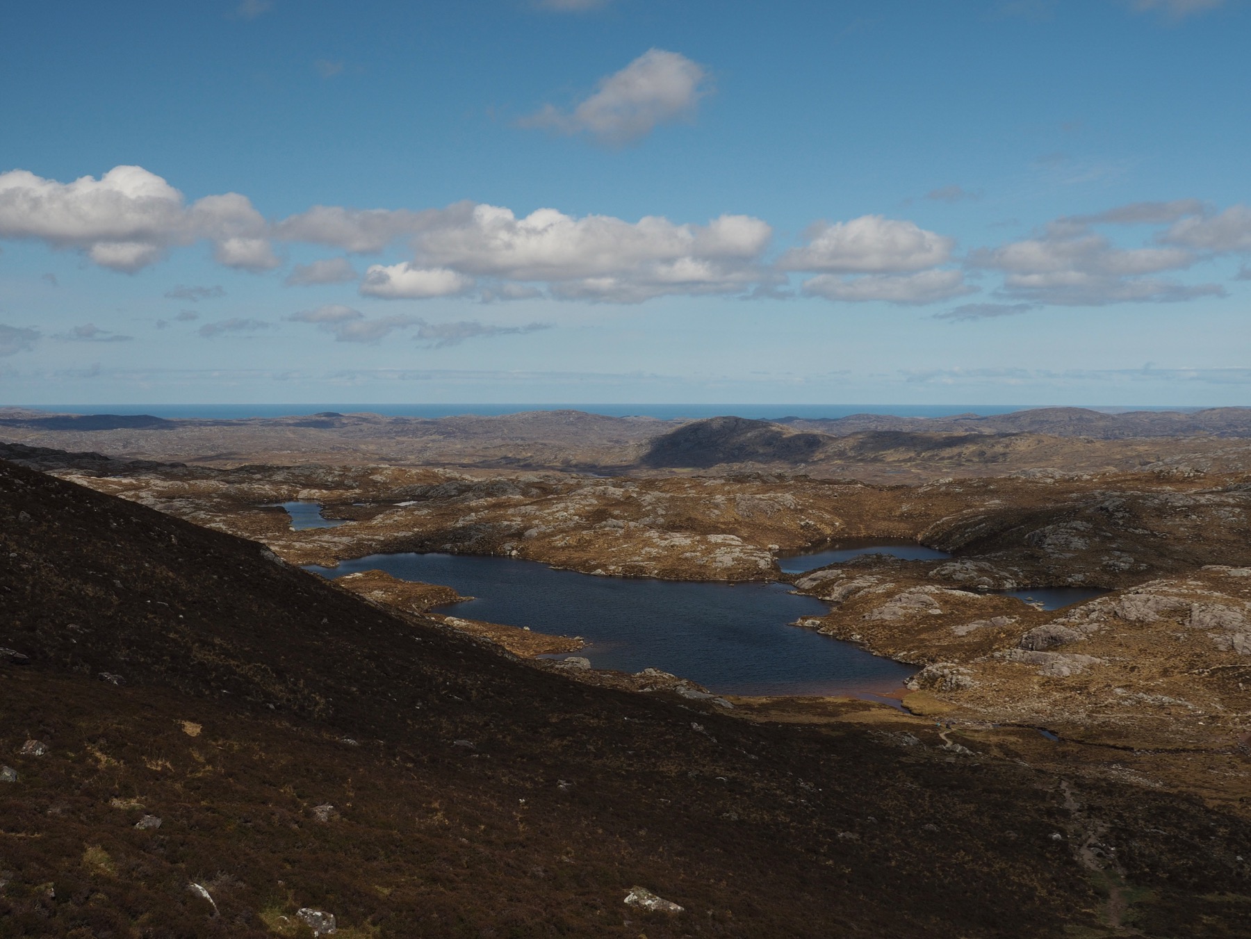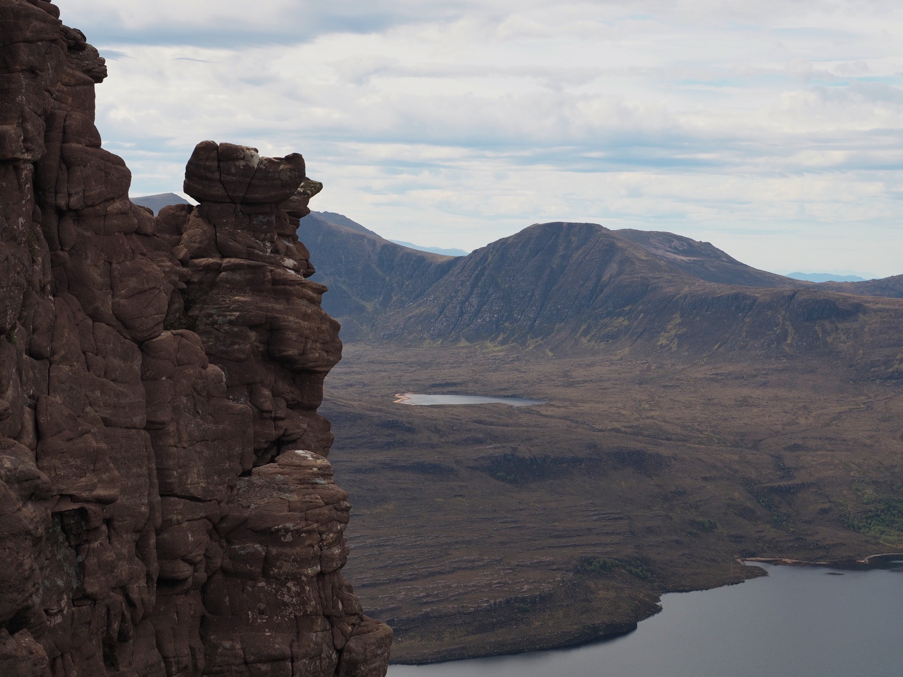 We enjoyed views throughout the entire ascent. Spidean Coinich’s summit offered an even better vista, with 360º views of the entire area. We could see dozens of lakes and peaks, including Suilven, as well as out to the Atlantic. From the top, we could also see the narrow ridge that would continue the loop. With plenty of time, we decided to carry on.