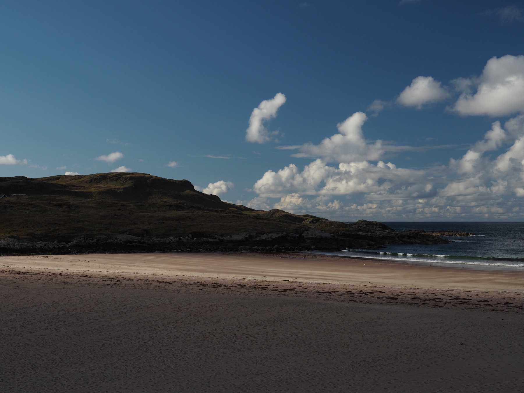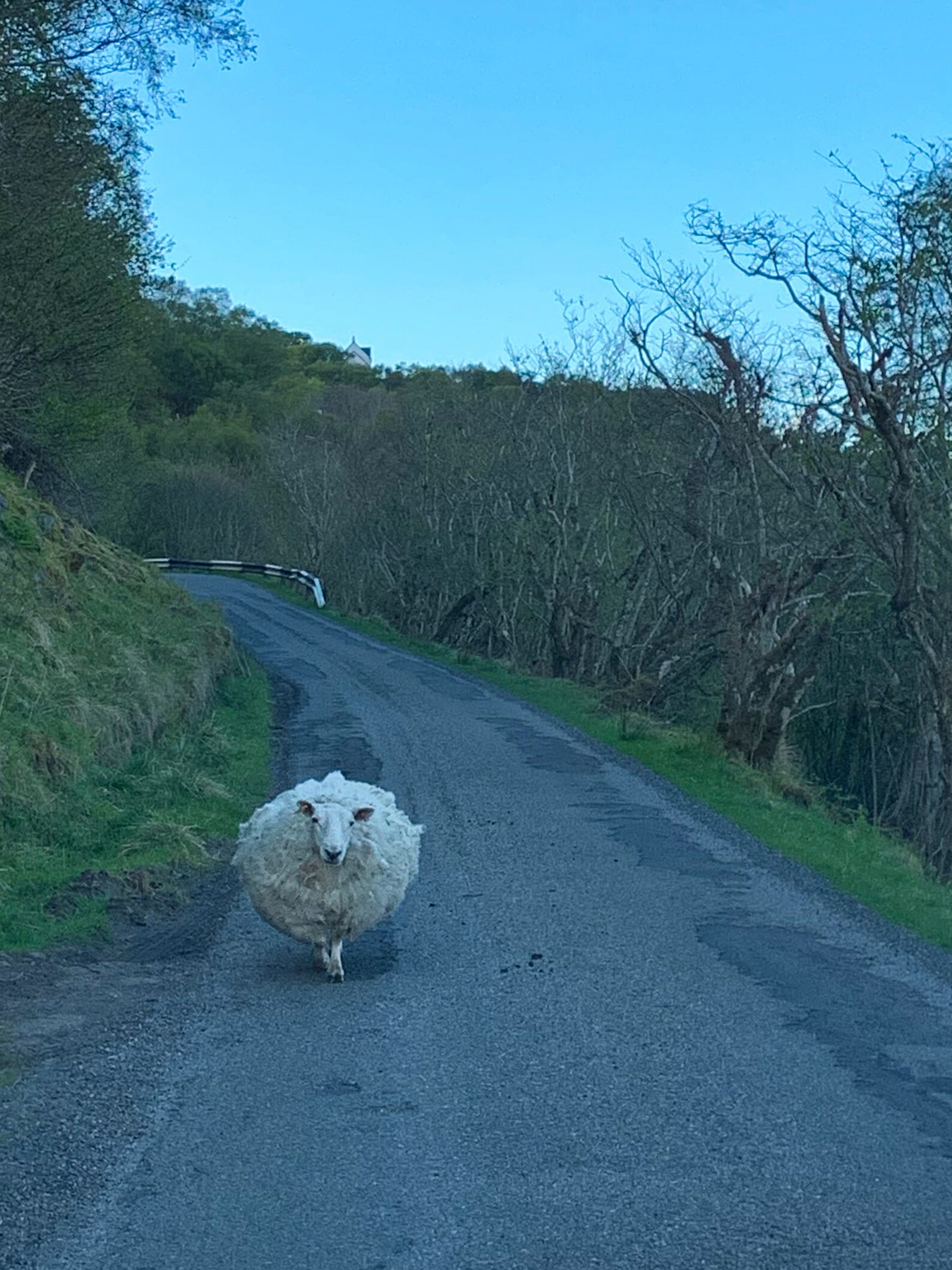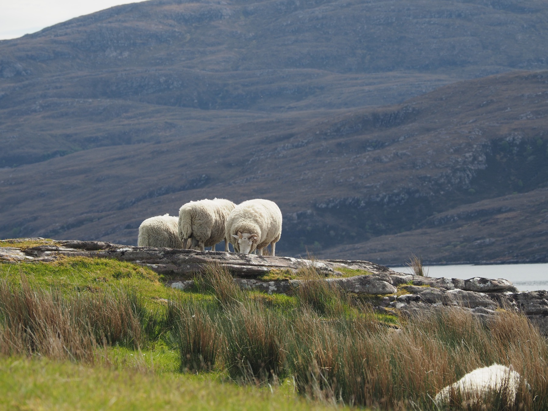 The winding, single-tracked road had me white knuckled for most of the drive. Kyle, as passenger, got to see much more of the views than I did. Still, I enjoyed seeing the peninsula, other side of Quinag, coast, highland cattle, and, of course, sheep. On the other side of the peninsula, we stopped at two white, sandy beaches — Clashnessie and Achmelvich Bay — for short strolls. Later, we realized we had missed the short walk to Clashnessie Falls; I would have liked to see this had we known we were so close.
