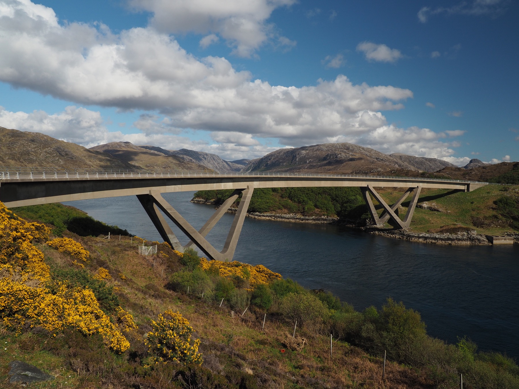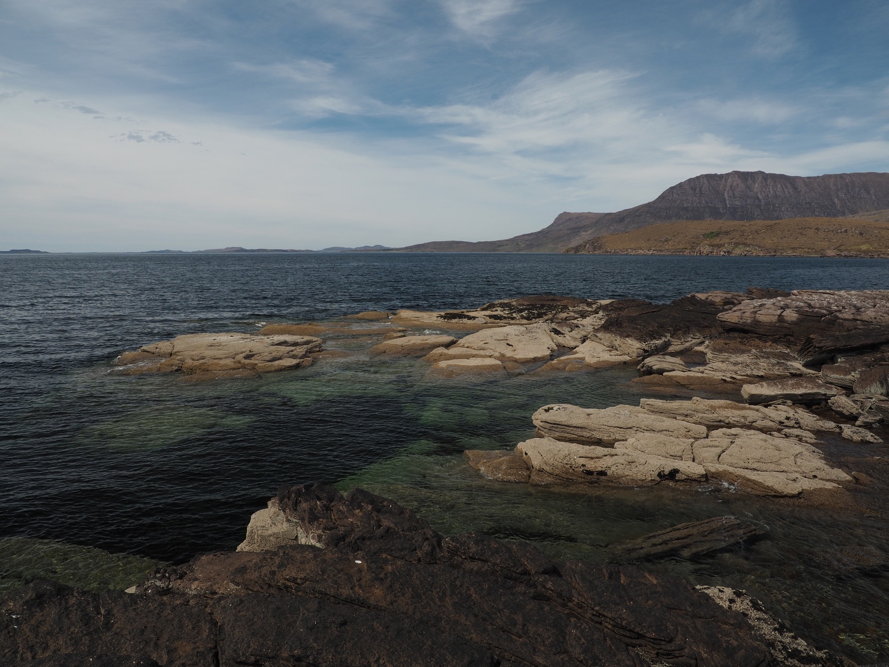 We reached the trailhead sooner than we expected. With extra time, we decided to drive north to Unapool and the Kylesku bridge. The drive was pretty and revealed much of the region’s geology. Just past the bridge, we stopped again for views and a snack. We then turned around and headed toward Lochinver on B869, a single-tracked coastal route.