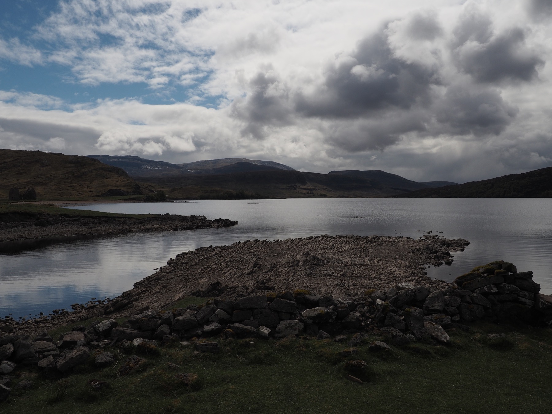 When we reached Loch Assynt, we stopped to visit the ruins of Ardvreck Castle. The castle sits on a short, rocky peninsula in the lake and dates from the late 16th century. Only the ruins of one tower and wall remain. Walking the grounds, we used our imaginations to fill in the rest.