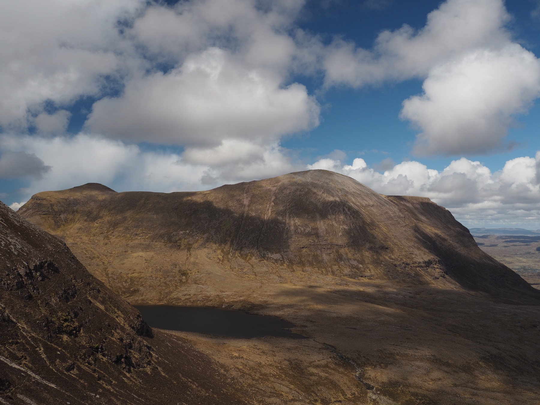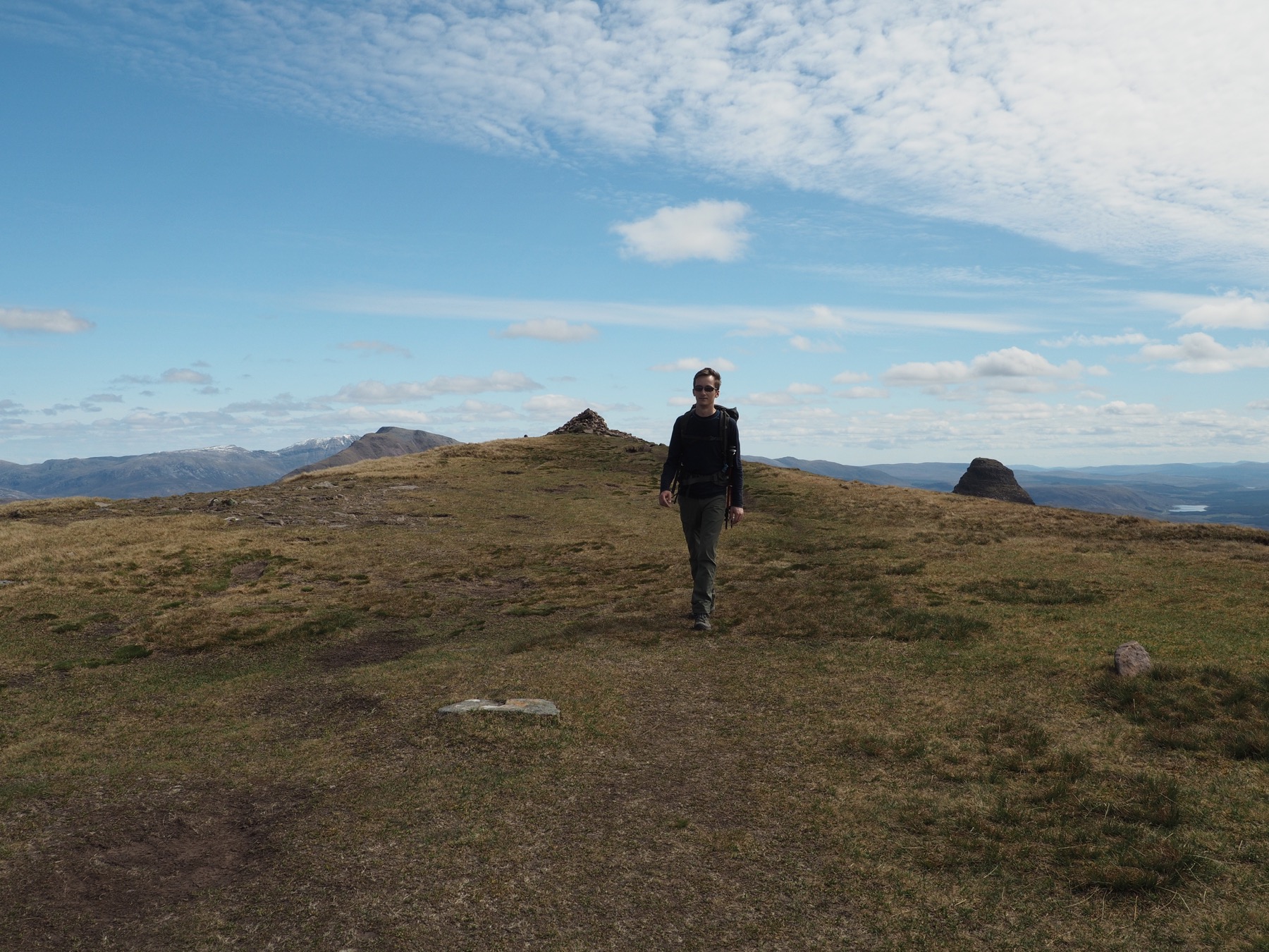 From there, a few ups and downs along the ridge brought us to the large, round summit of Caisteal Liath, Suilven’s true summit (731m). Ahead of us, the coast. Behind us, the ridge and the tall, pointed peak of Meall Meadhonach, with Canisp further in the distance.