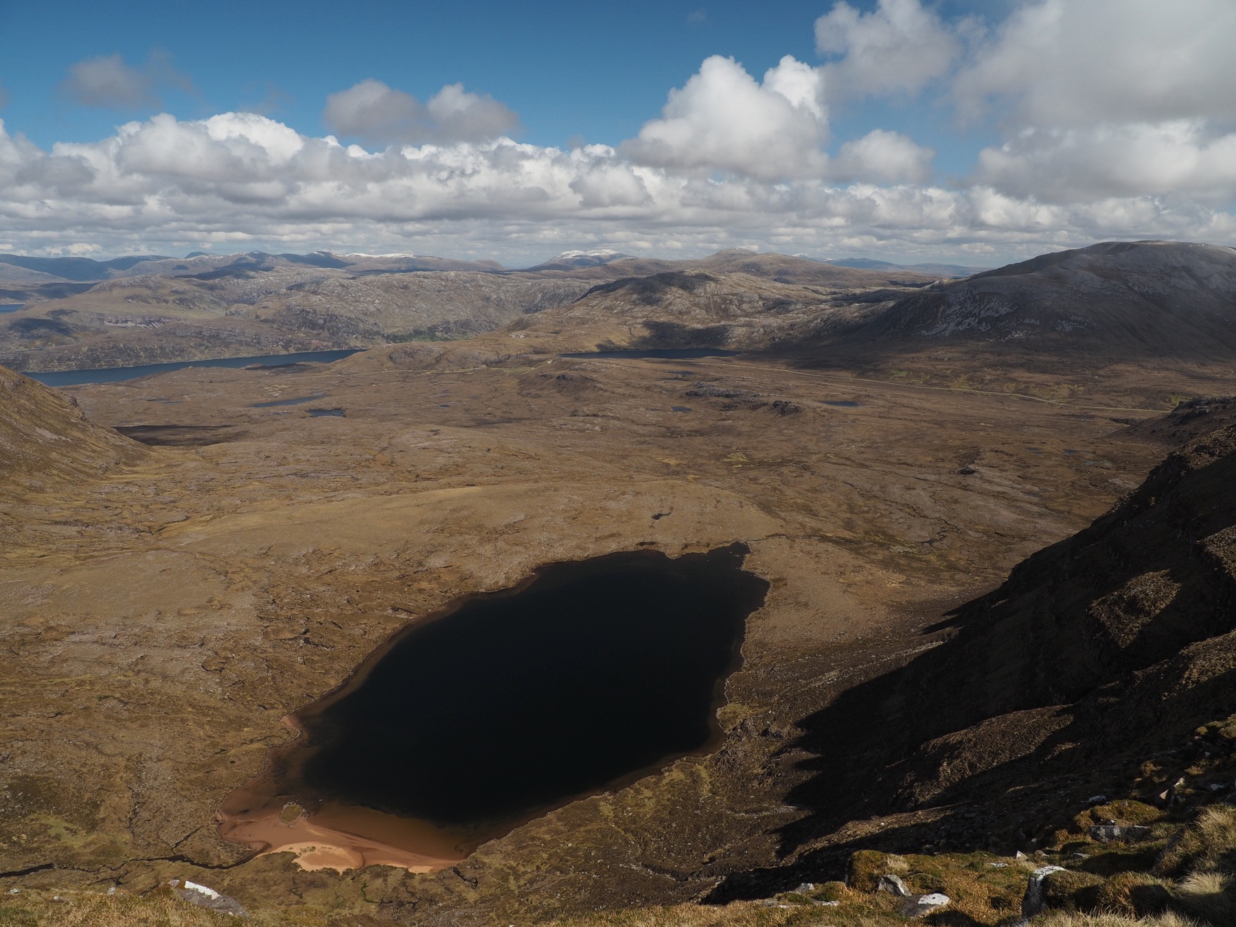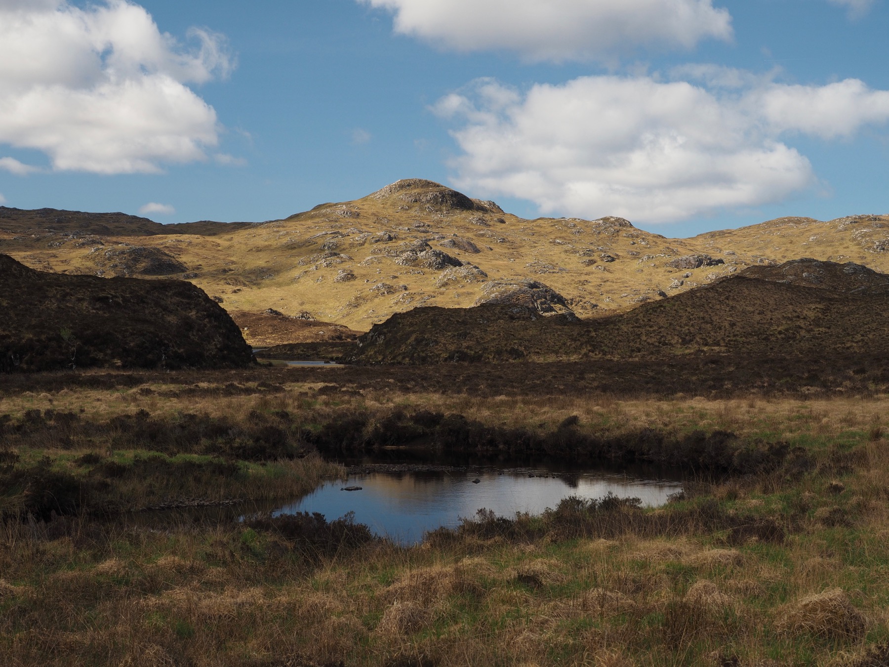 After our visit to Ardvreck, we headed up the road just a few minutes for a hike. We selected Quinag. Walkhighlands describes a route over its three corbetts (summits between 2500′ and 3000′ feet). With half a day, though, we decided we could either do an in-and-out hike to the first corbett or a short clockwise loop, descending at the col between the three.