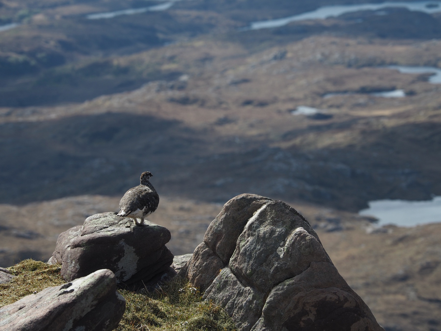 Along the ridge, a blustery and sudden snow shower greeted us. Little stuck, but it was pretty. As we approached the junction we saw both a deer and a grouse. At the junction, we briefly weighed our options. We decided we wanted to be sure of a timely check in, and so we headed down. Once down, we passed Lochan Bealach Cornaidh on the way back to where we had first turned off. We turned around often to look back at the lochan and Quinag.