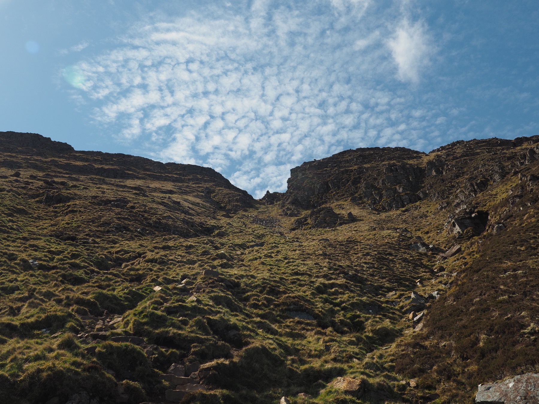 A grassy gully led up. Despite appearing to rise almost vertically from all sides, the climb up the the gully was surprisingly moderate. The trail had signs of recent improvements, which might correspond to work we had read the John Muir Trust completed after the movie Edie featured the hike.