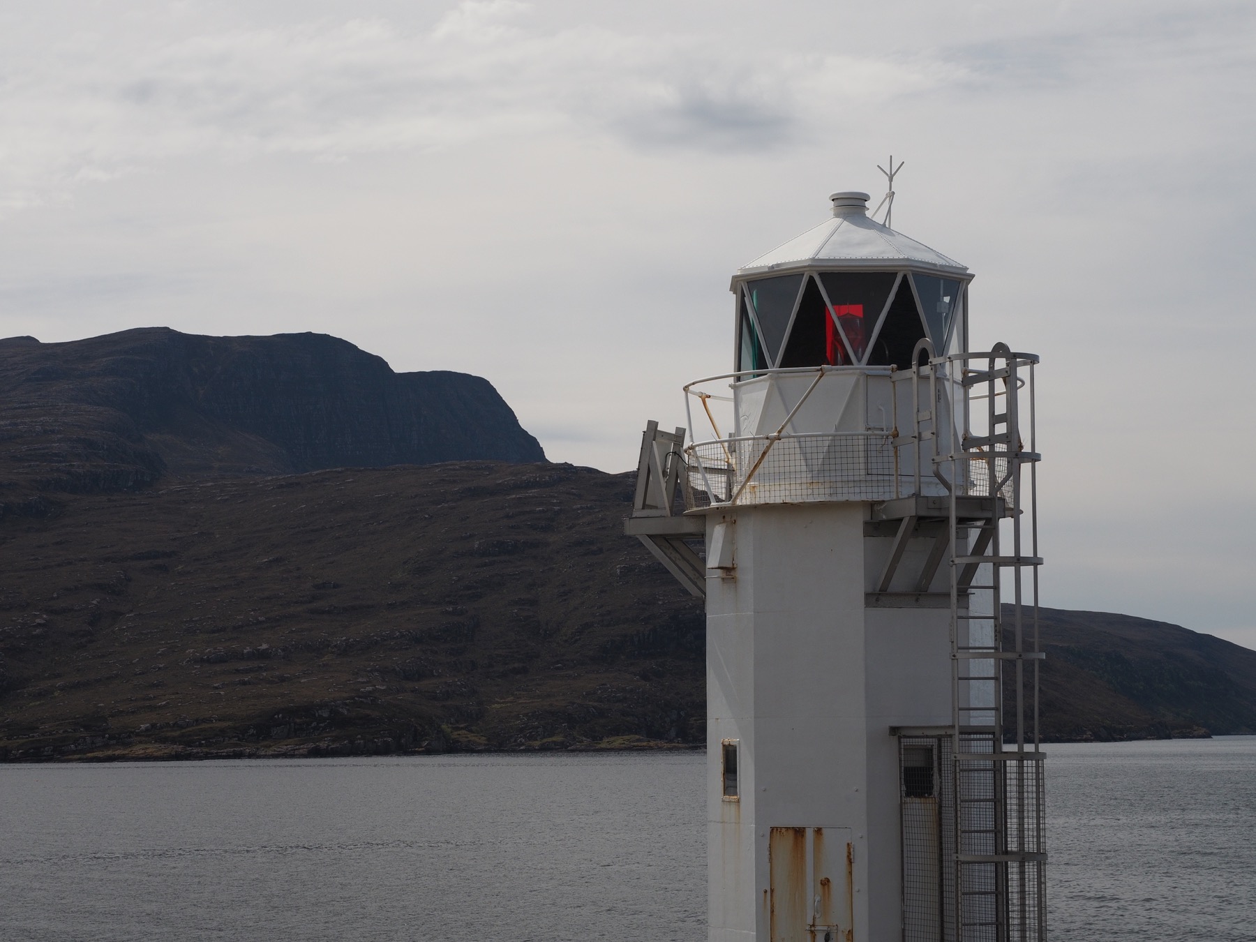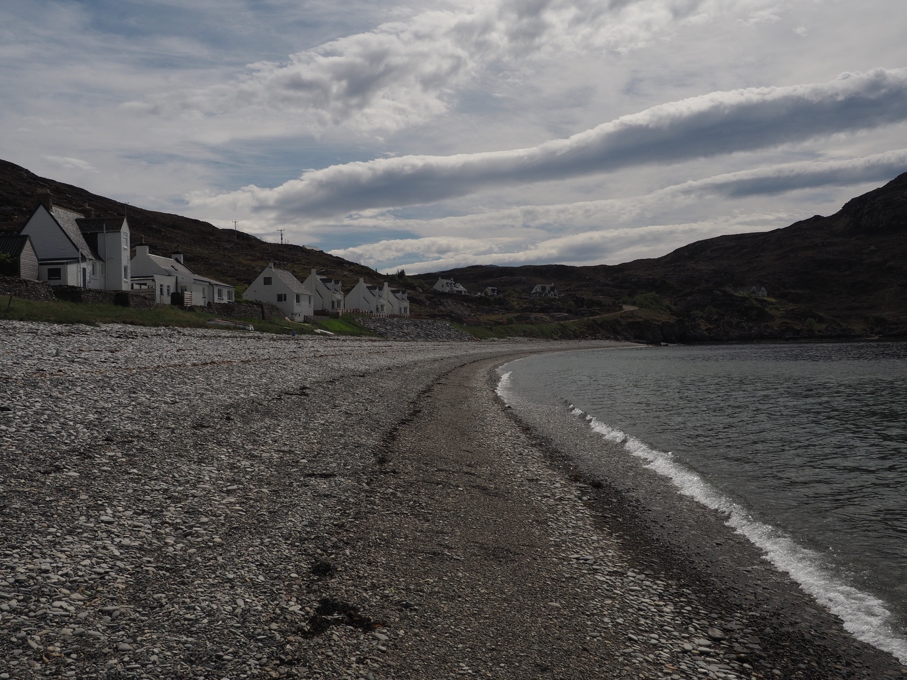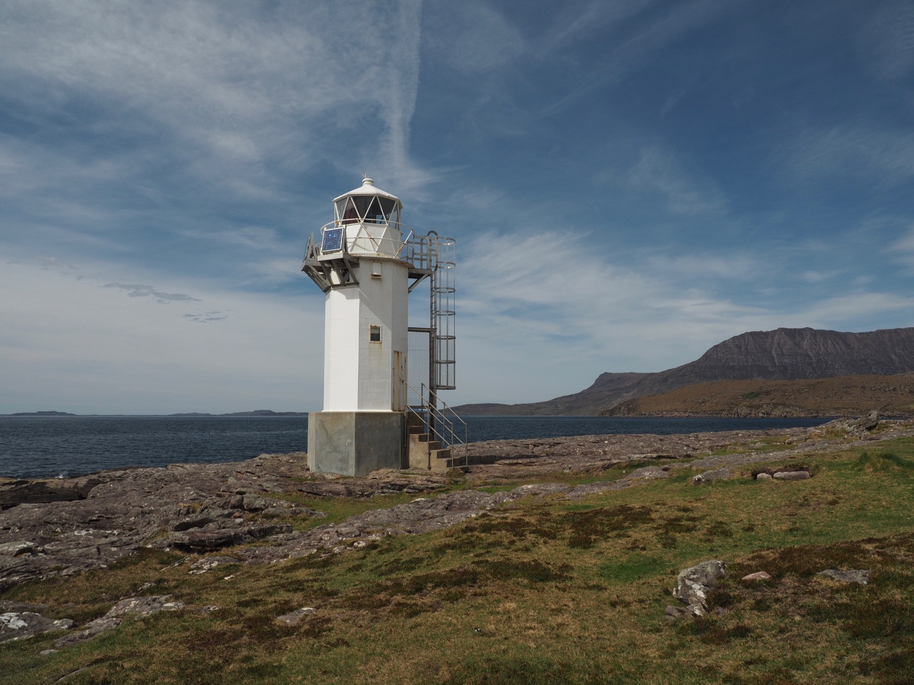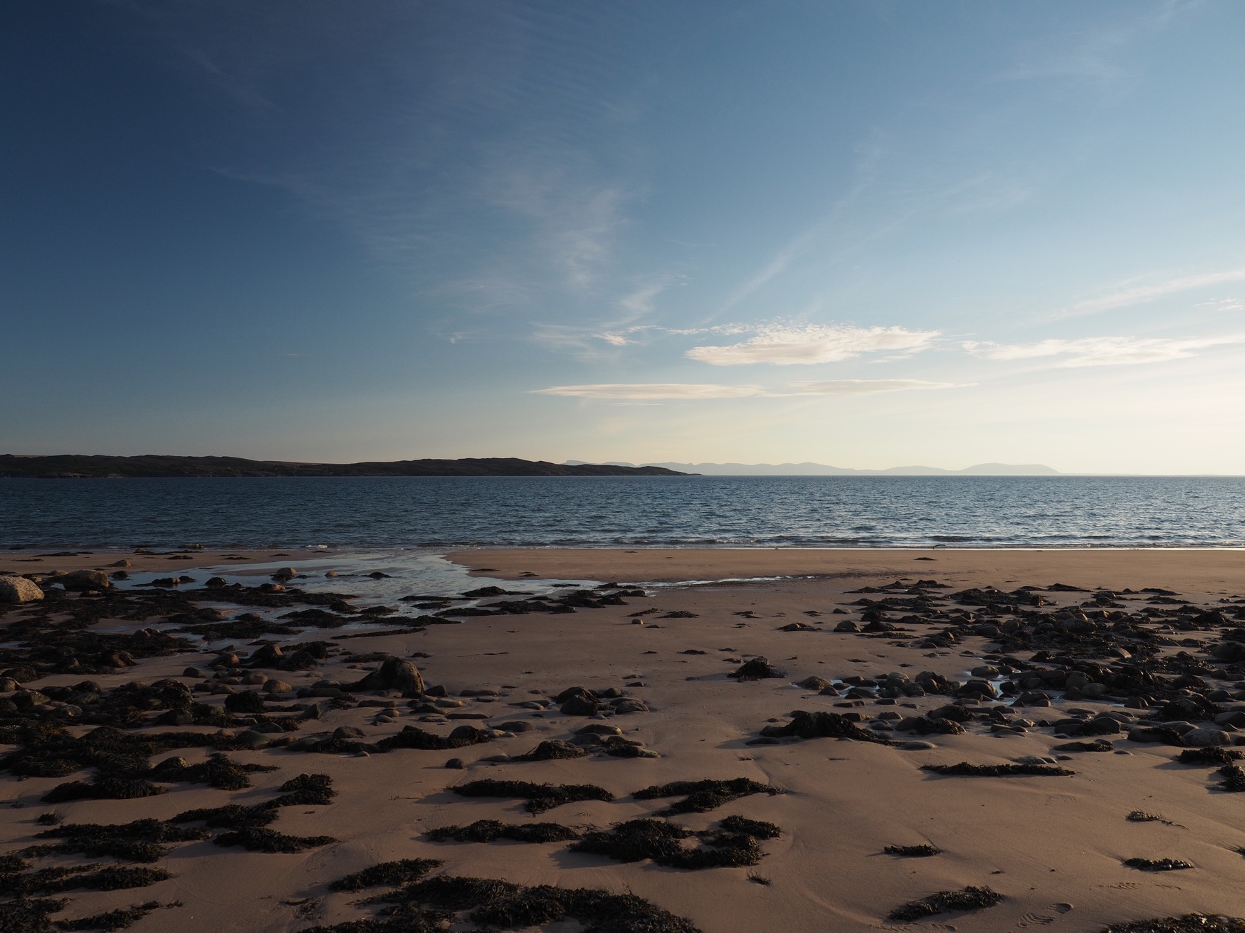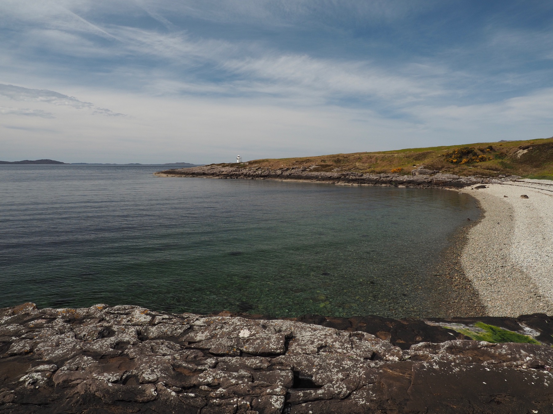 We first stopped along the side of A835 in Ardmair. There, we skipped pebbles from the rocky beach in Loch Canaird. Just a bit further along, we detoured to Rhue. There, we took a short walk along the coast to Rhue Lighthouse.