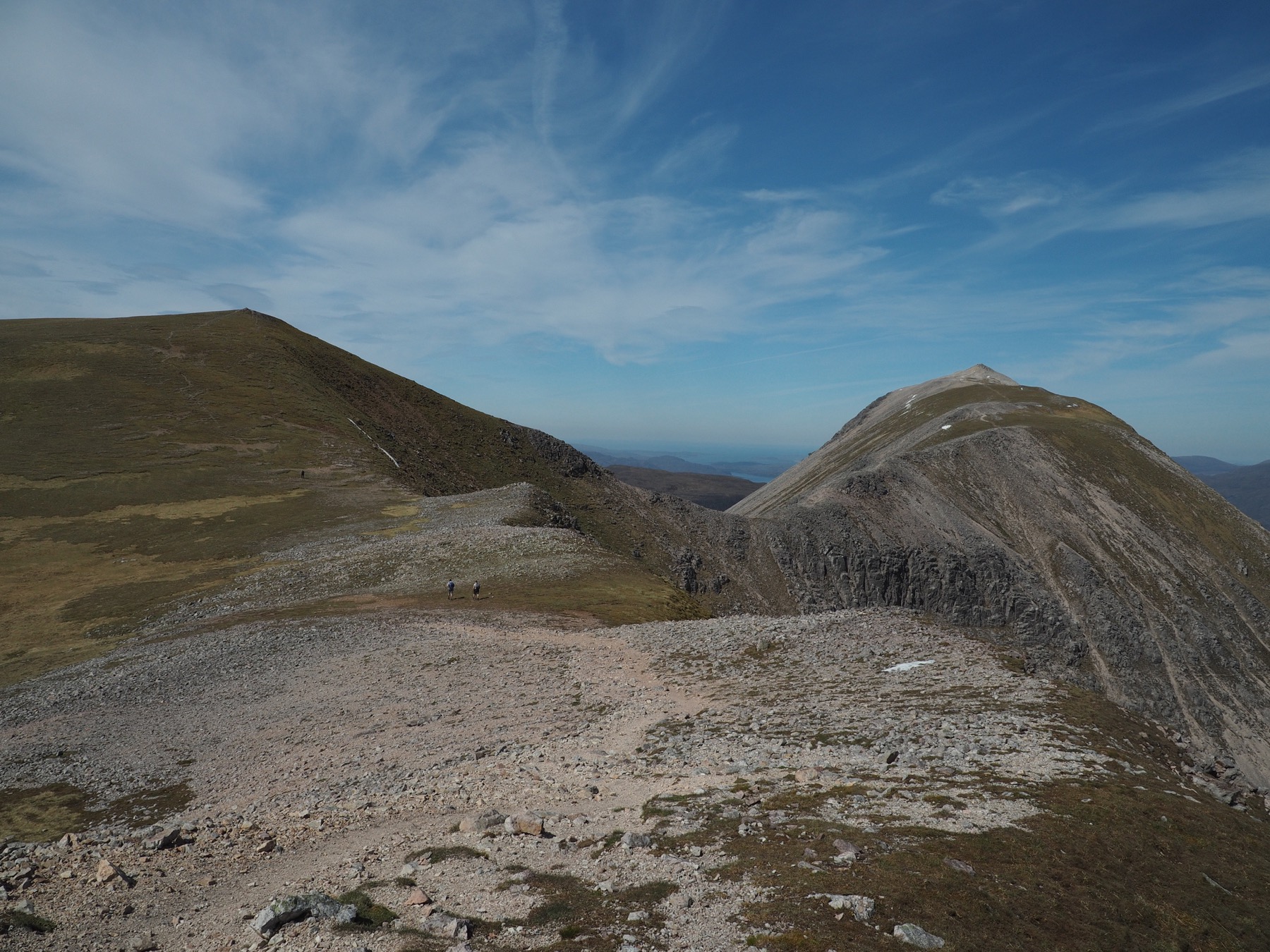 We again took a break for views at the summit. Eventually, we decided we should keep moving, and so we backtracked and then continued along the ridge. Along the way, we climbed, descended, and climbed again. After crossing a grassy slope, we again descended to a pass. To the left, a trail descended to Coire Mhic Fhearchair.