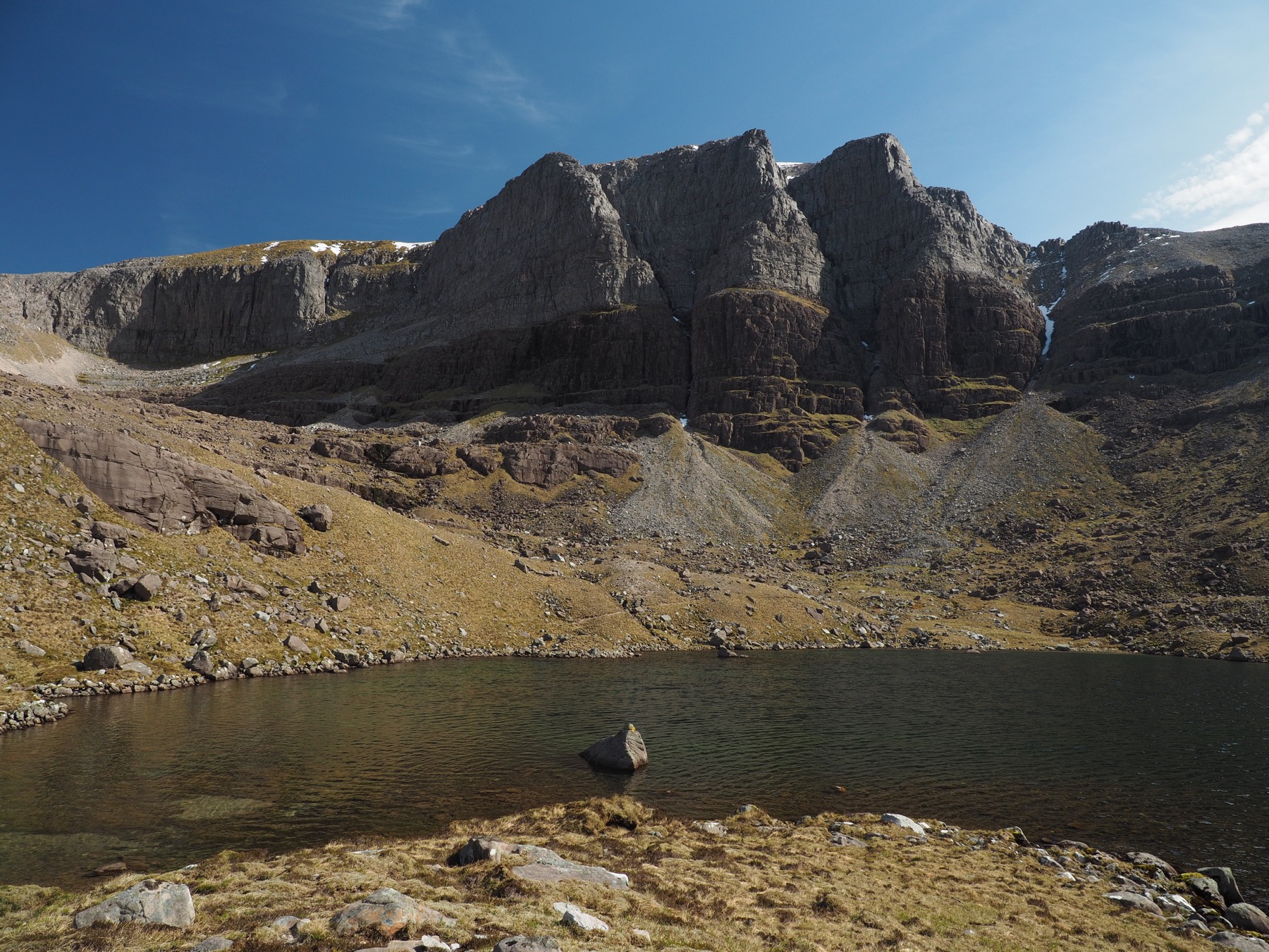 After time at the summit, we turned back to the pass. From the pass, the route descended steeply on scree. We worked to keep a safe distance between us and a group ahead of us, as it was very easy to kick rocks loose, and were glad to reach the boulder field at the bottom. From here, the loch was still a good distance away, and we picked our way among boulders, rocky shelves, waterfalls, and pools.