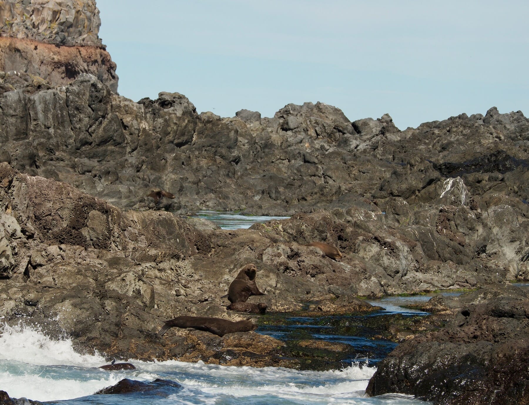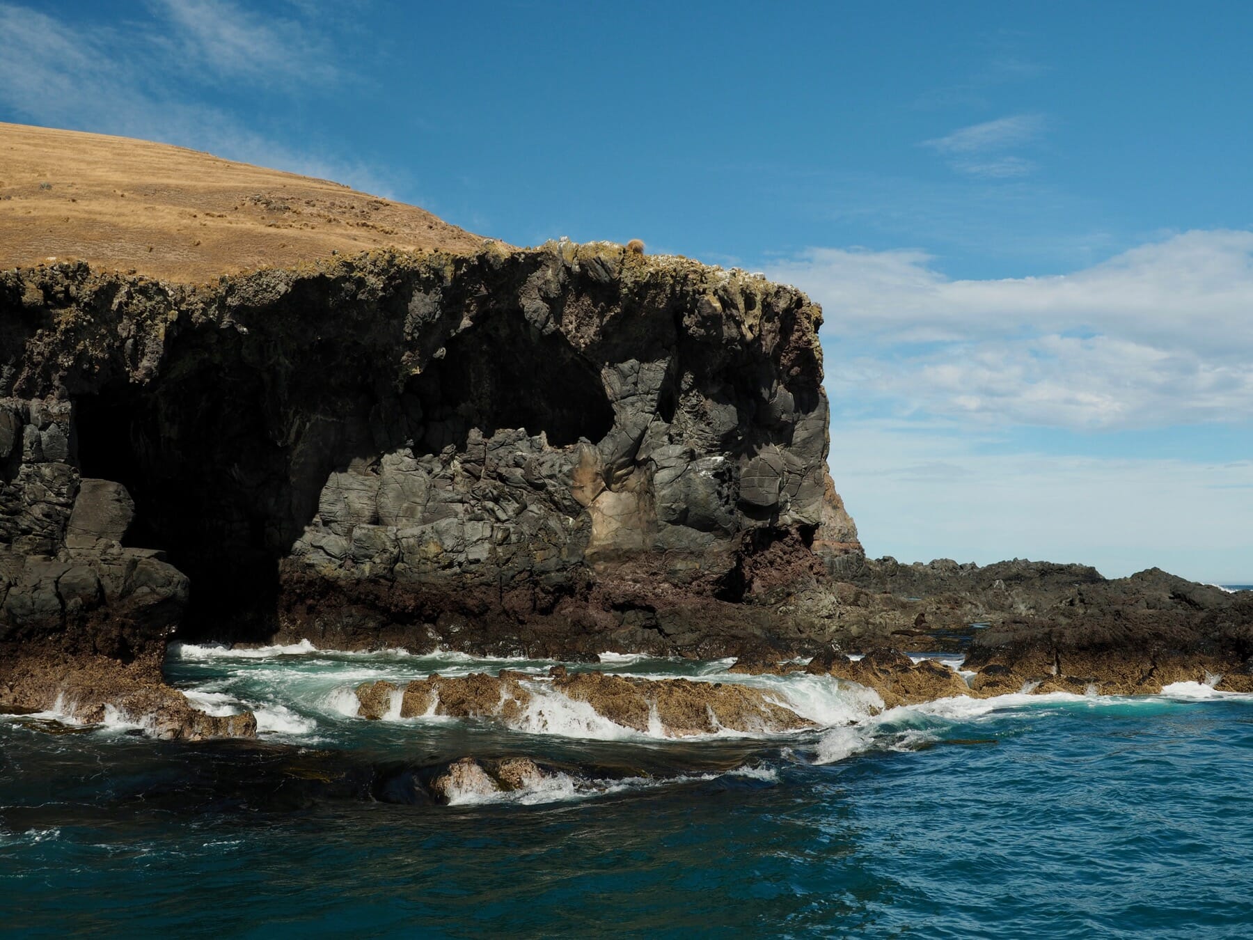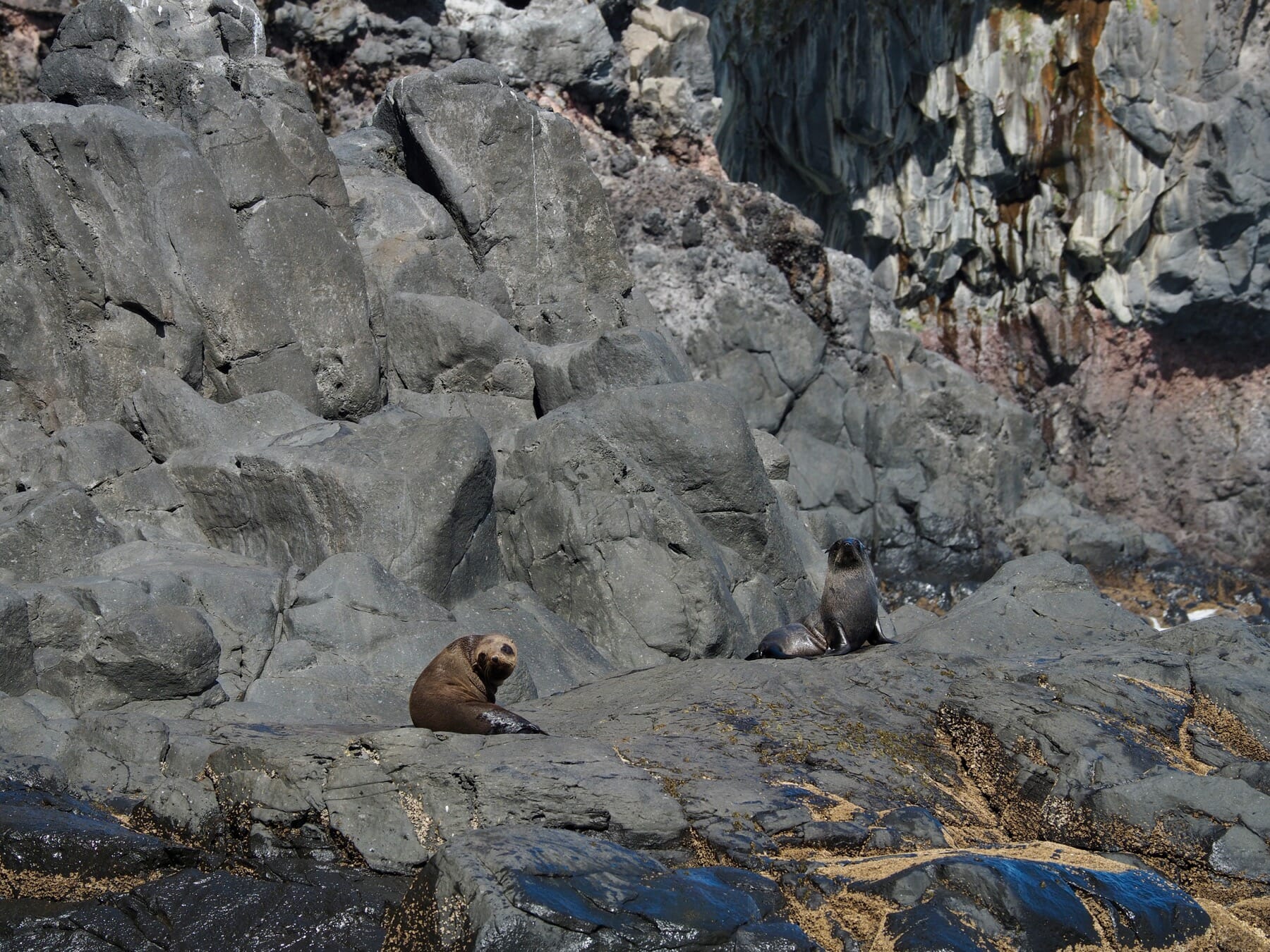 The crew then decided to try our luck out beyond the bay. Here, the cliffs got taller, exposing various oranges, browns, and yellows of rock. While we did not see any dolphins here either, we saw more penguins and several fur seals swimming and lounging on the rocks. The crew was apologetic that we had not found dolphins, but we were enjoying ourselves. I felt lucky to see the penguins, albatrosses, and seals. The scenery was also stunning.