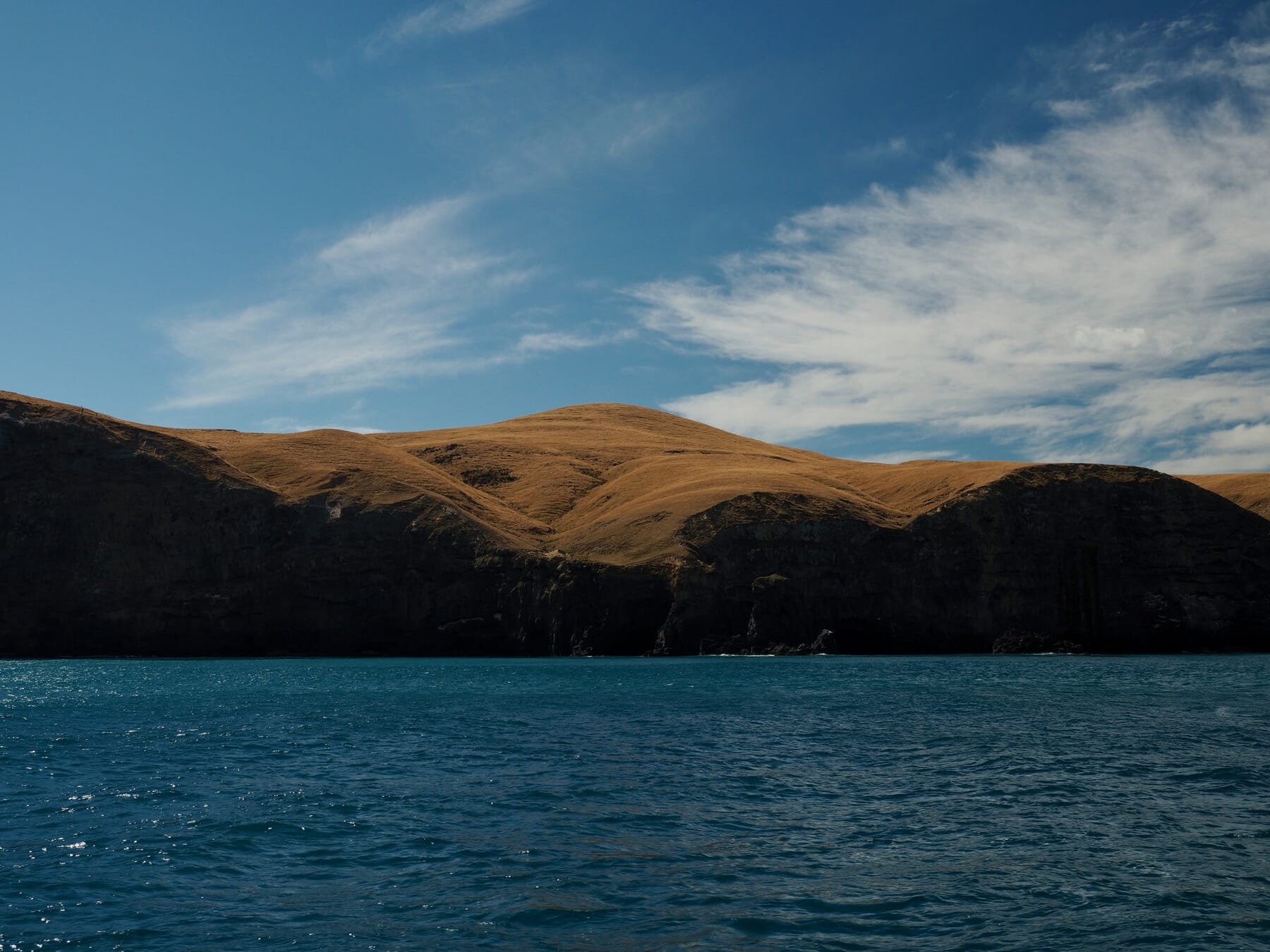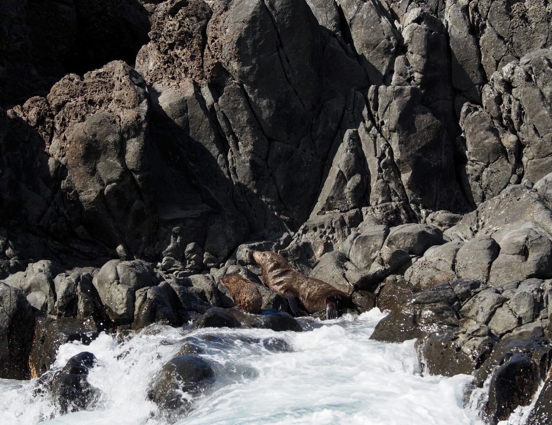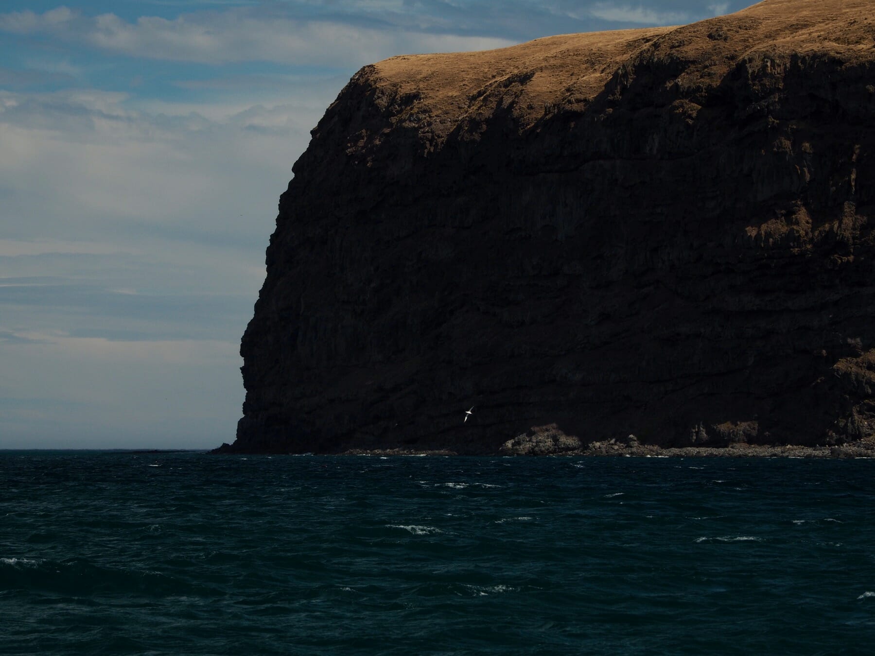 The crew then decided to try our luck out beyond the bay. Here, the cliffs got taller, exposing various oranges, browns, and yellows of rock. While we did not see any dolphins here either, we saw more penguins and several fur seals swimming and lounging on the rocks. The crew was apologetic that we had not found dolphins, but we were enjoying ourselves. I felt lucky to see the penguins, albatrosses, and seals. The scenery was also stunning.