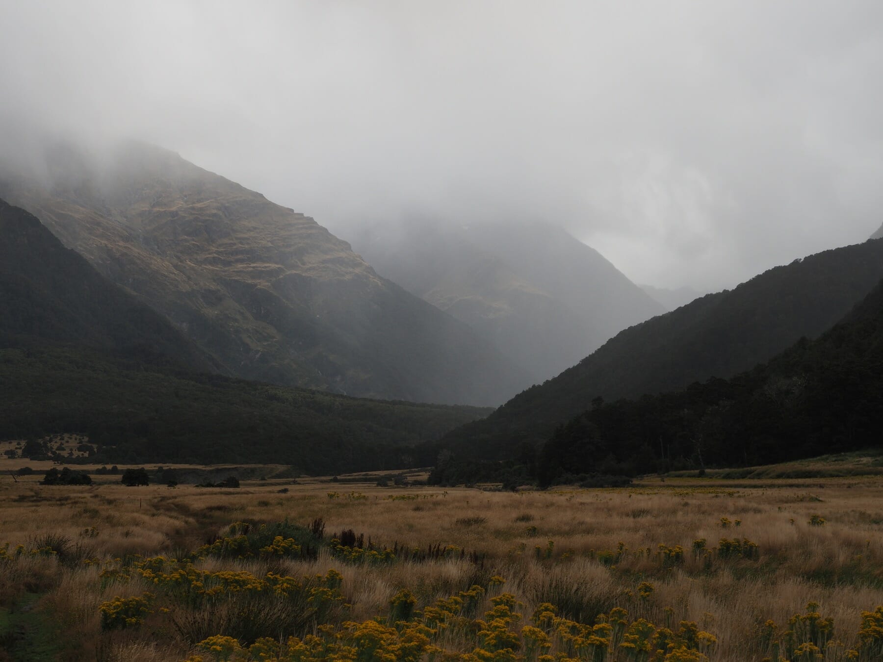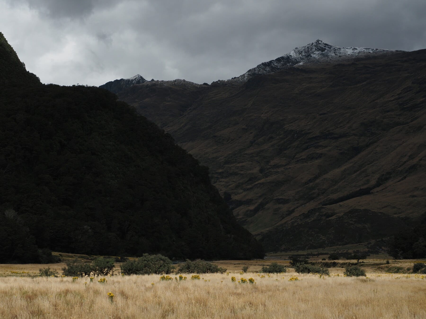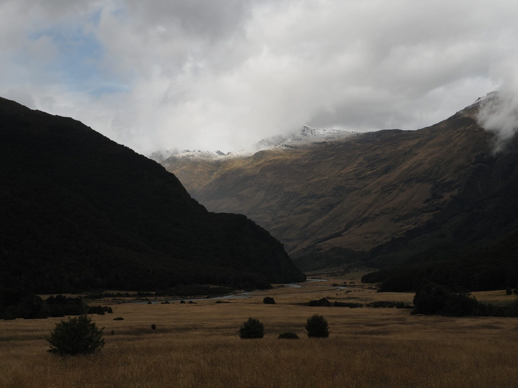 Over a delicious breakfast at Relishes Café, we debated options. We decided on the West Matukituki Track. If the weather cleared, we could branch off from it to climb Shotover Saddle or Cascade Saddle. Cascade Saddle seemed particularly unlikely: based on descriptions we read, even if the sun came out, the snow grass would probably not dry enough for us to feel safe. Alternatively, if the weather stayed poor, we could explore further up the West Matukituki valley, as far as Pearl Flat, Shovel Flat, or beyond.