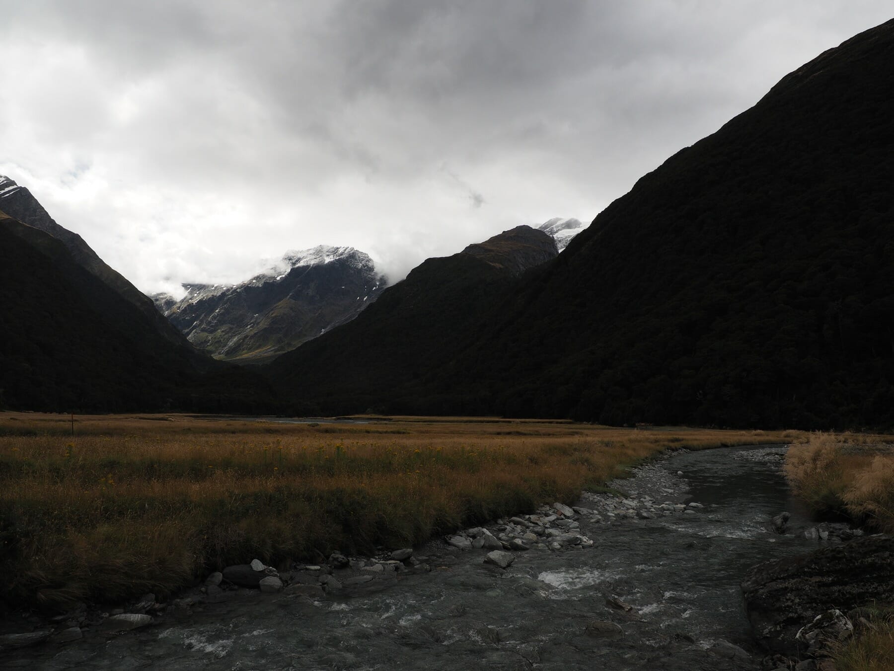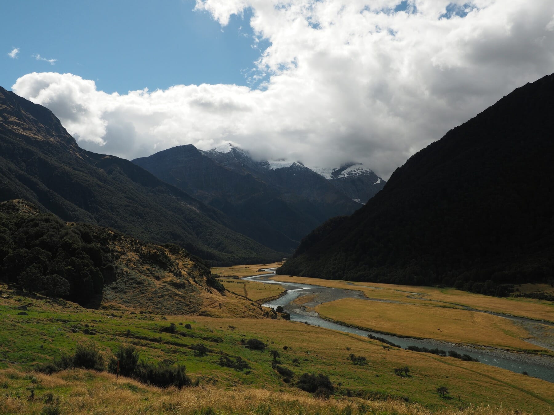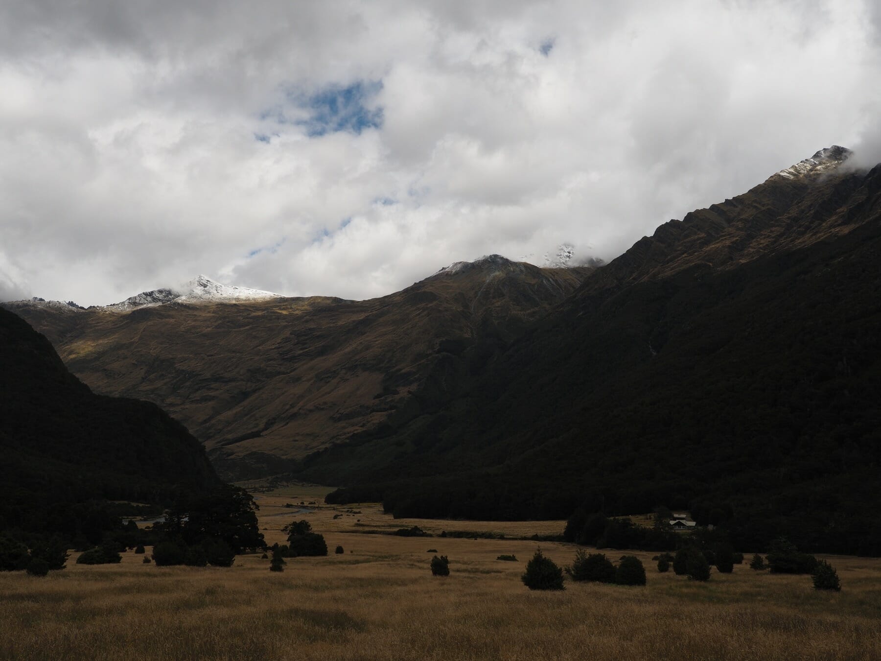 Over a delicious breakfast at Relishes Café, we debated options. We decided on the West Matukituki Track. If the weather cleared, we could branch off from it to climb Shotover Saddle or Cascade Saddle. Cascade Saddle seemed particularly unlikely: based on descriptions we read, even if the sun came out, the snow grass would probably not dry enough for us to feel safe. Alternatively, if the weather stayed poor, we could explore further up the West Matukituki valley, as far as Pearl Flat, Shovel Flat, or beyond.