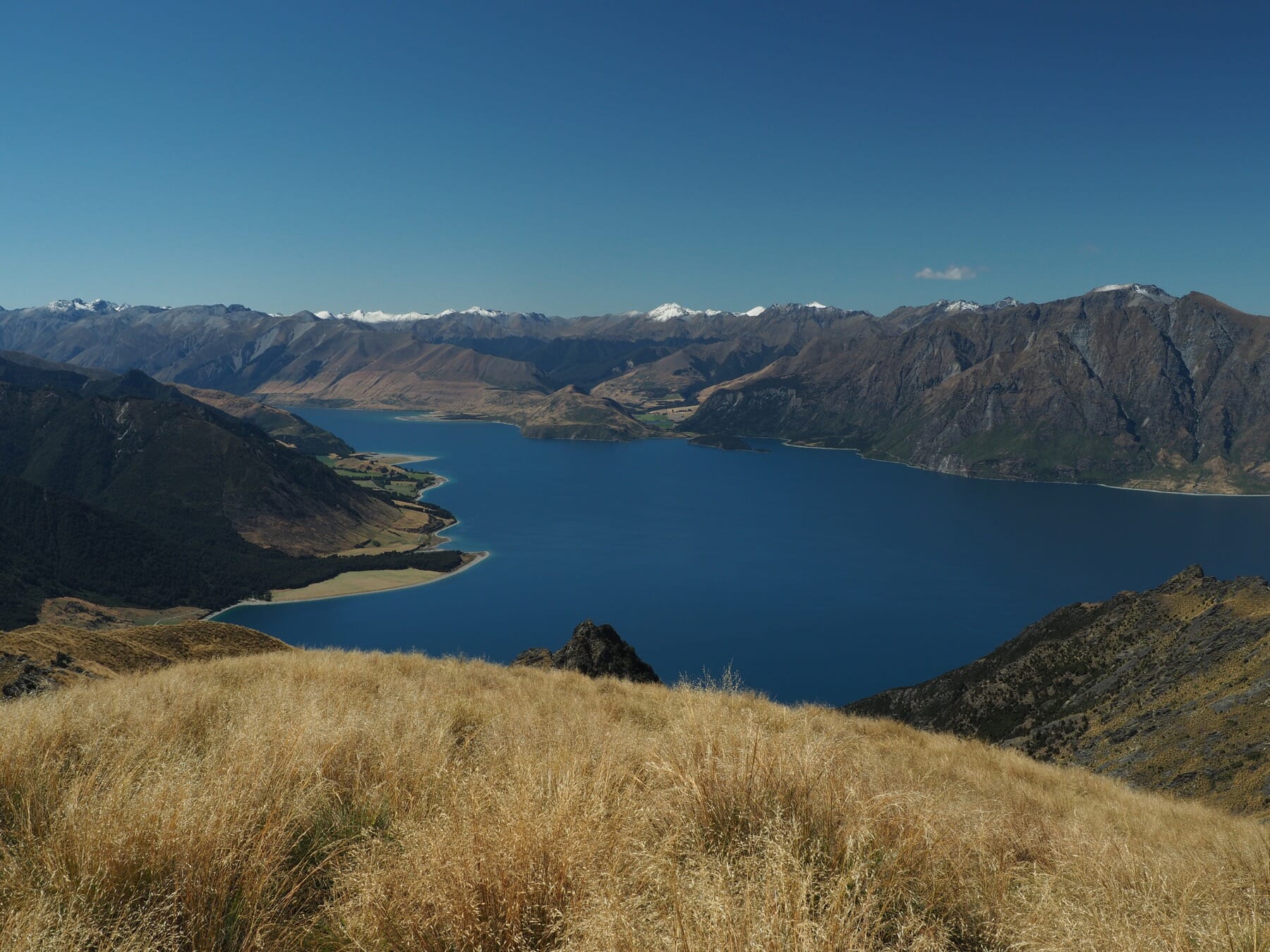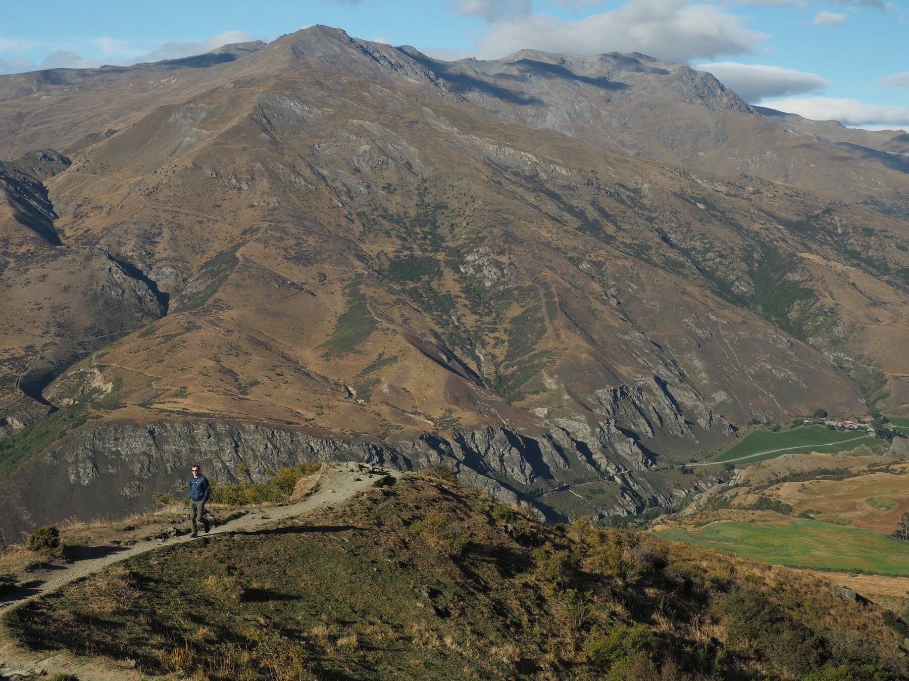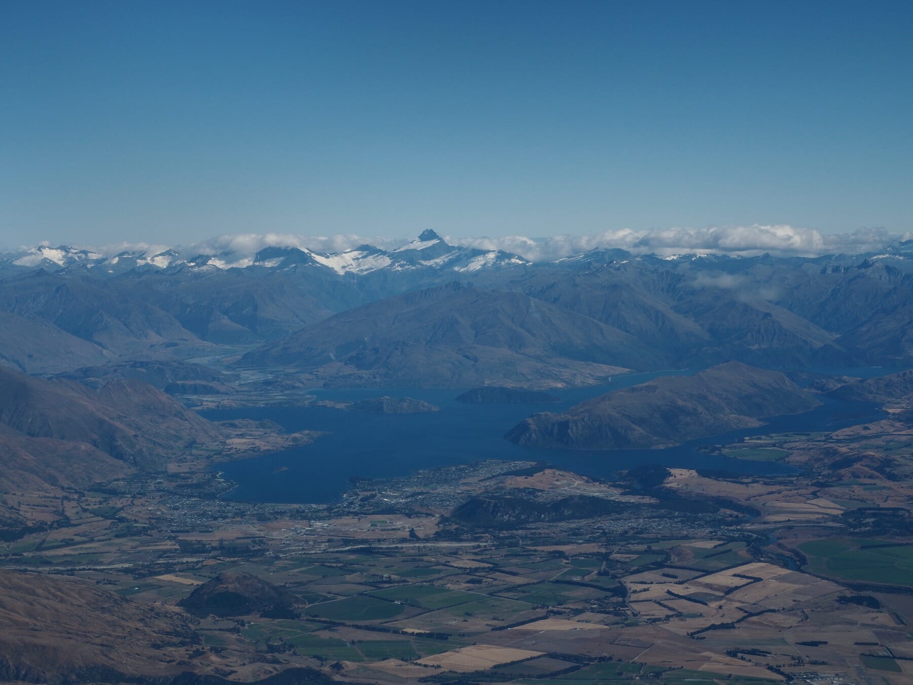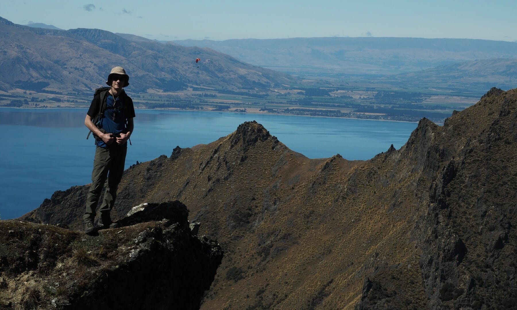 Within another half hour, we broke out of the forest and joined a 4WD track. From here, the views got better and better the more we climbed. The day also grew hotter. Eventually, we reached a ridge that brought us the last bit to the summit. From the summit, we had 360º views of the lakes, back to Wanaka, and into Mount Aspiring National Park. We also could see parasailers overhead — and below.