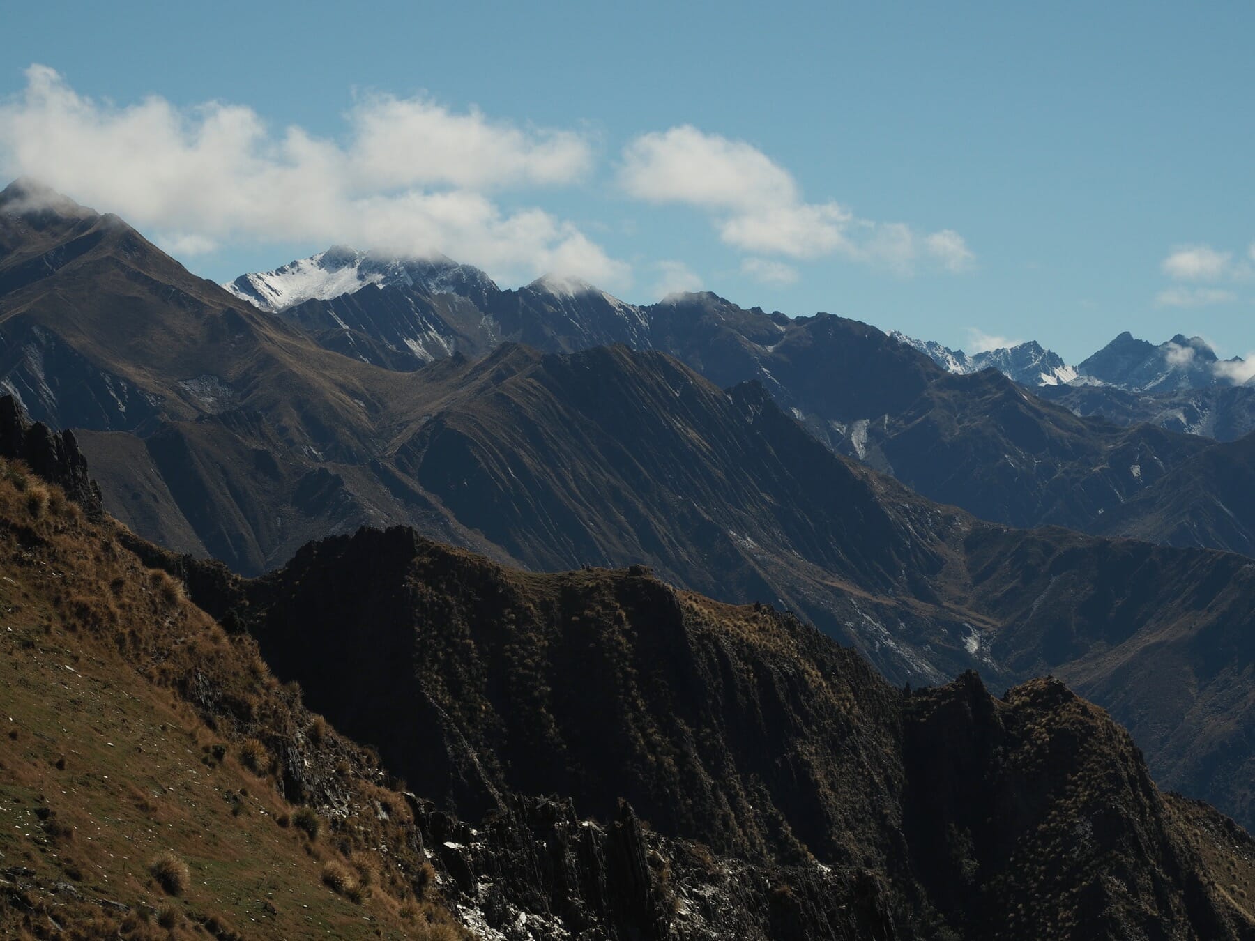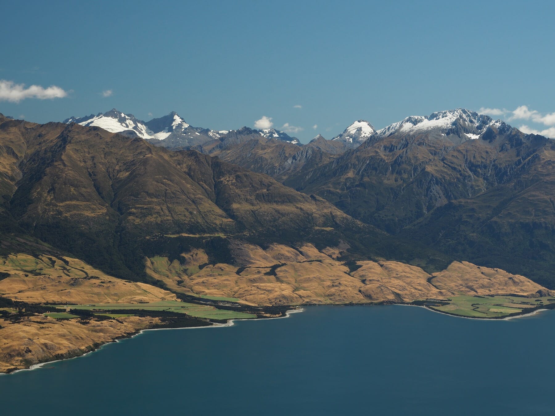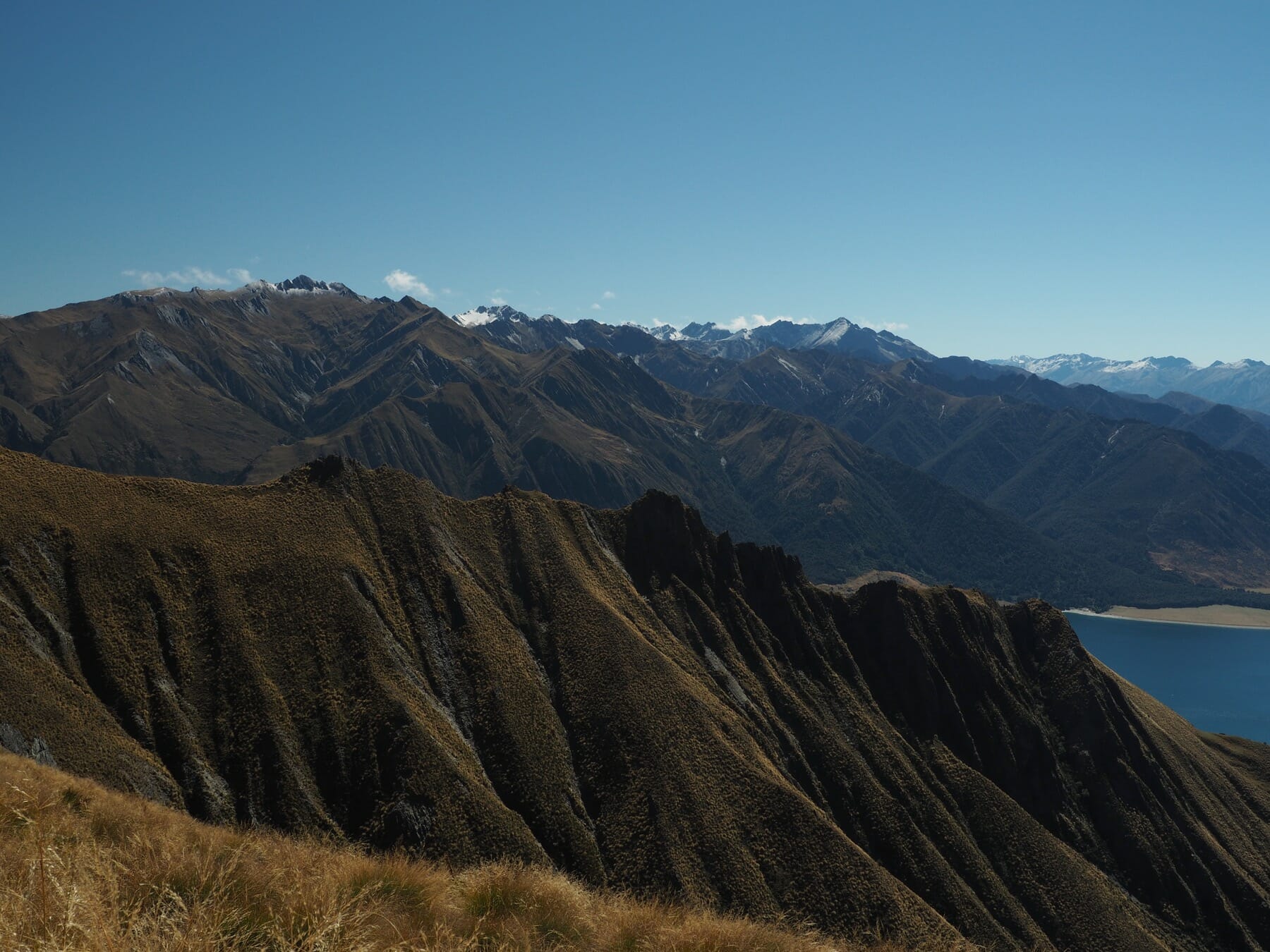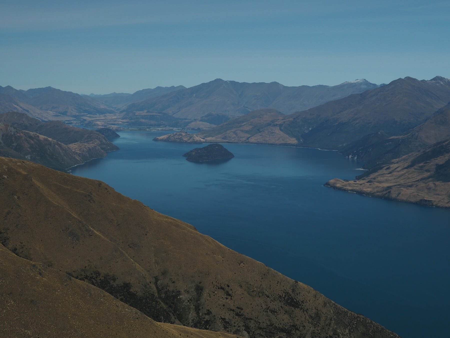 Within another half hour, we broke out of the forest and joined a 4WD track. From here, the views got better and better the more we climbed. The day also grew hotter. Eventually, we reached a ridge that brought us the last bit to the summit. From the summit, we had 360º views of the lakes, back to Wanaka, and into Mount Aspiring National Park. We also could see parasailers overhead — and below.