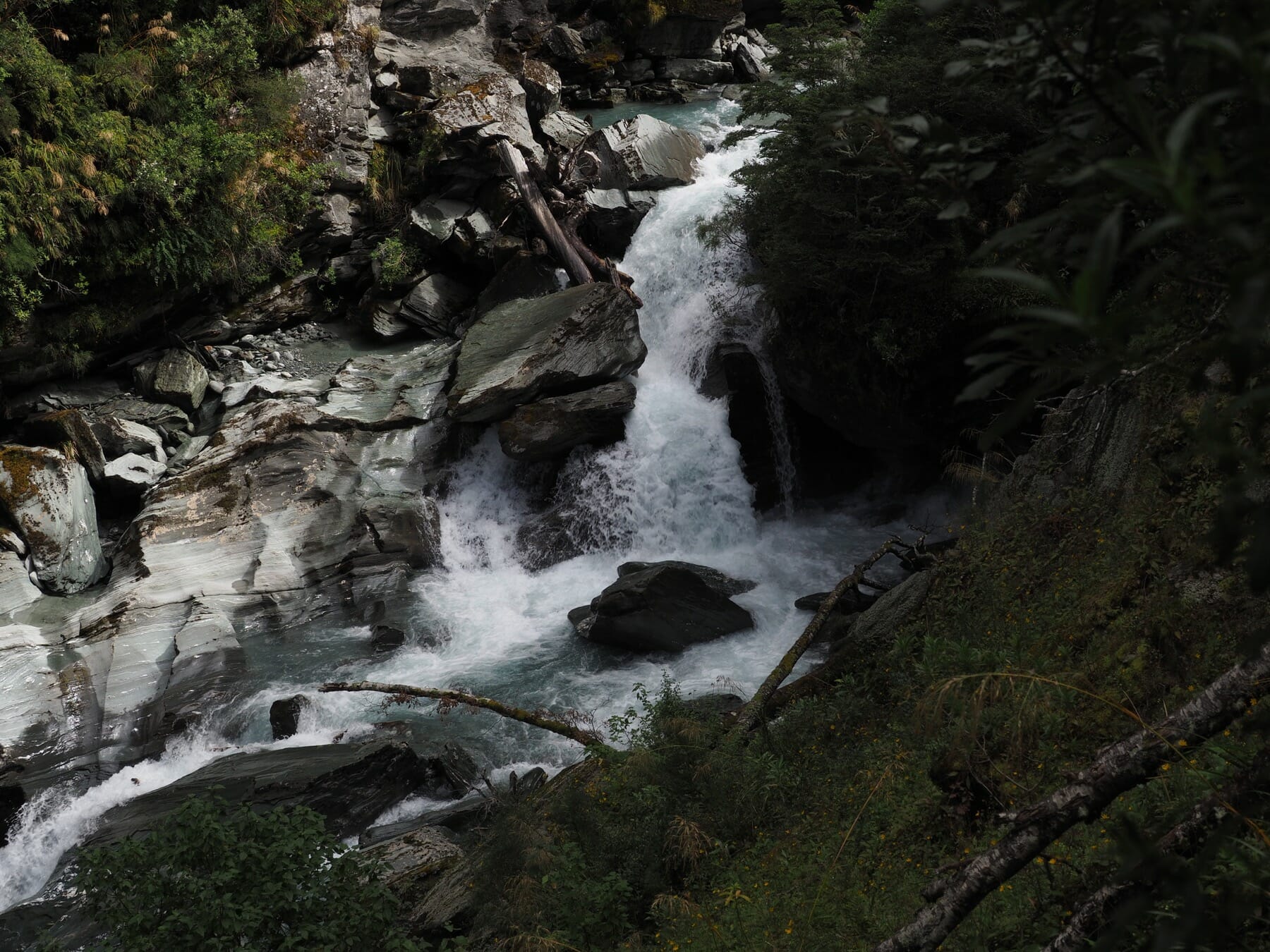 Nearer to Aspiring Hut, the trail meandered in and out of wooded areas. Just before we reached the hut, the rain intensified, so we were happy to arrive and dry off. We ate lunch in the hut’s dining room, overlooking the valley though large windows. The ranger came through to check in evening guests. We chatted a bit about options, and she concurred that it was not a good day for either of the saddles. She noted, though, that the rain would make the waterfalls visible from Shovel and Pearl Flats particularly beautiful. So, once the rain broke, we set off further up the valley.