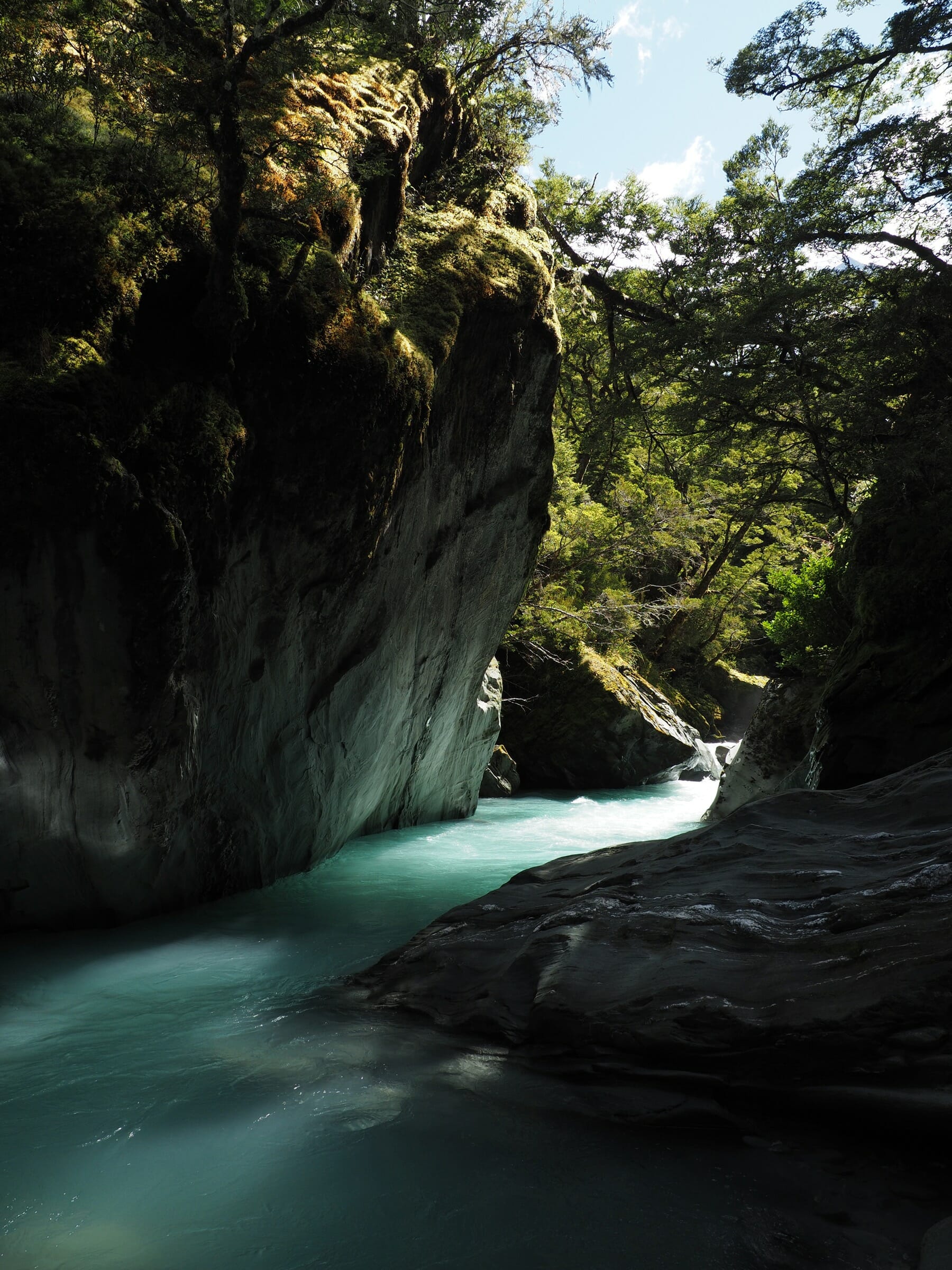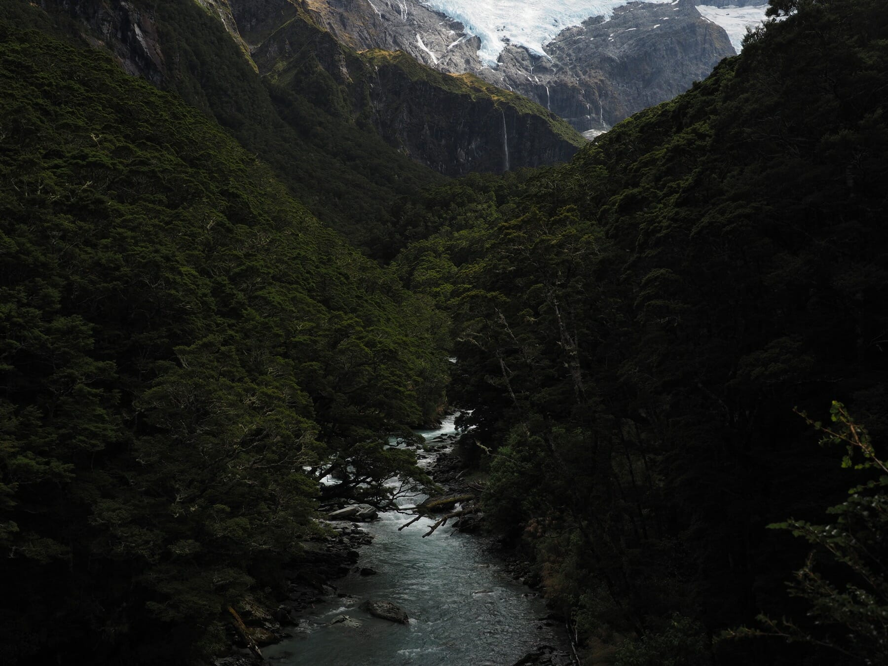 From the Raspberry Flat carpark, the trail followed the wide West Matukituki down the valley for a ways. After about 15 minutes, the trail reached a junction and a swing bridge that marked our turn off. From there, the trail climbed to a view of the West Matukituki valley. It then entered the woods, paralleling the beautiful blue Rob Roy stream.