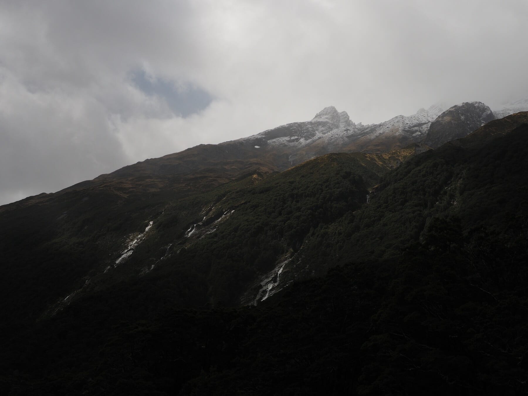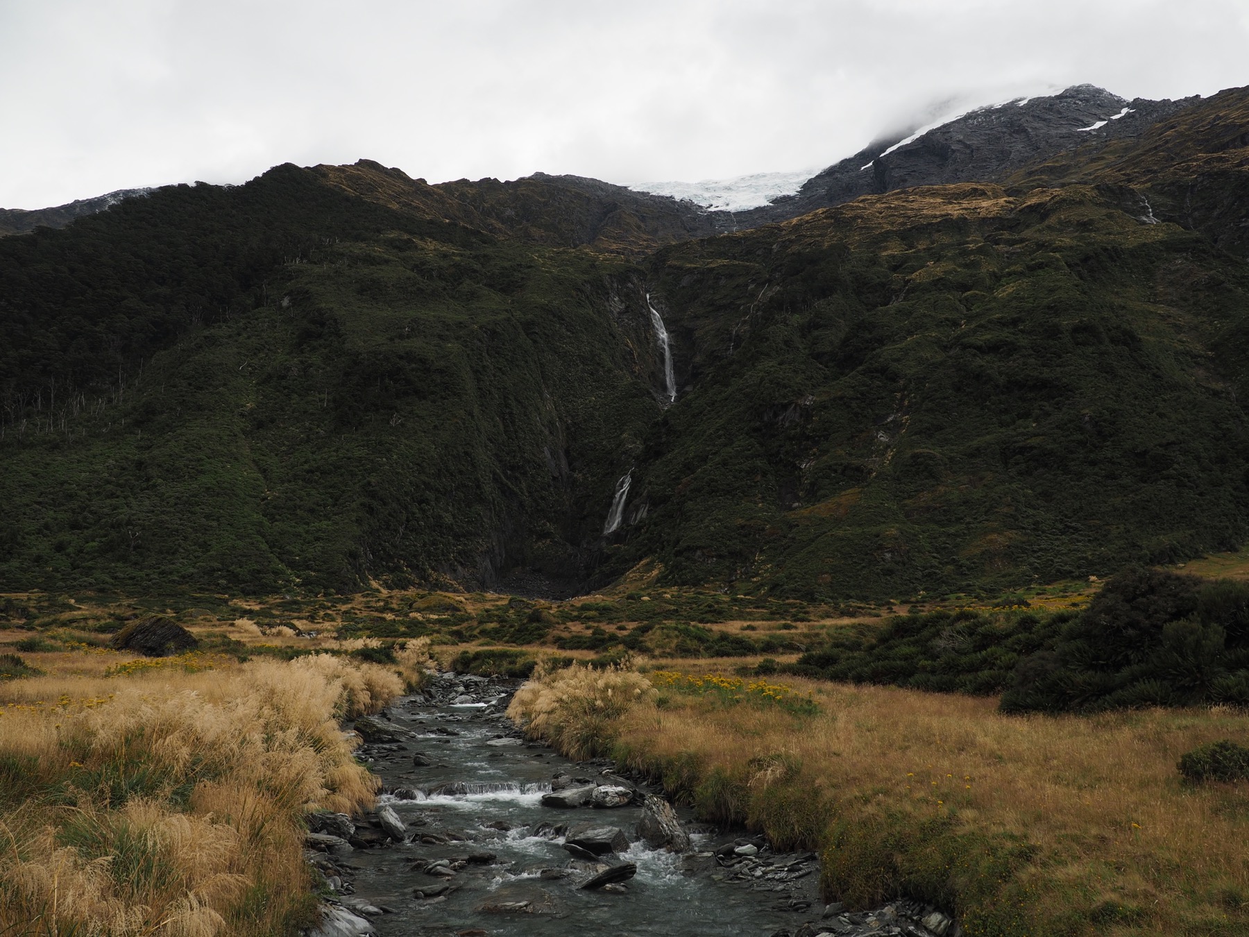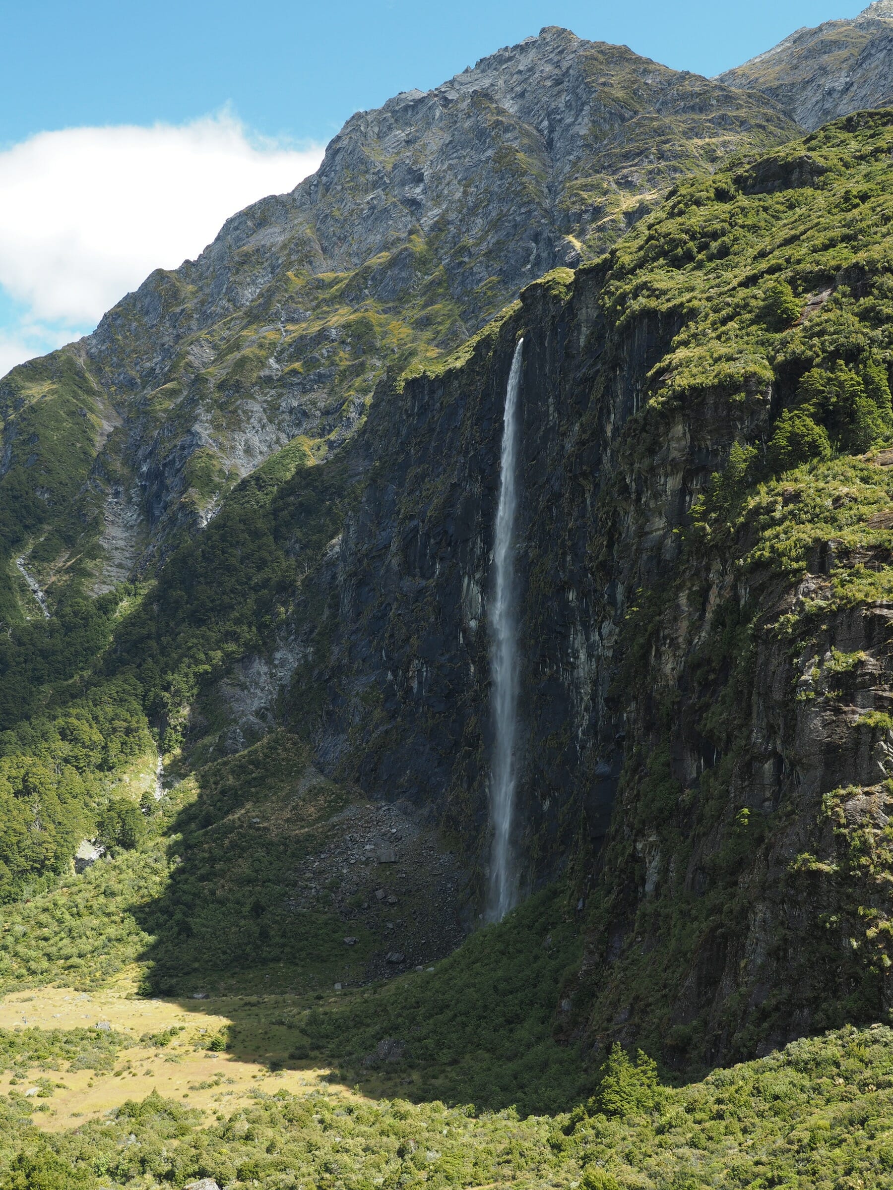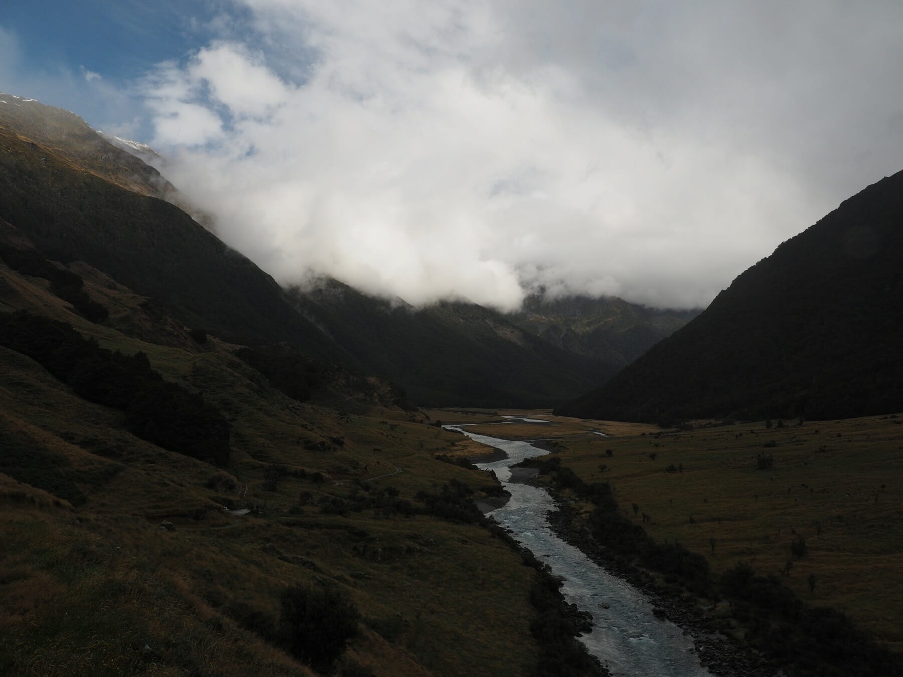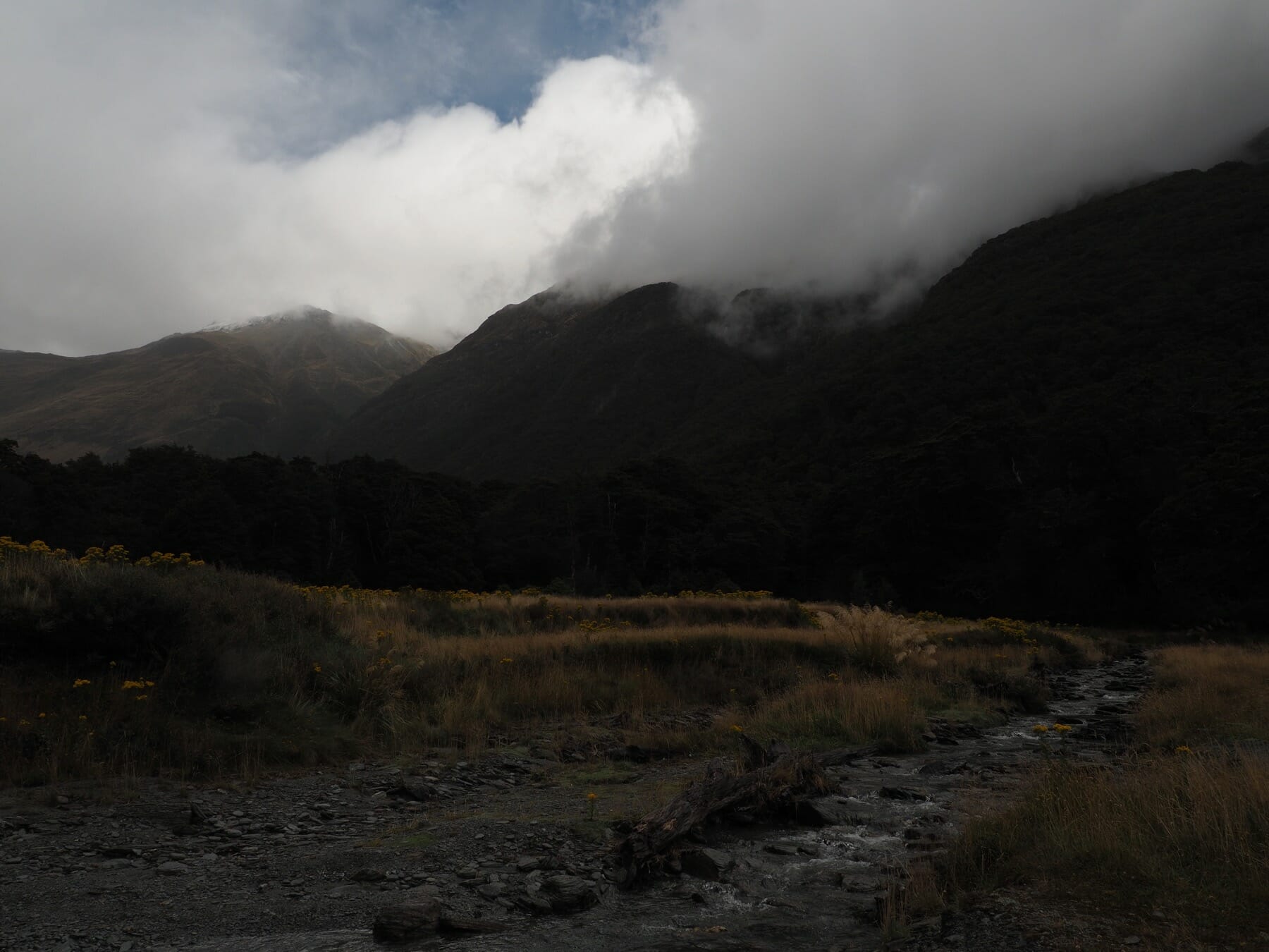 A short further descent brought us to the start of Pearl Flat, where we were surrounded by mountains and waterfalls. Through the clouds, we could glimpse the Liverpool and French Ridge huts. Destinations, perhaps, for a future trip.