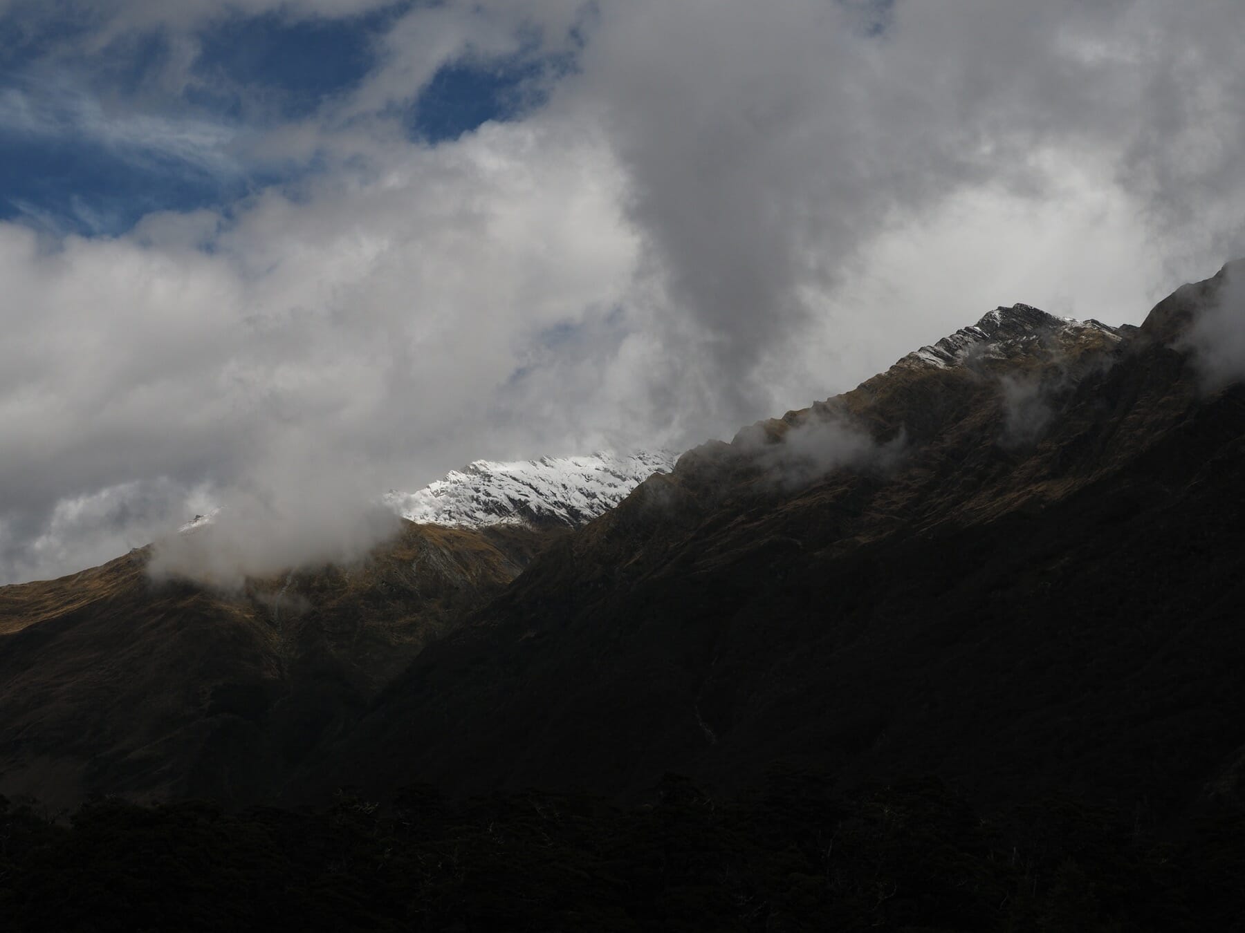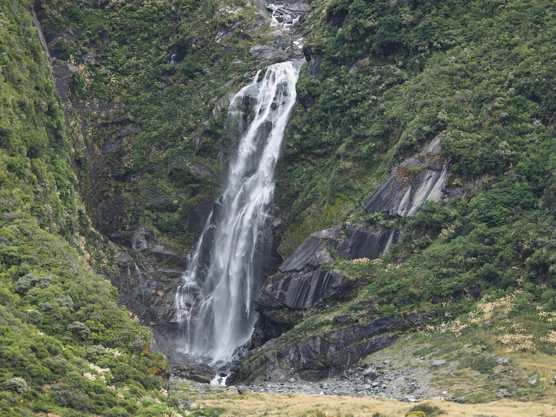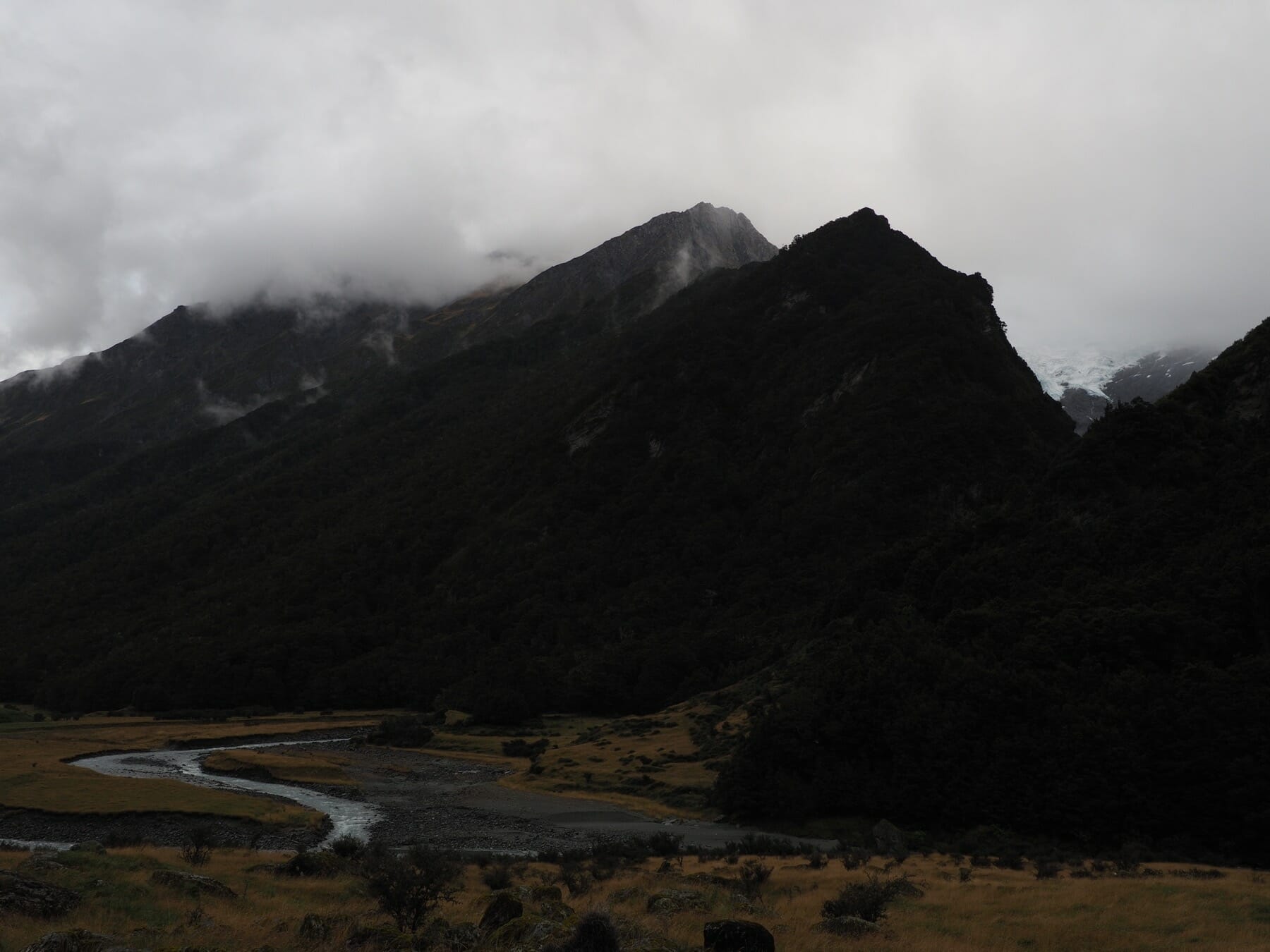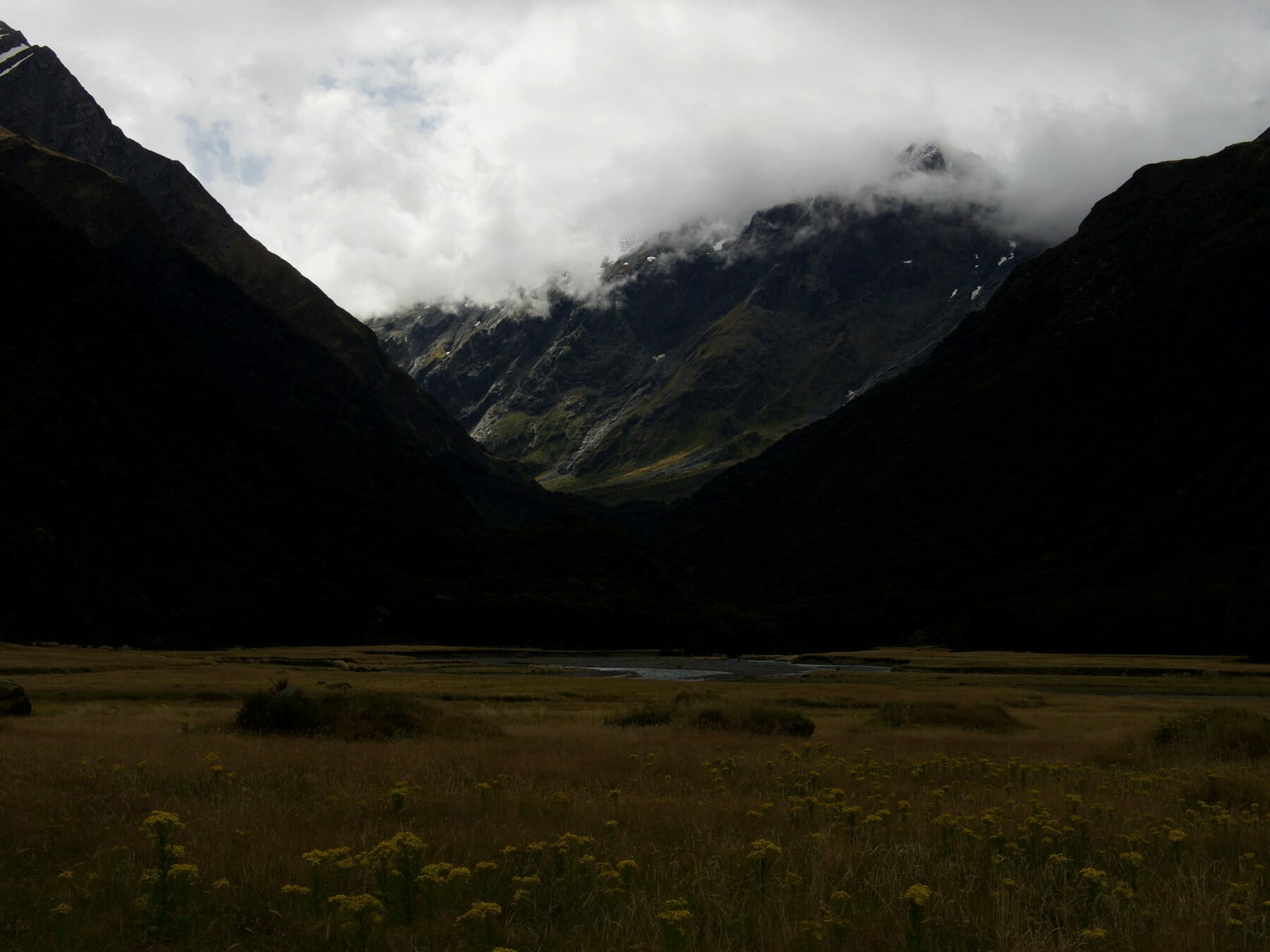 A short further descent brought us to the start of Pearl Flat, where we were surrounded by mountains and waterfalls. Through the clouds, we could glimpse the Liverpool and French Ridge huts. Destinations, perhaps, for a future trip.