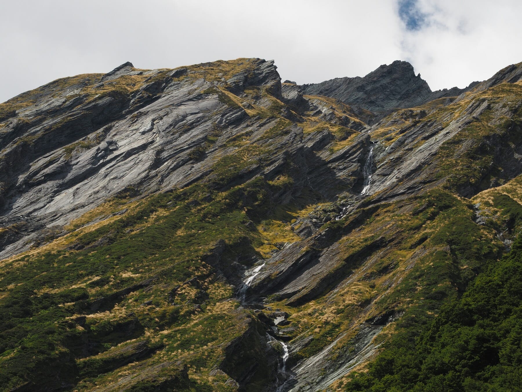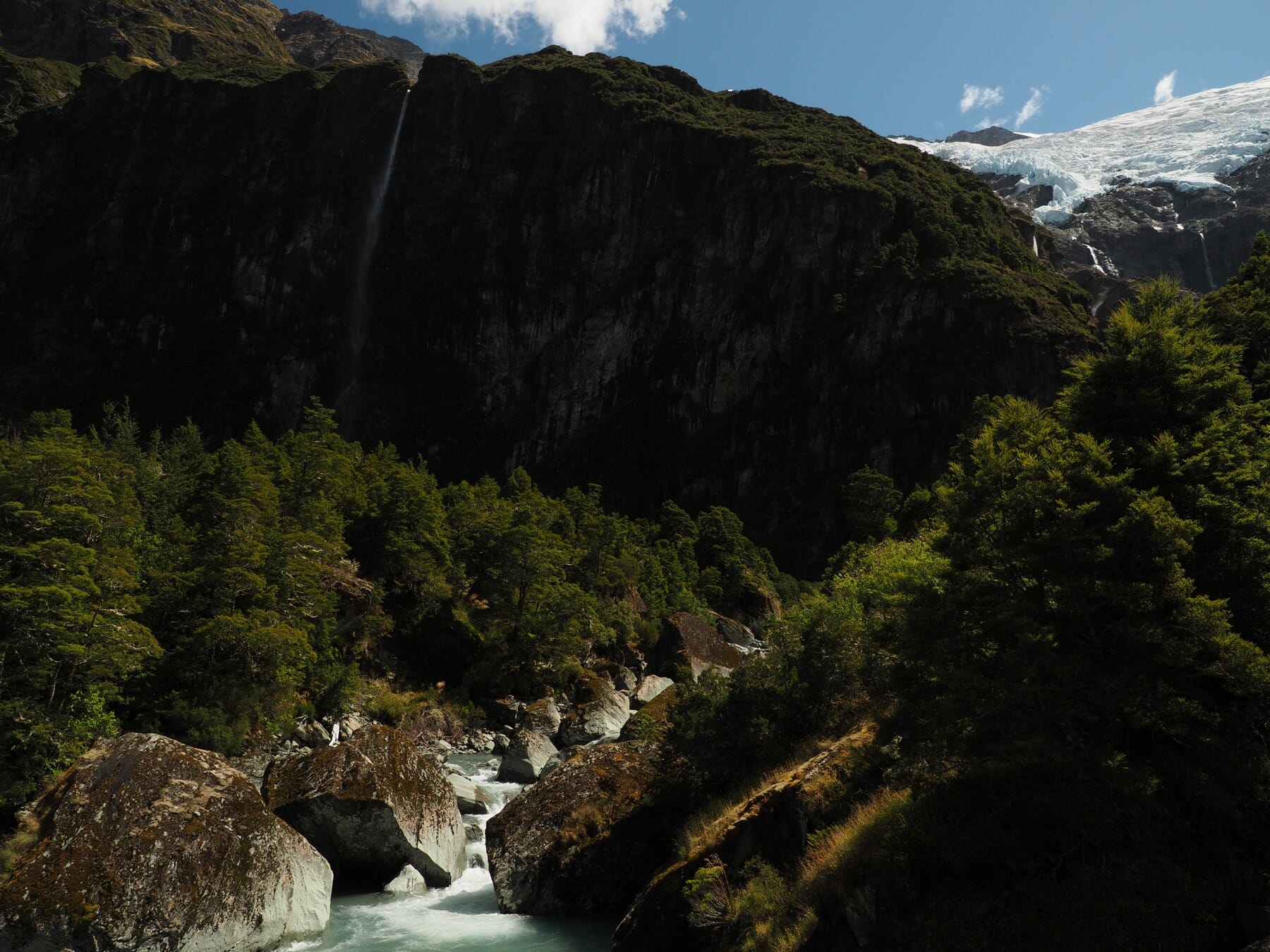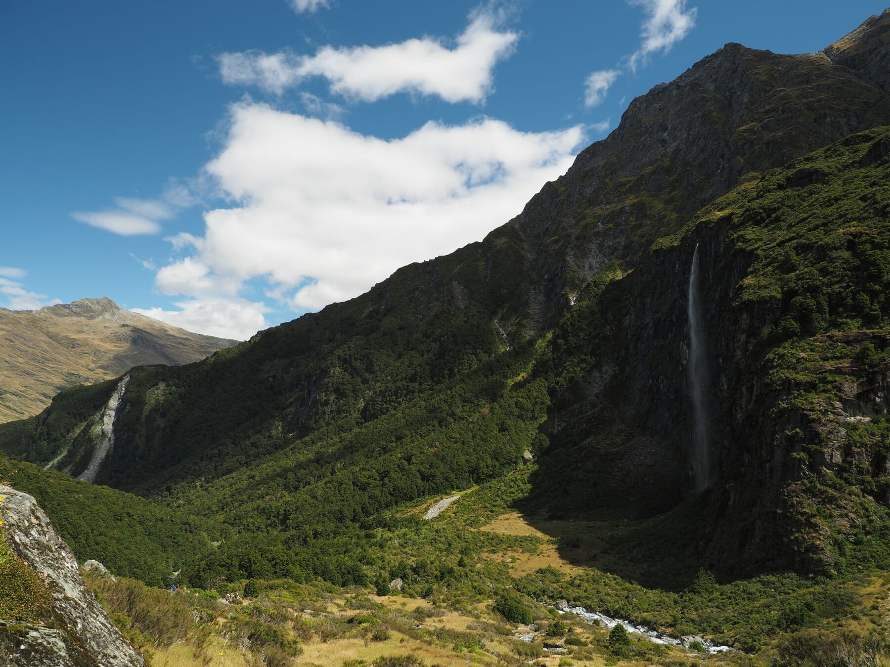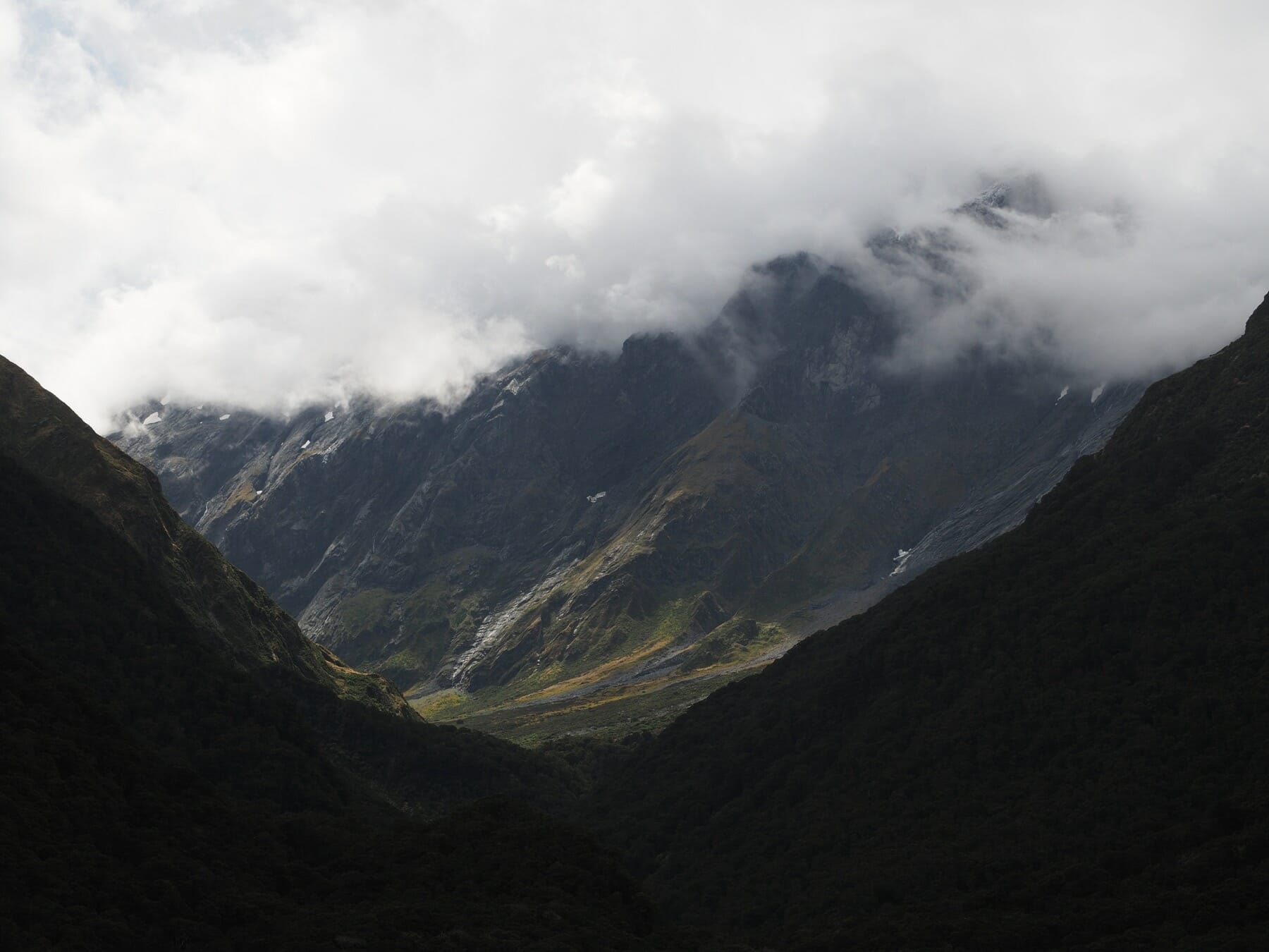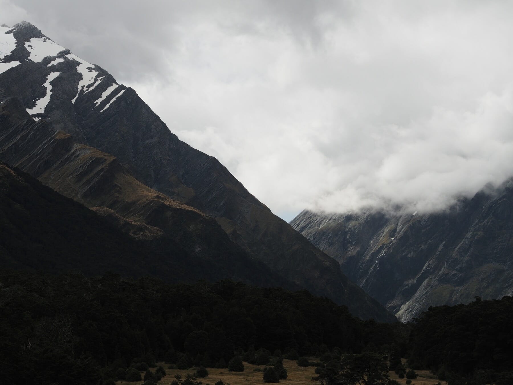 A short further descent brought us to the start of Pearl Flat, where we were surrounded by mountains and waterfalls. Through the clouds, we could glimpse the Liverpool and French Ridge huts. Destinations, perhaps, for a future trip.