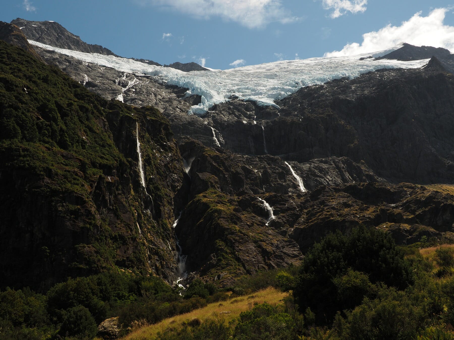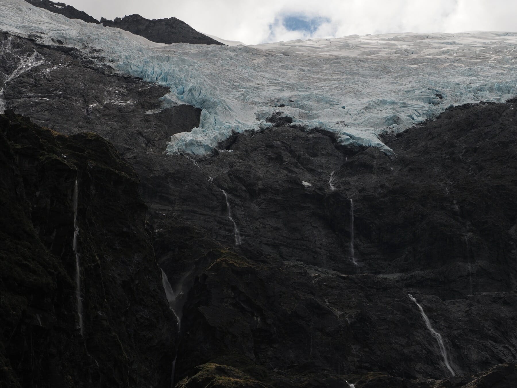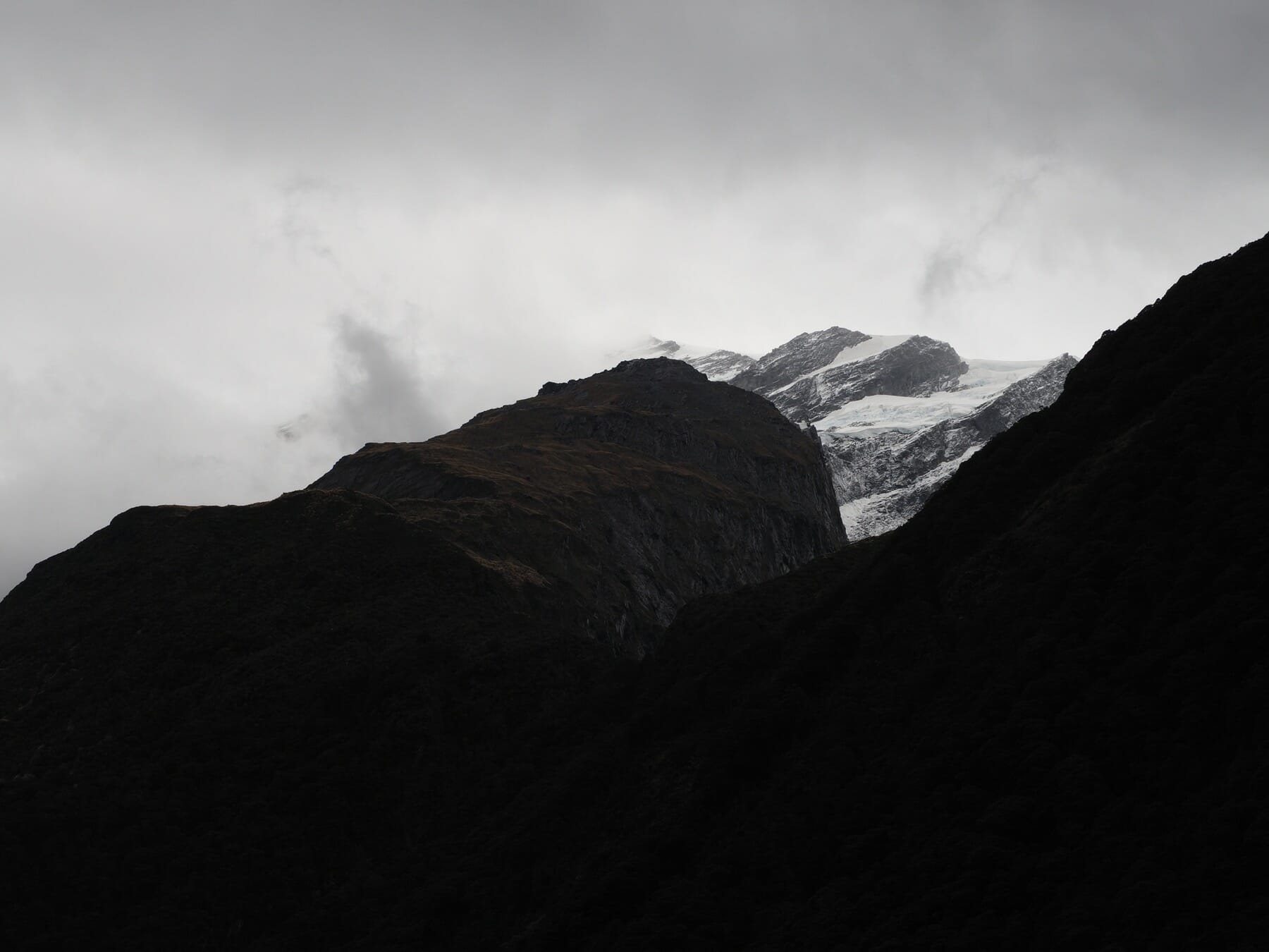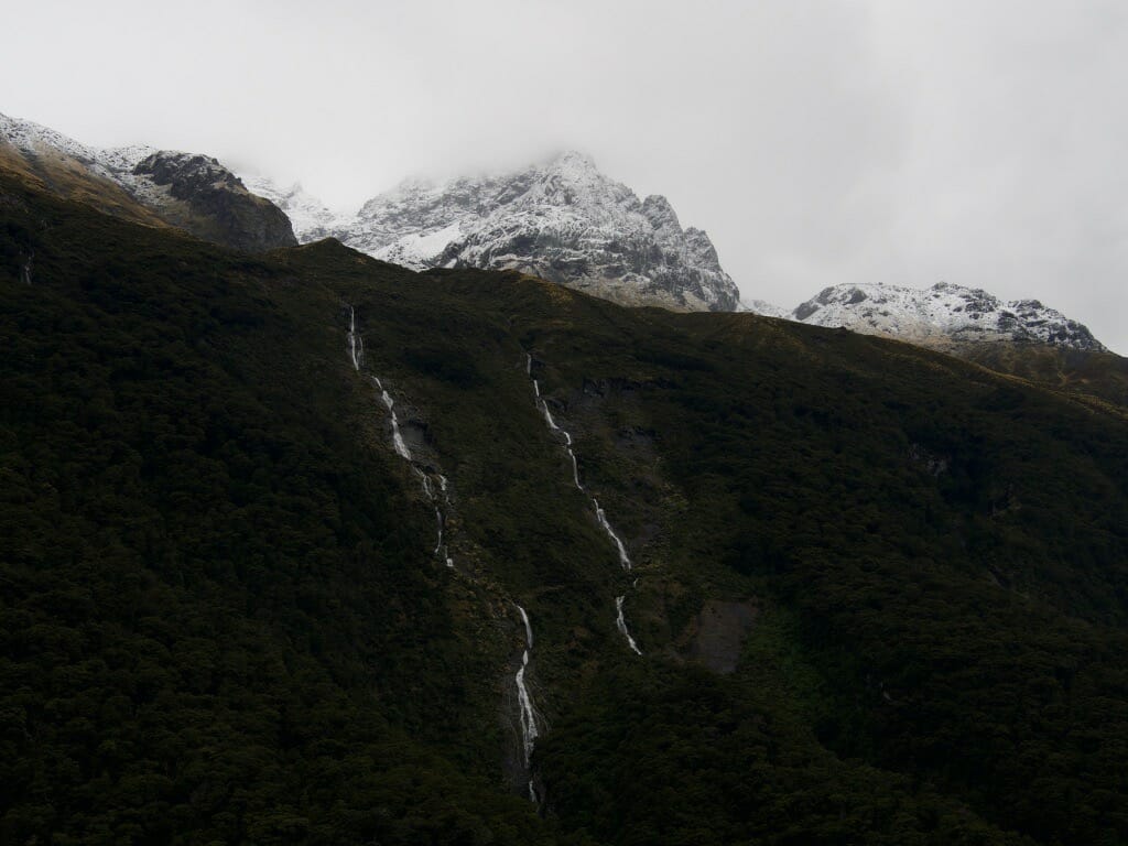 A short further descent brought us to the start of Pearl Flat, where we were surrounded by mountains and waterfalls. Through the clouds, we could glimpse the Liverpool and French Ridge huts. Destinations, perhaps, for a future trip.