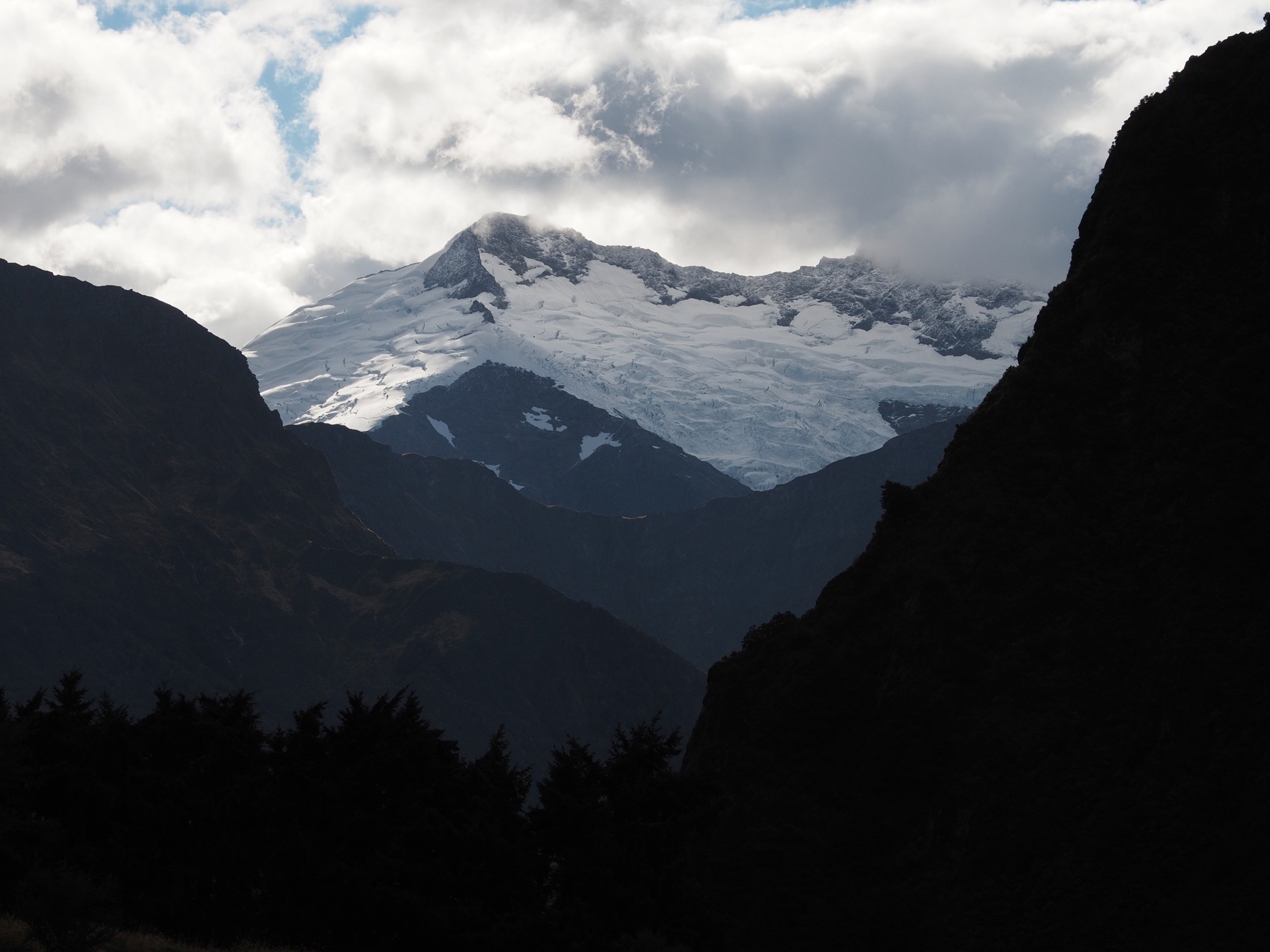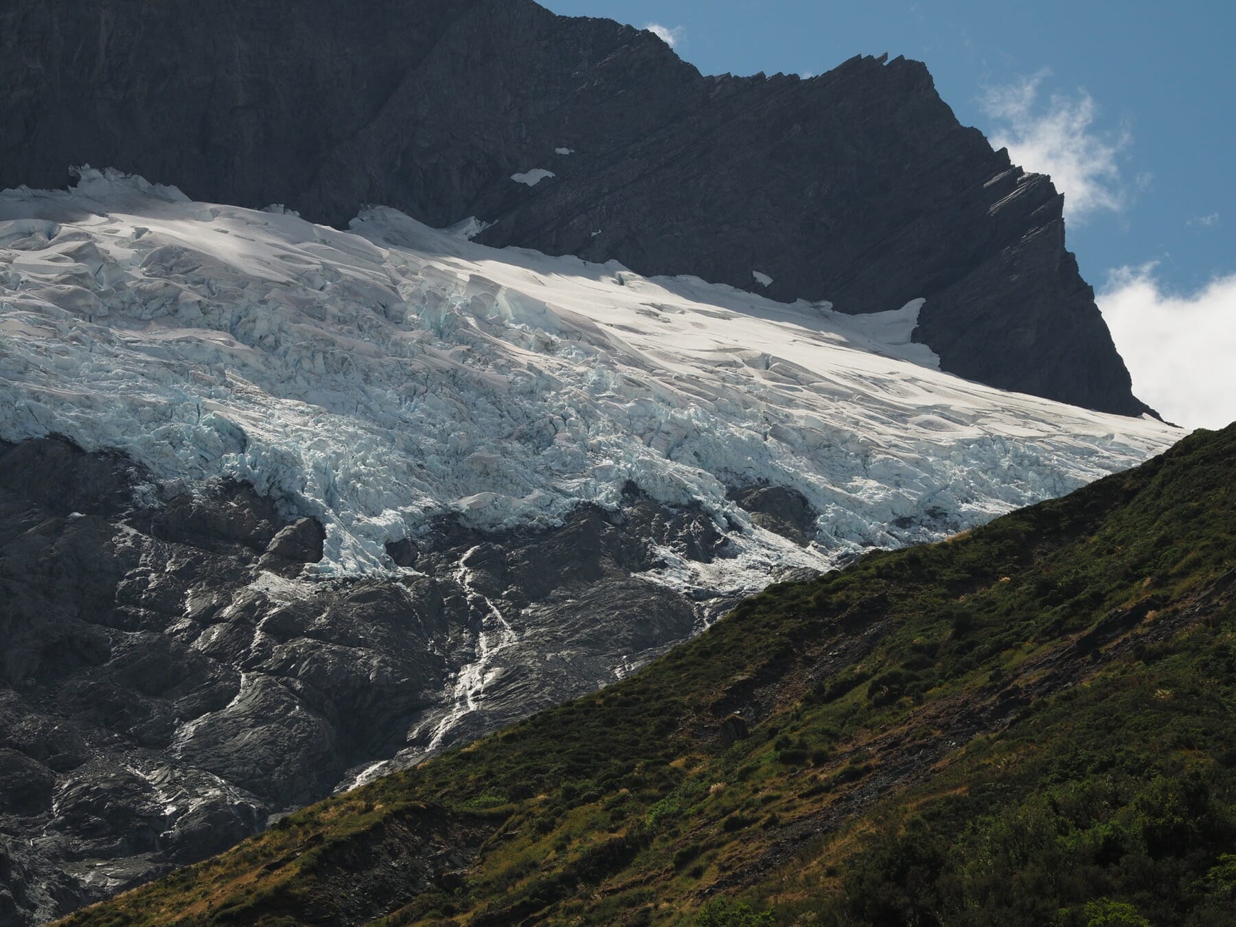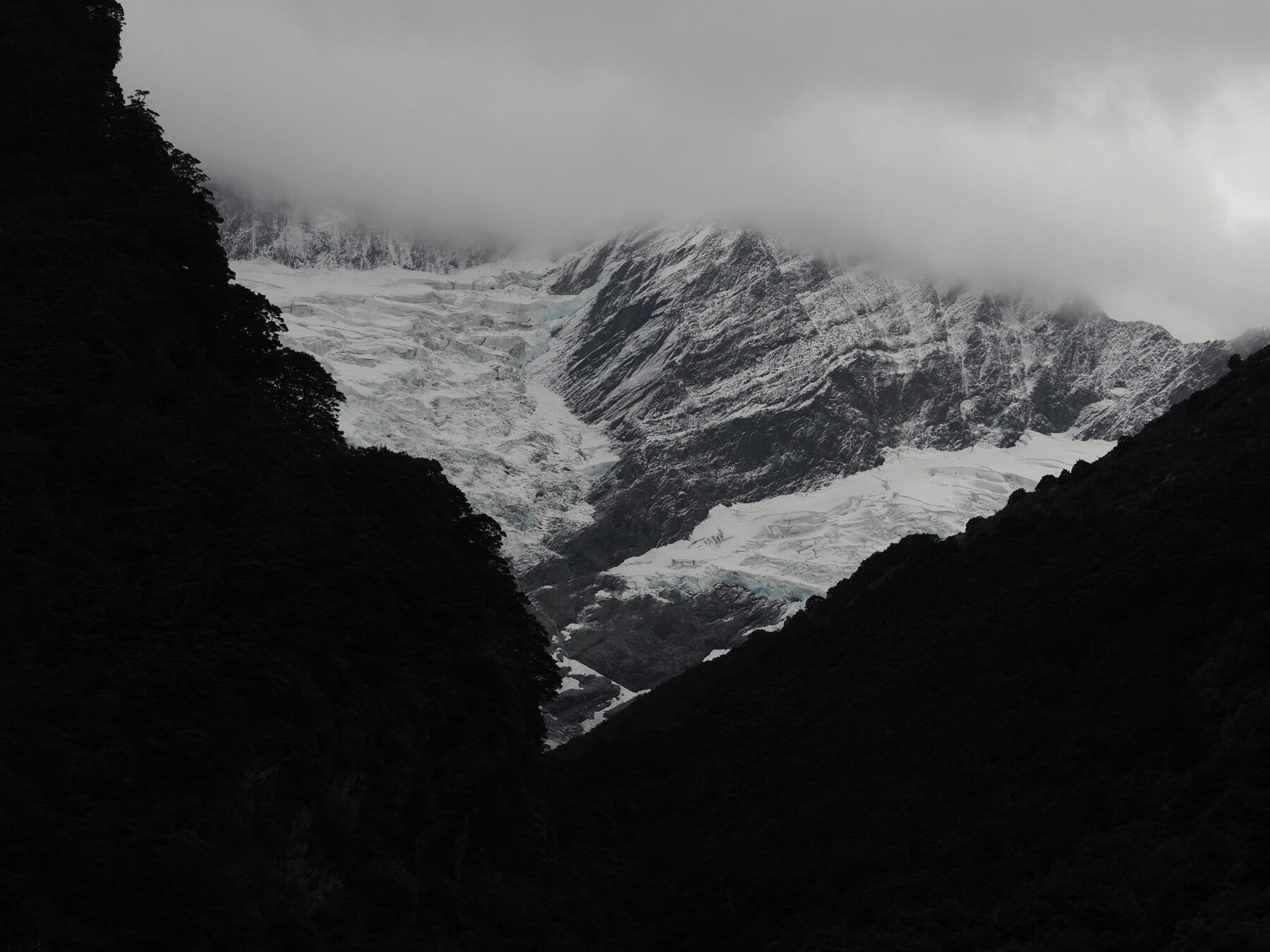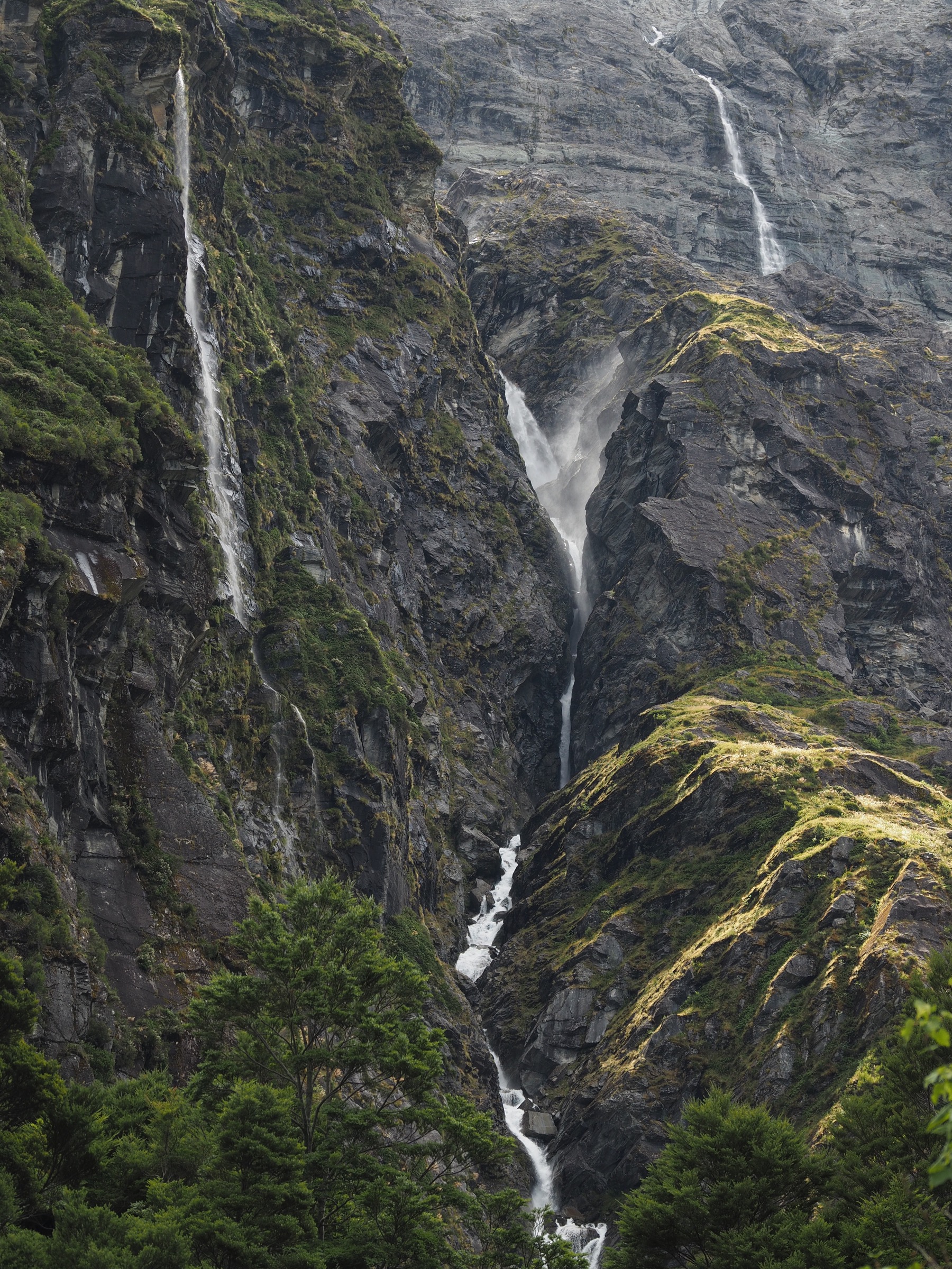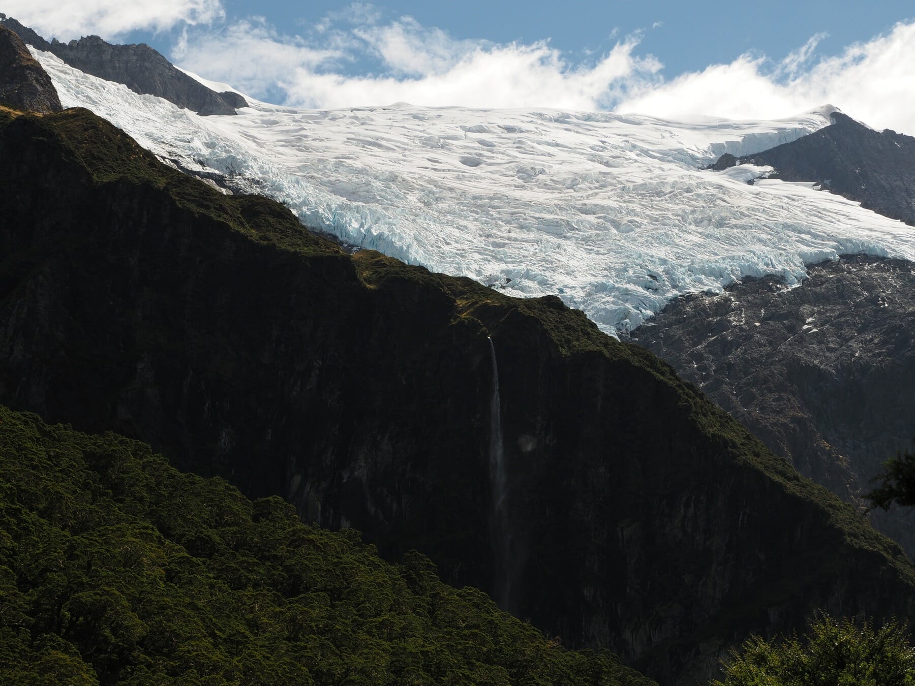 A short further descent brought us to the start of Pearl Flat, where we were surrounded by mountains and waterfalls. Through the clouds, we could glimpse the Liverpool and French Ridge huts. Destinations, perhaps, for a future trip.
