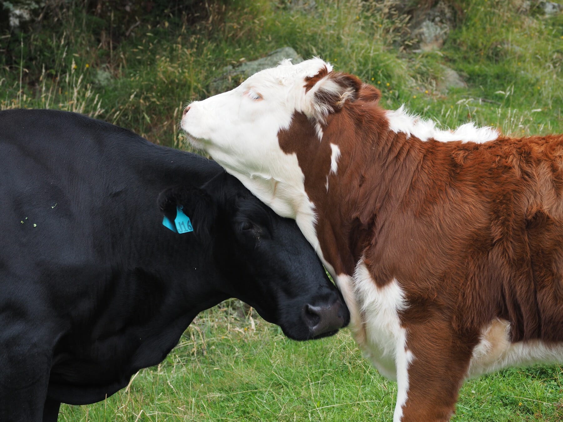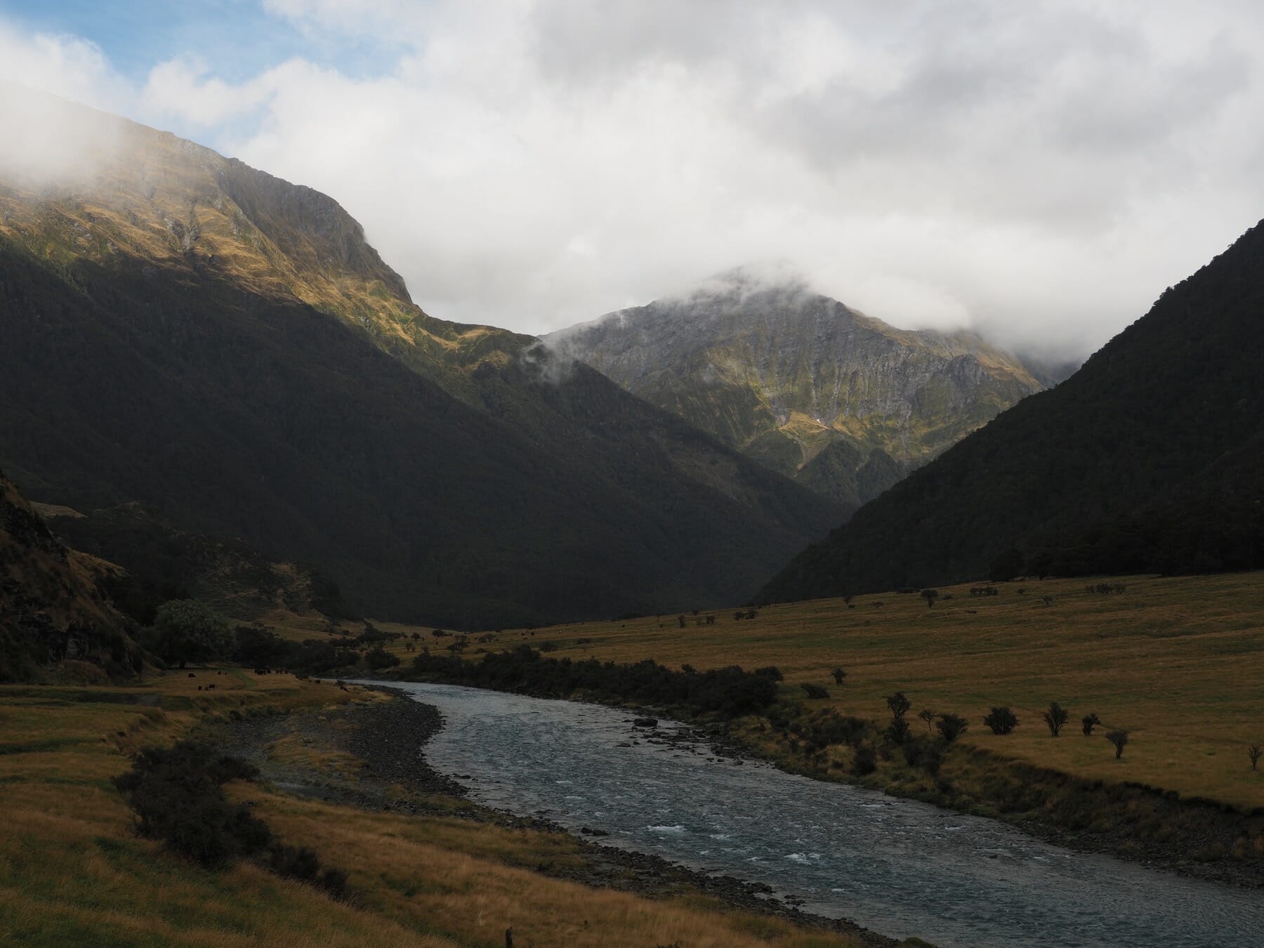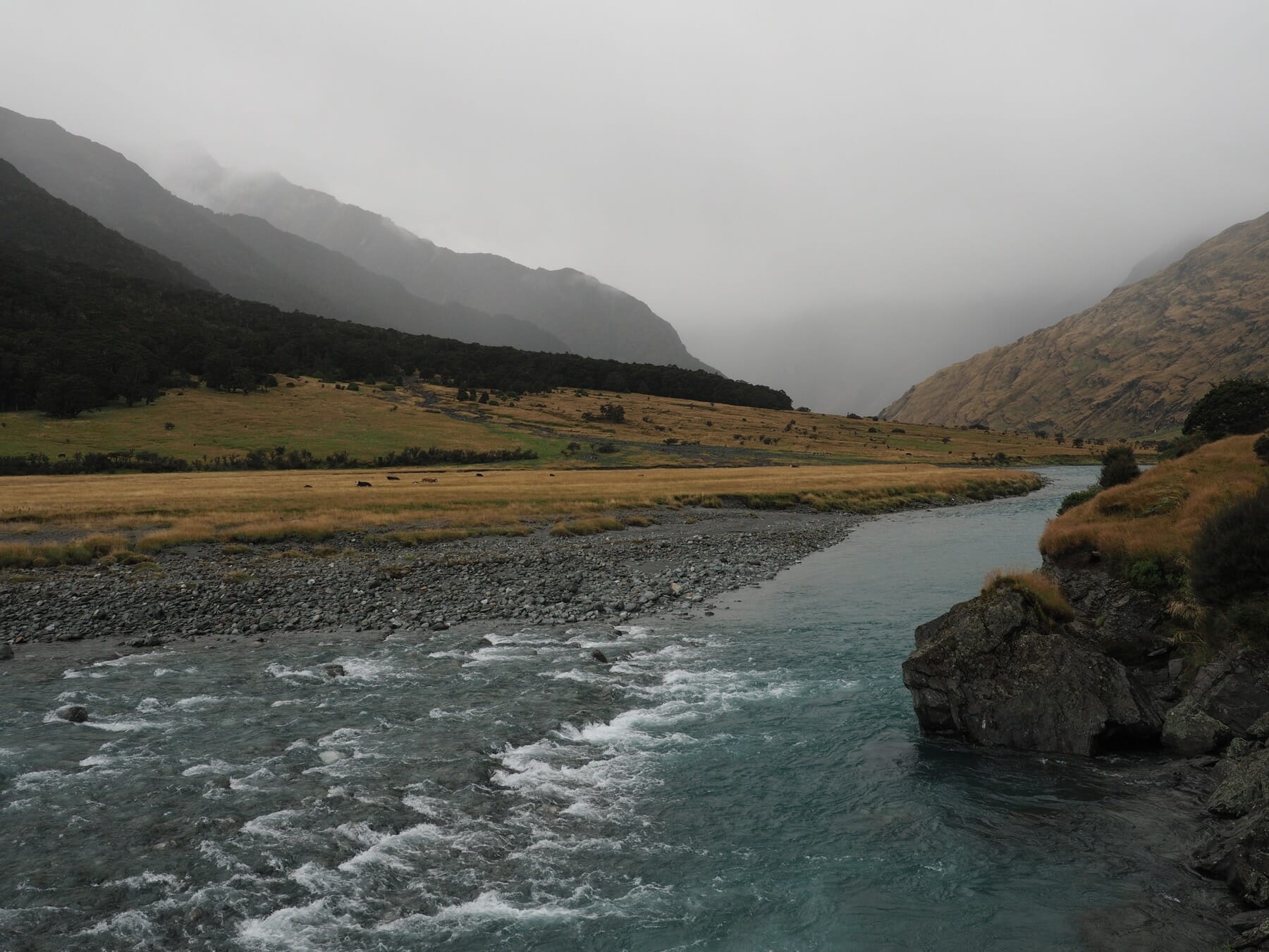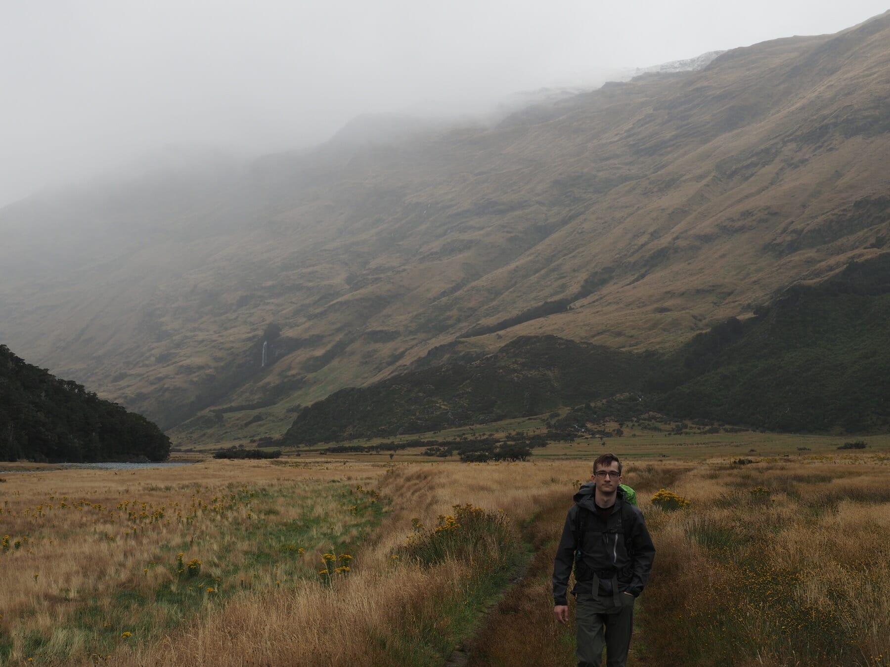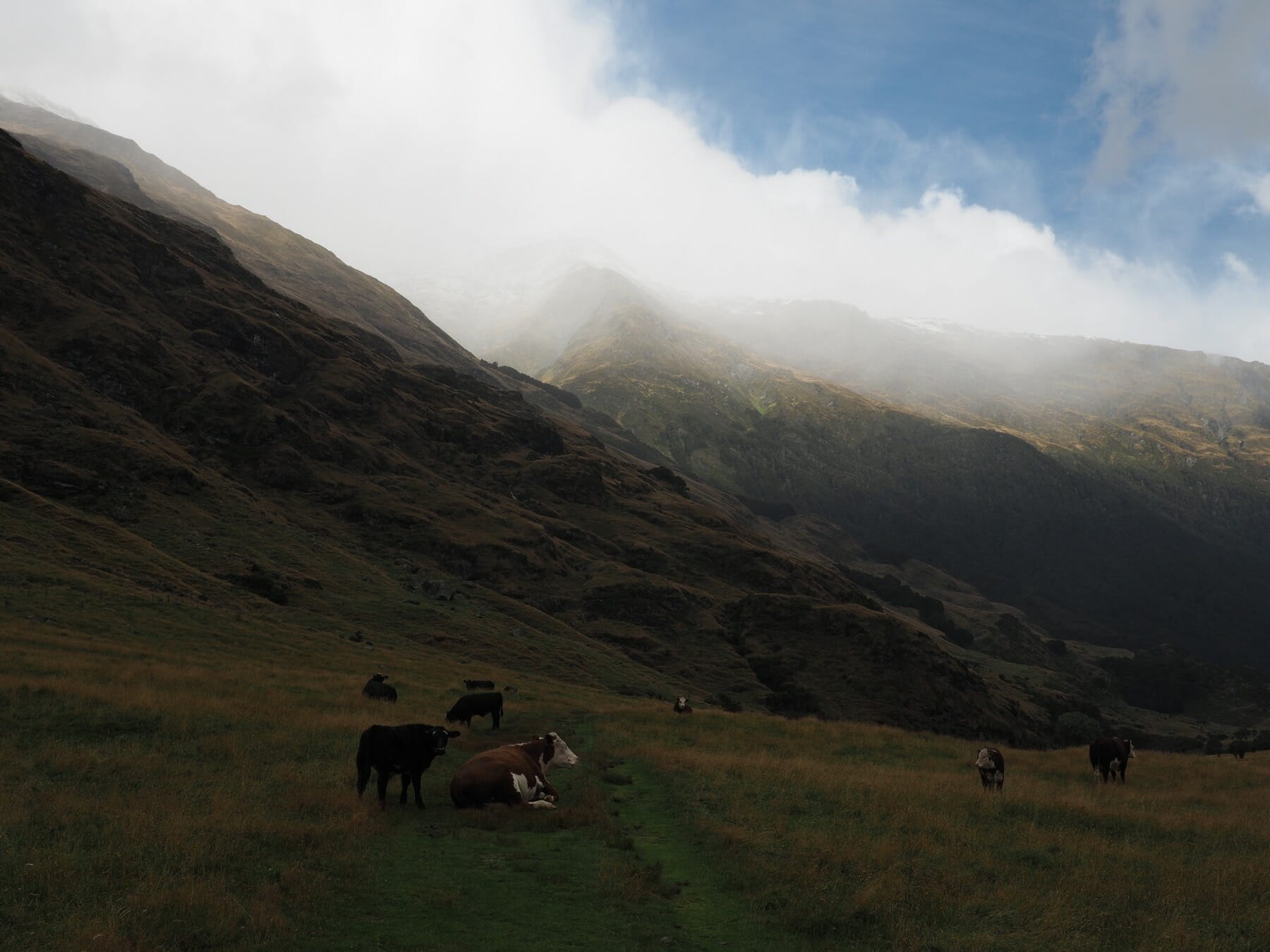 The track followed the West Matukituki river, at times close to it, at times up above it, and at times further from it across flats and fields. Much of the route was along an ATV track, which made for easy walking aside from some mud. We also met local cows. Because the initial part of the trail was on grazing land, we generally had good views of the valley, though peaks were obscured by clouds. The rain persisted in the form of light showers.