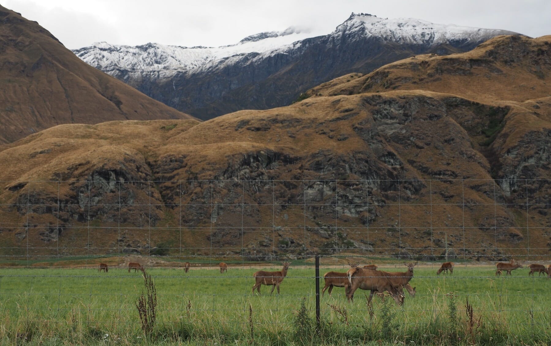 For our hike, we chose the Rob Roy Glacier Track, about 10km (6 miles) round trip. The drive to the Raspberry Flat trailhead provided many opportunities to enjoy the scenery. In addition to the expected herds of sheep, we were surprised to see large herds of domesticated deer. For two people used to seeing deer individually or in small groups in the woods, seeing large numbers of them just grazing made for a curious sight.