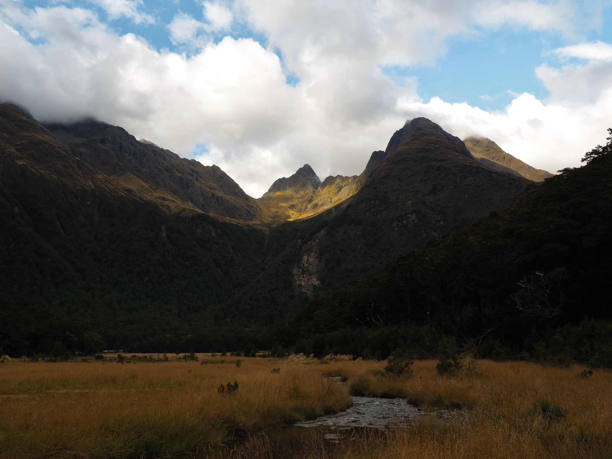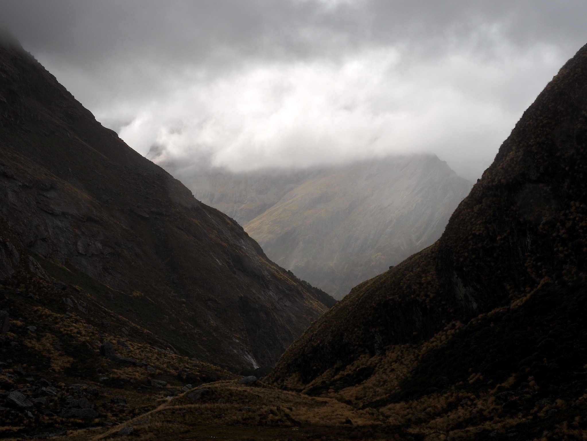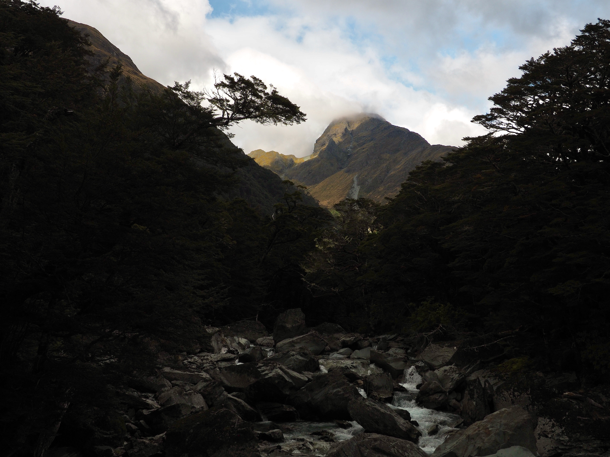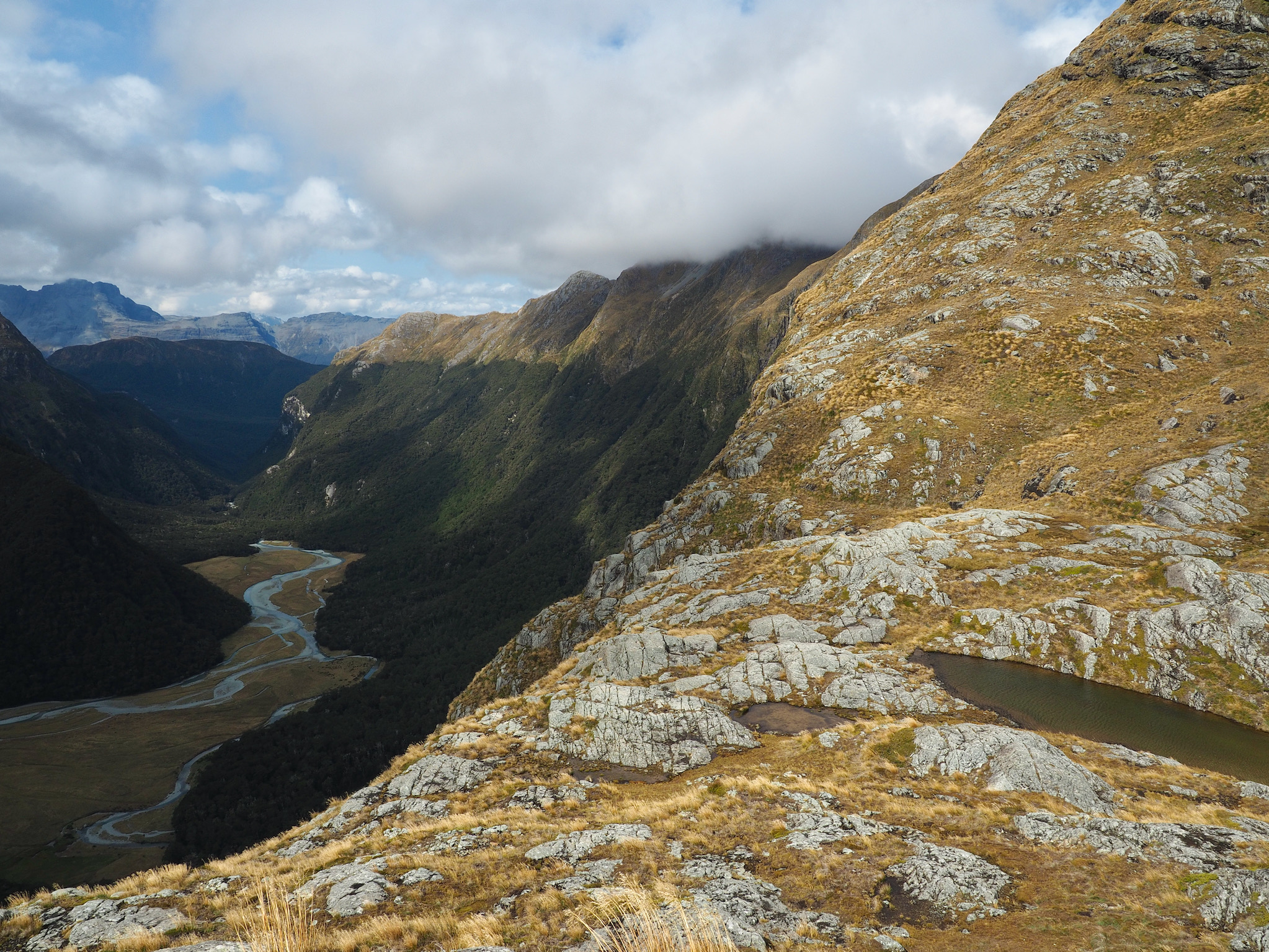 After we warmed up, we started to see patches of blue sky. We did not want to let this opportunity go to waste, and so we hiked back up the valley, retracing some of our steps from earlier in the day. After climbing a bit, we could see that the clearing did not extend back to Harris Saddle or Harris Lake–they were still clouded in–and so we instead set about finding a vantage point back down the Route Burn valley.